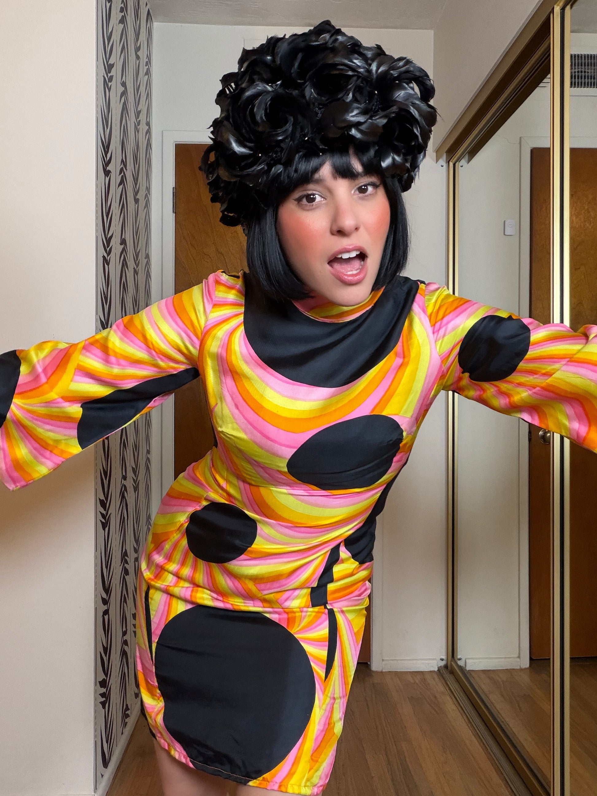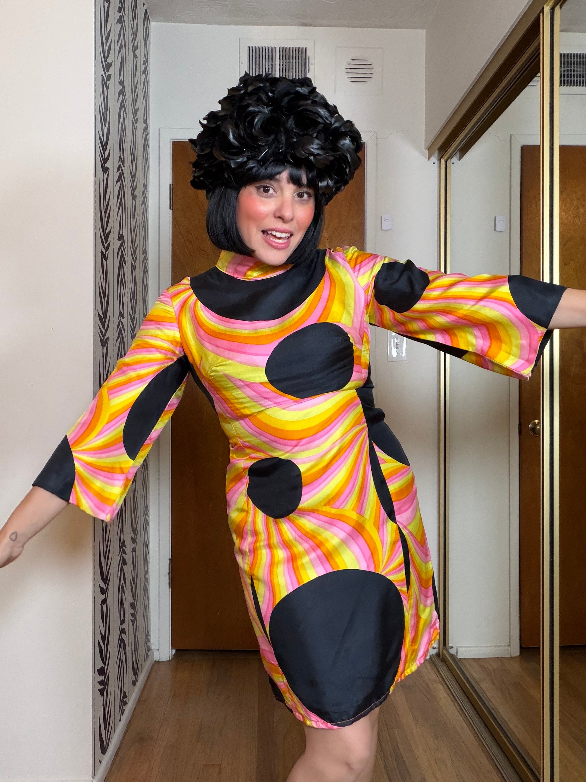 60s Black Silk Polkadot Psychedelic Mini Dress Fits XS-SM