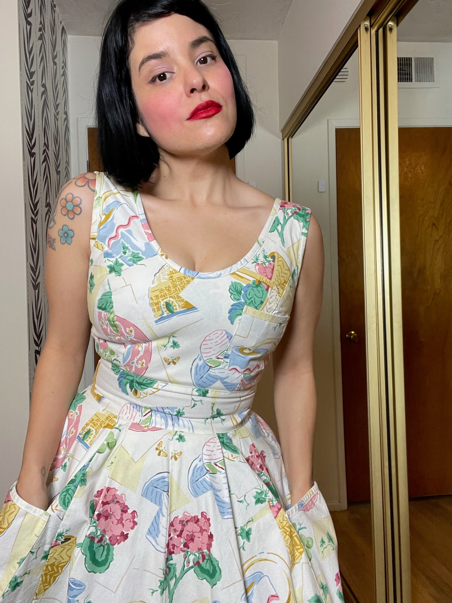 Dress Features: Cotton Material / Attached Brand Label / Novelty Picnic Print / Two Large Front Pockets / Straps Unbutton In The Back And Can Be Criss Crossed / Back Zipper / Full Skirt