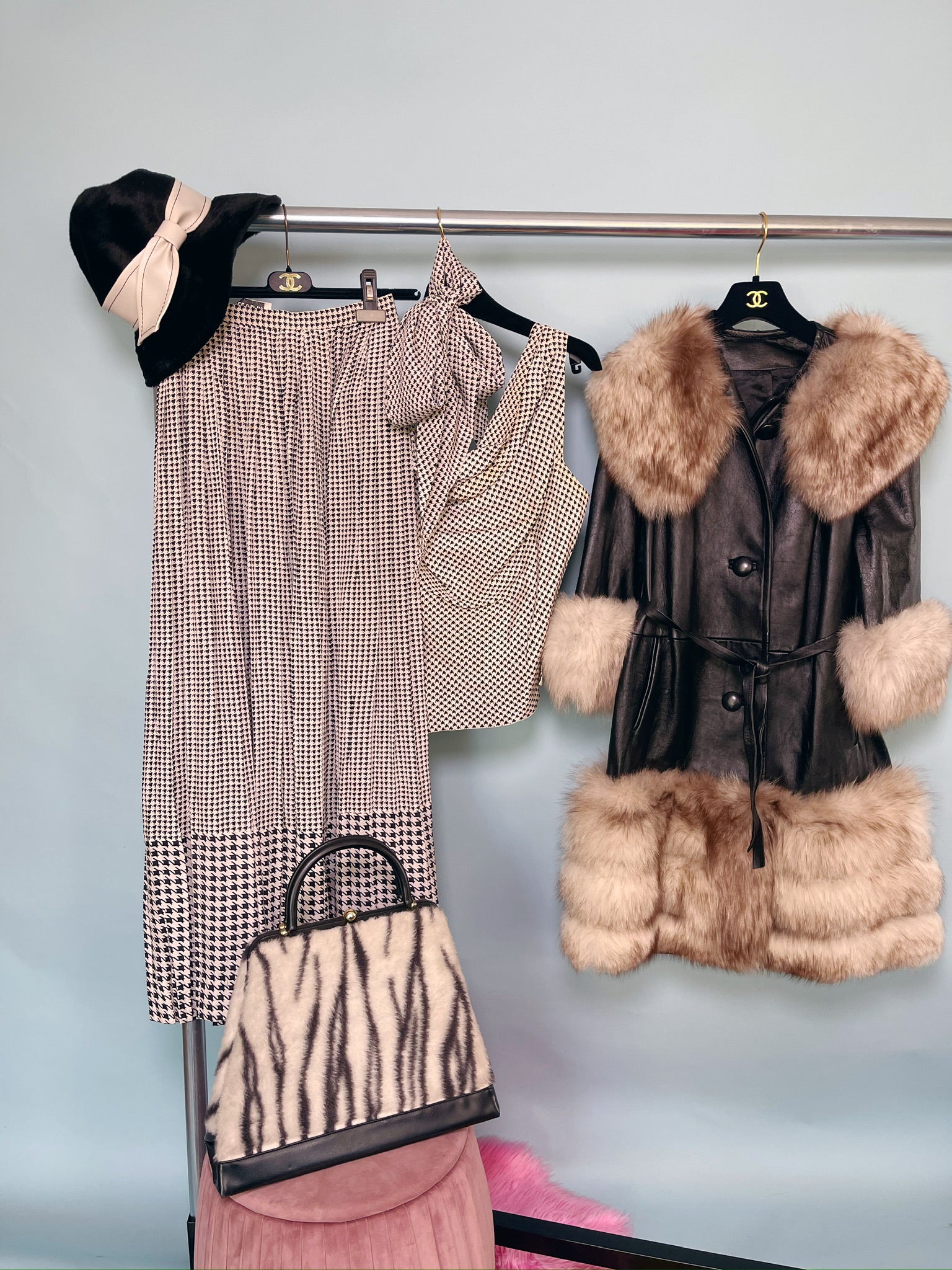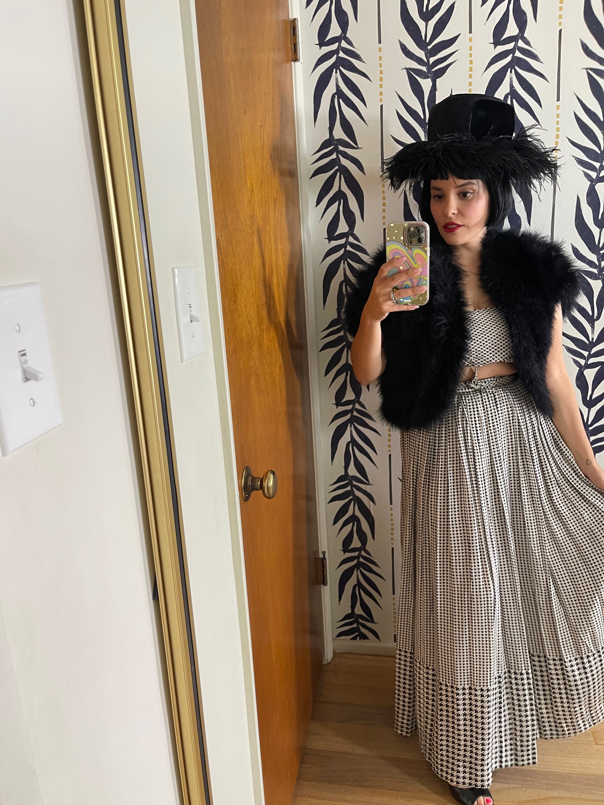 Late 70s "Bill Blass" Black & White Silk Houndstooth Three Piece Top Skirt Belt Set XS-SM