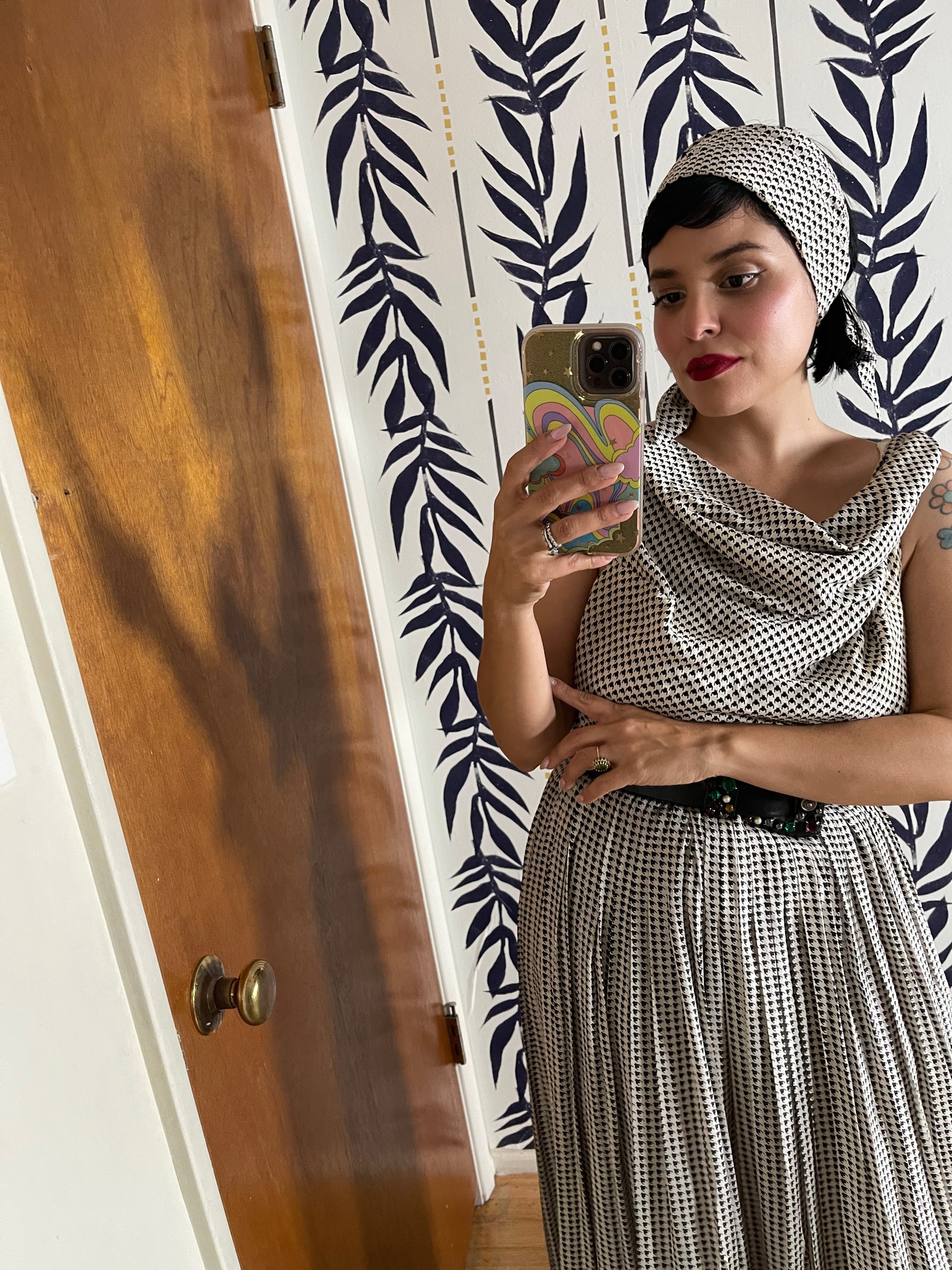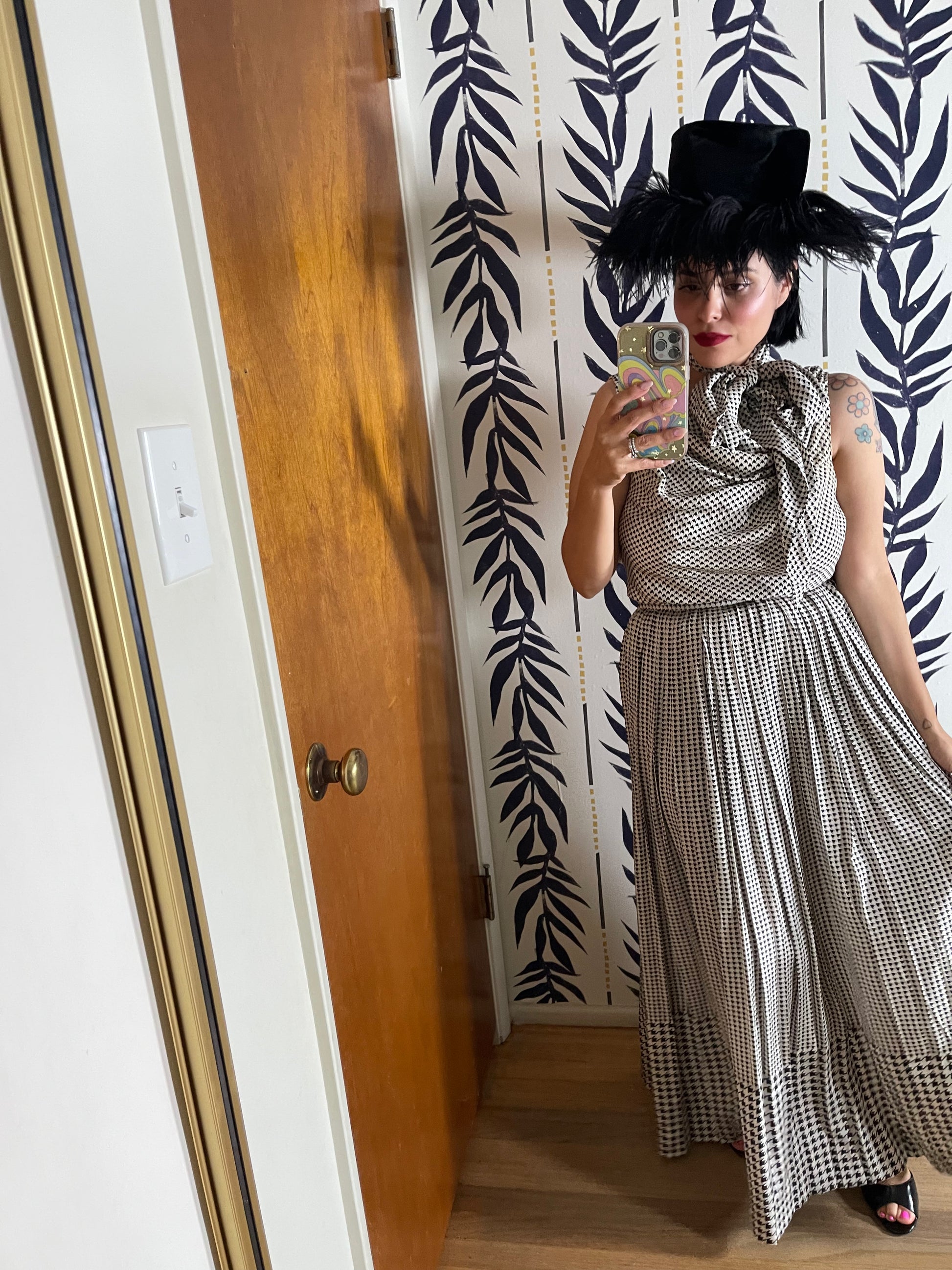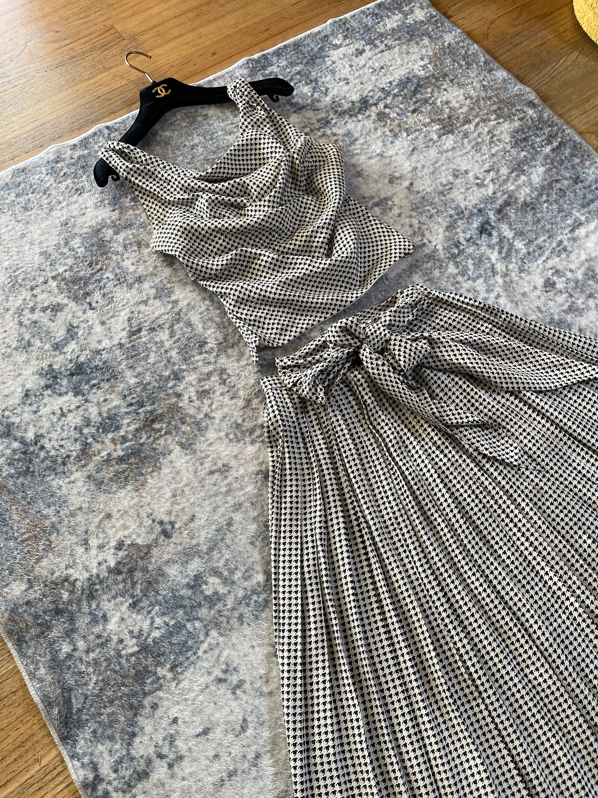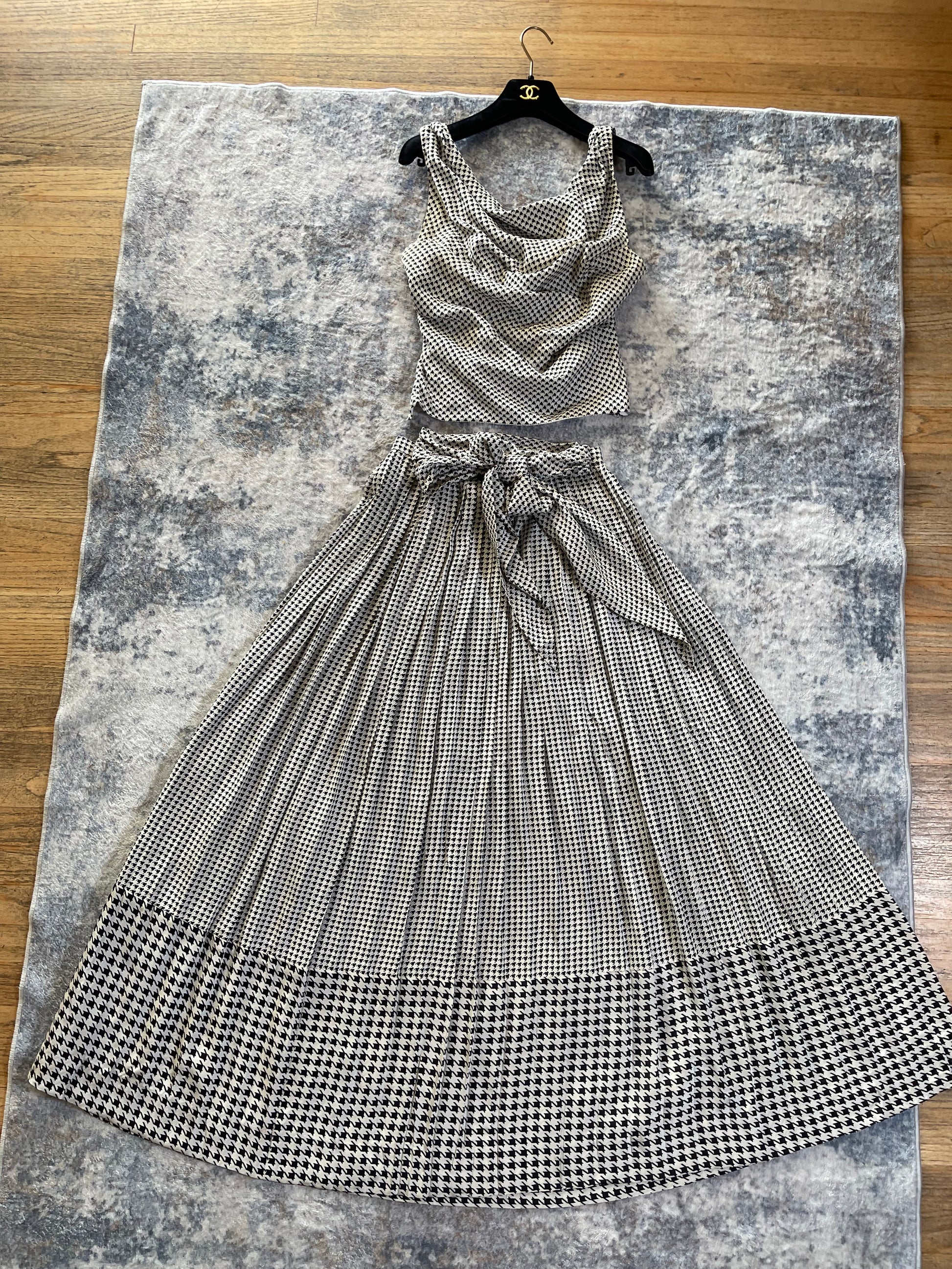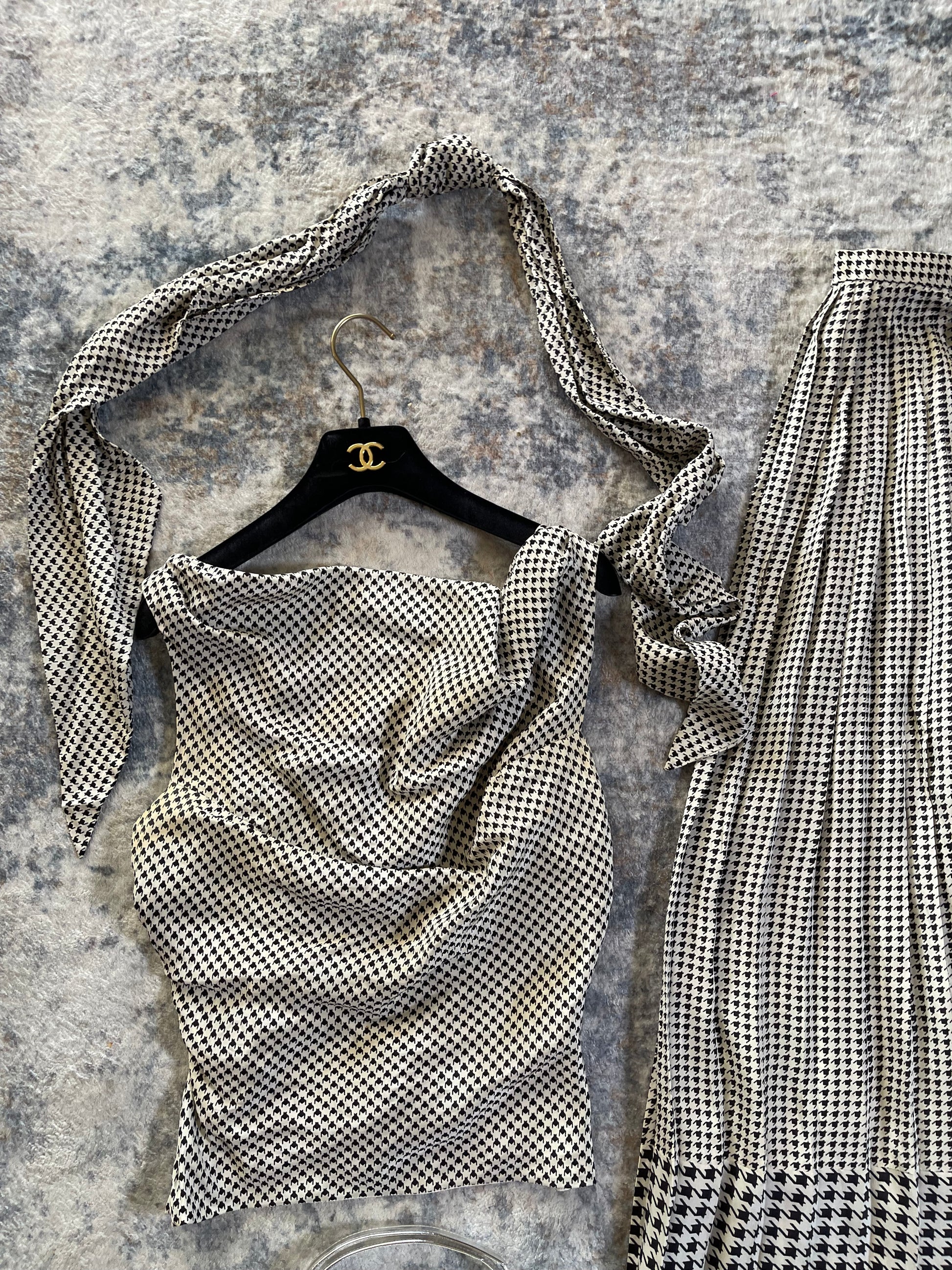 Late 70s "Bill Blass" Black & White Silk Cowl Neckline Houndstooth Three Piece Top Skirt Belt Set XS-SM