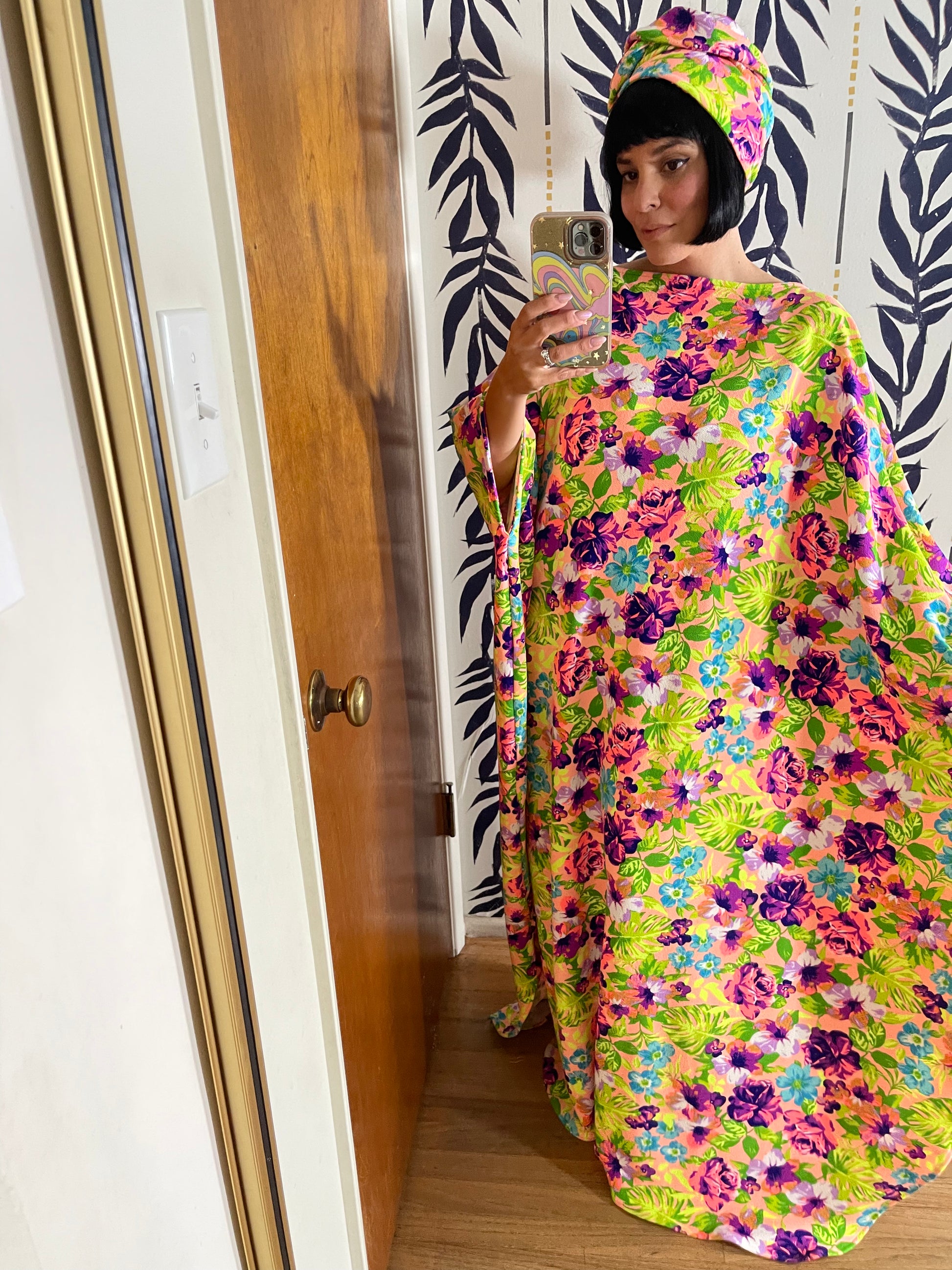 Modern Neon "Julia Clancey" Floral DayGlo Caftan Dress Fits Most Sizes Comes w/ Turban