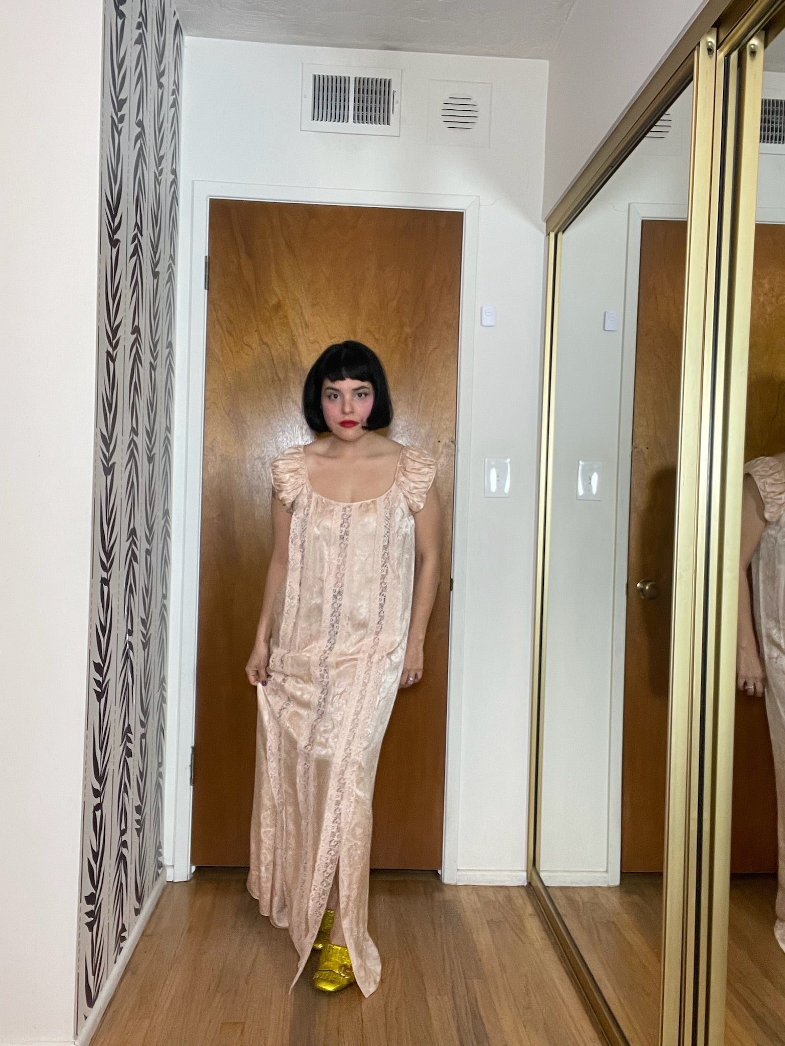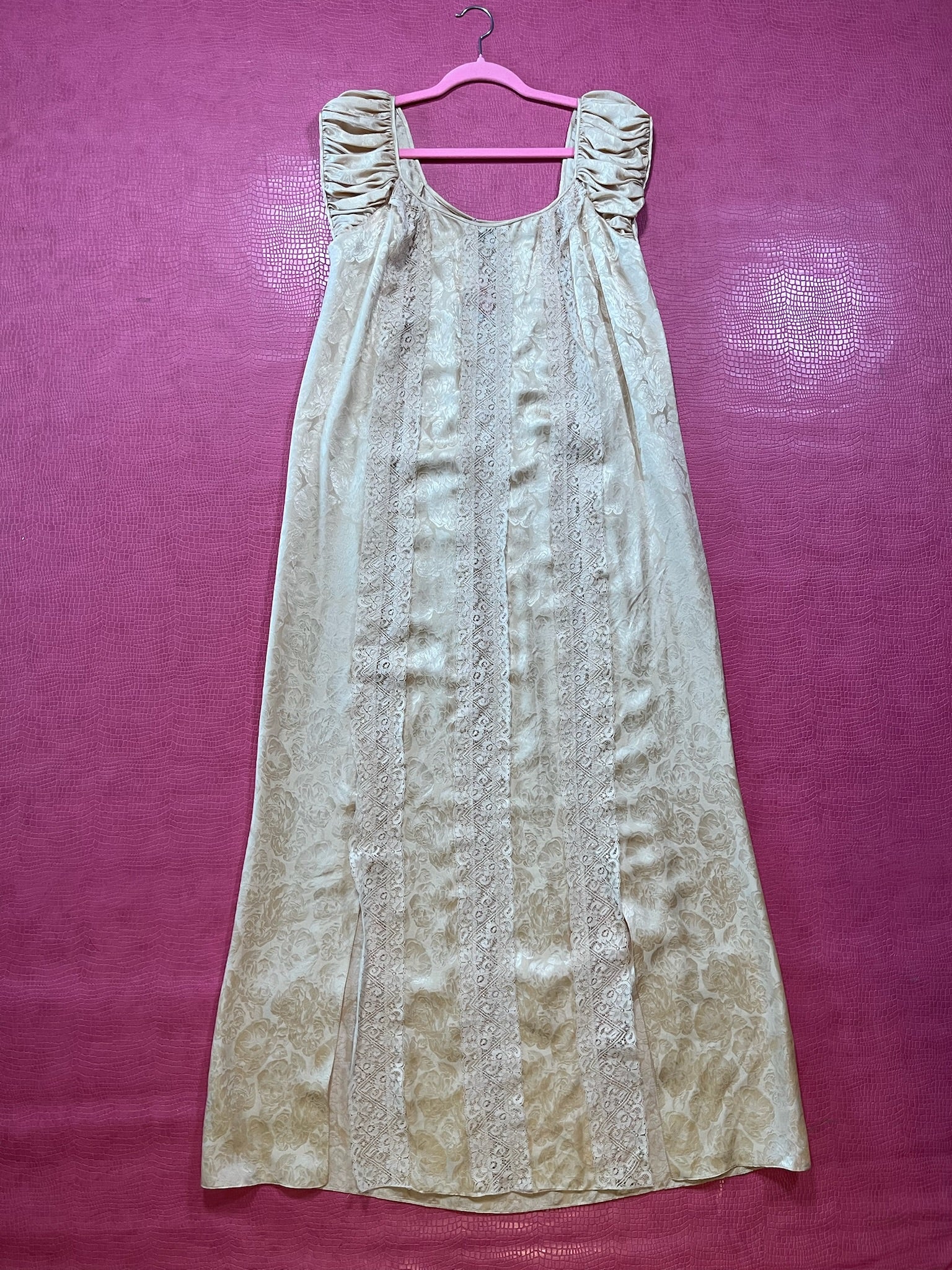 Features: Silk Material / Trapeze fit / Cap Sleeves / Lace details / Attached Brand Label / Soft Pink Color / Front Slits / Antique Piece / Fits A Range Of Sizes / Pull-over Style Dress
