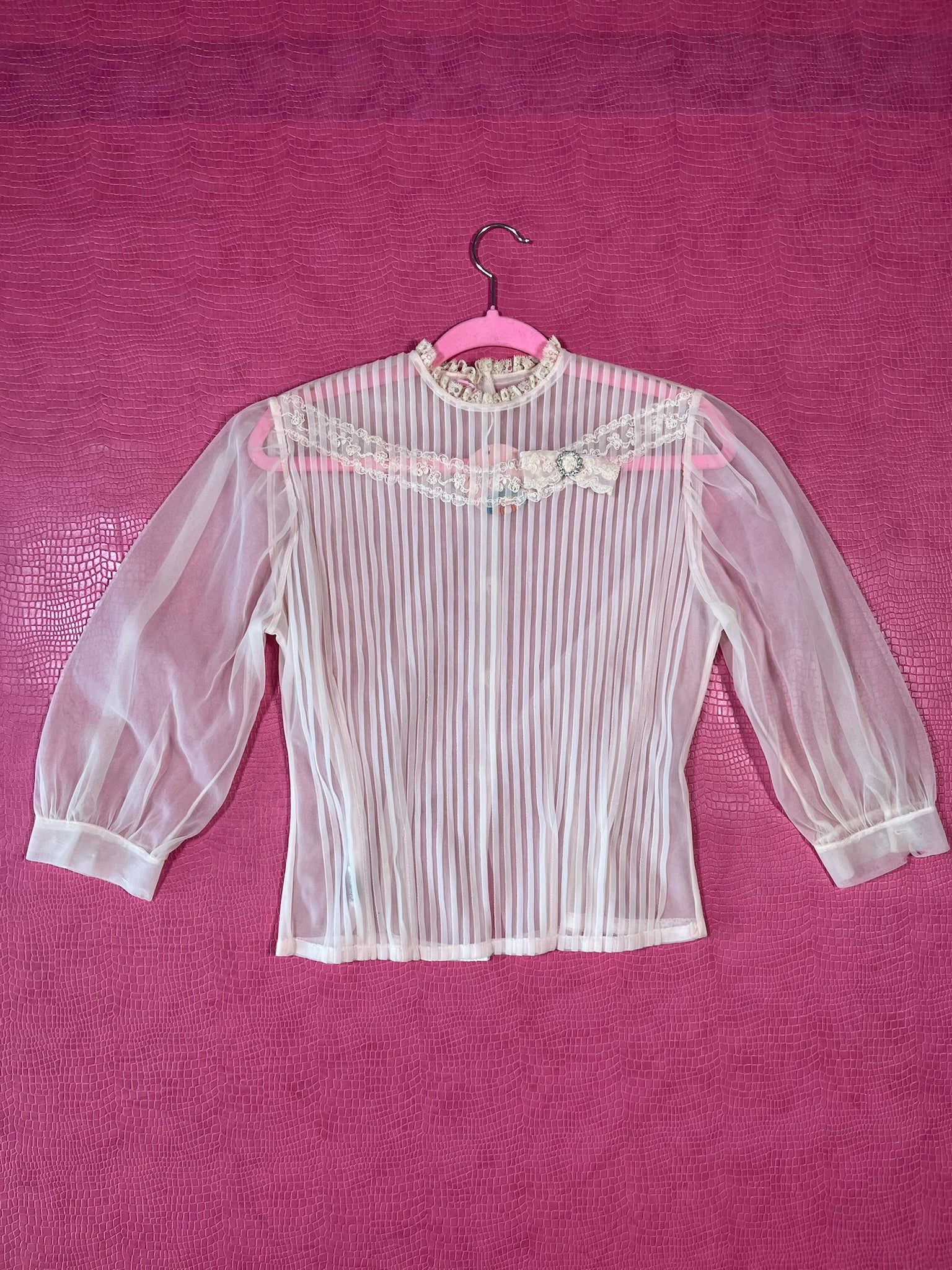 Features: Sheer Nylon Material / Pale Pink Color / Back Buttons / Decorative Front Rhinestone Bow Detail / Attached Brand Label