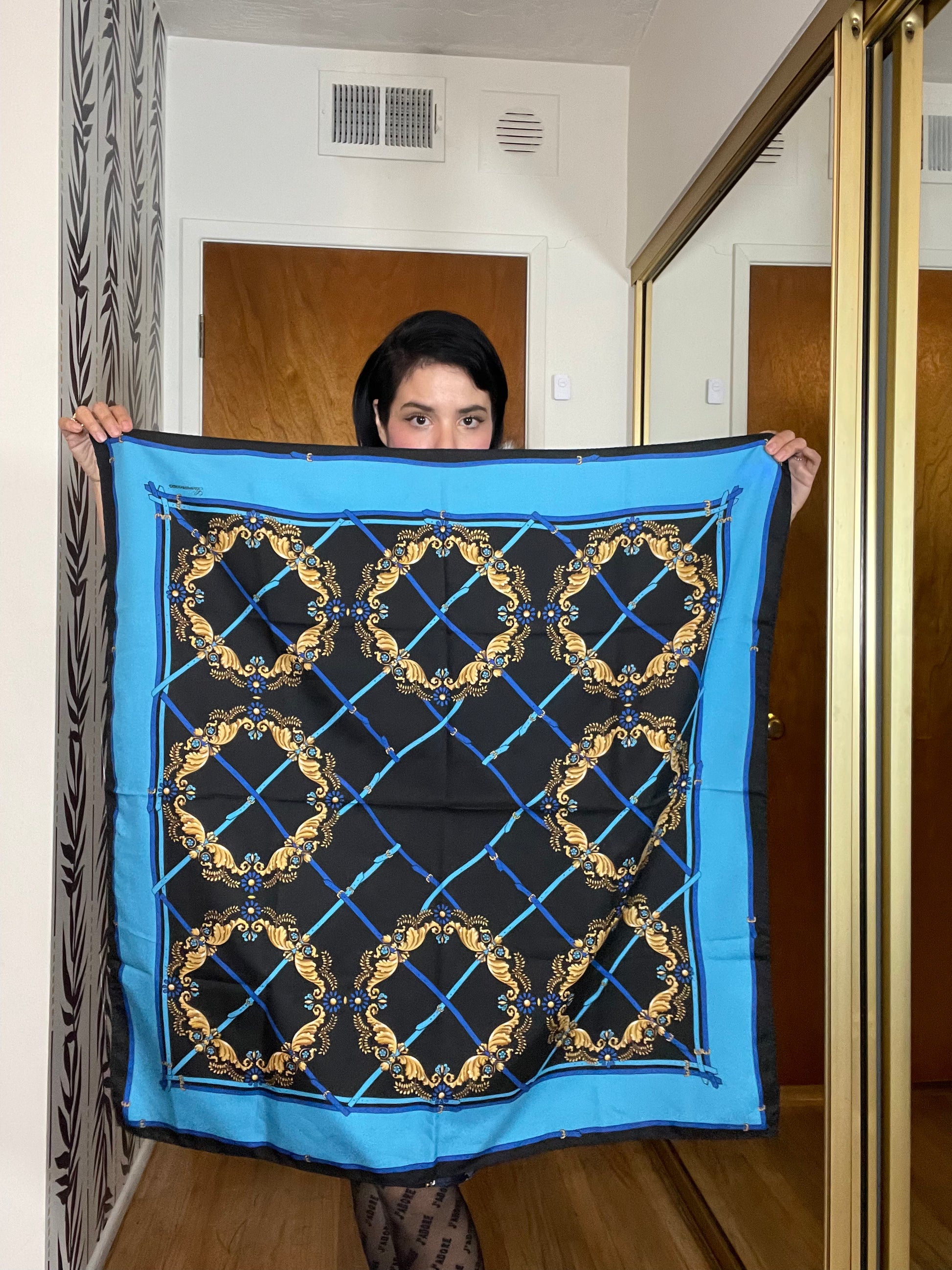 Features: Novelty Belt Print / Bold Blue Color / Silk Blend Material / Can Be Styled Multiple Ways