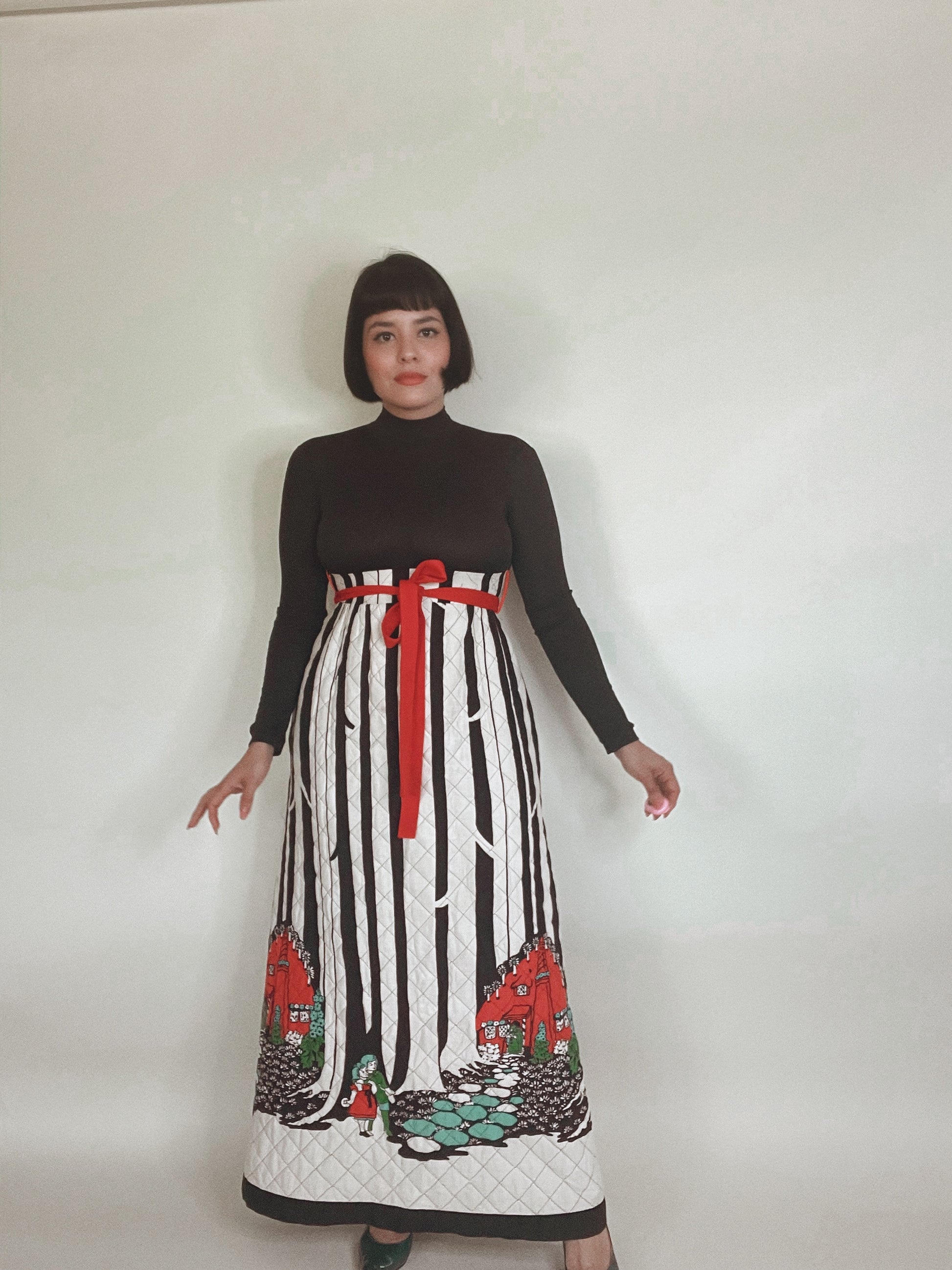 Features: stretchy bodice material/ long-sleeved black turtleneck / quilted a-line maxi skirt/ novelty print / red detachable belt
