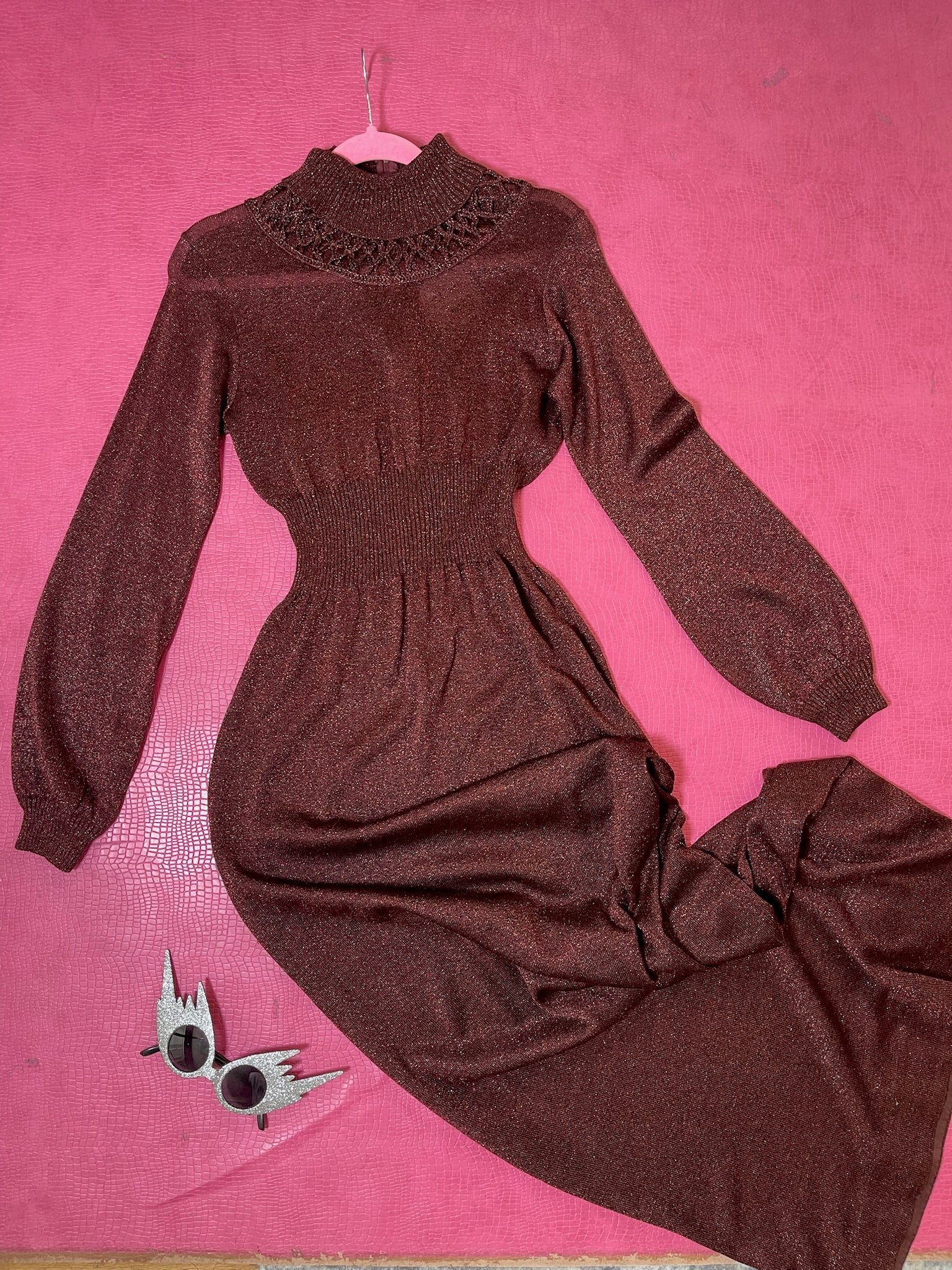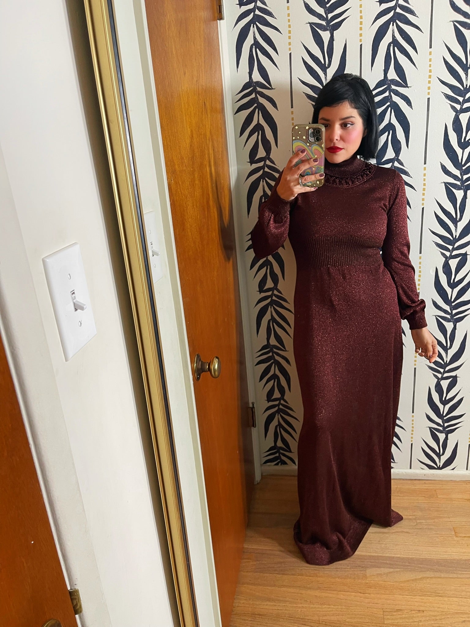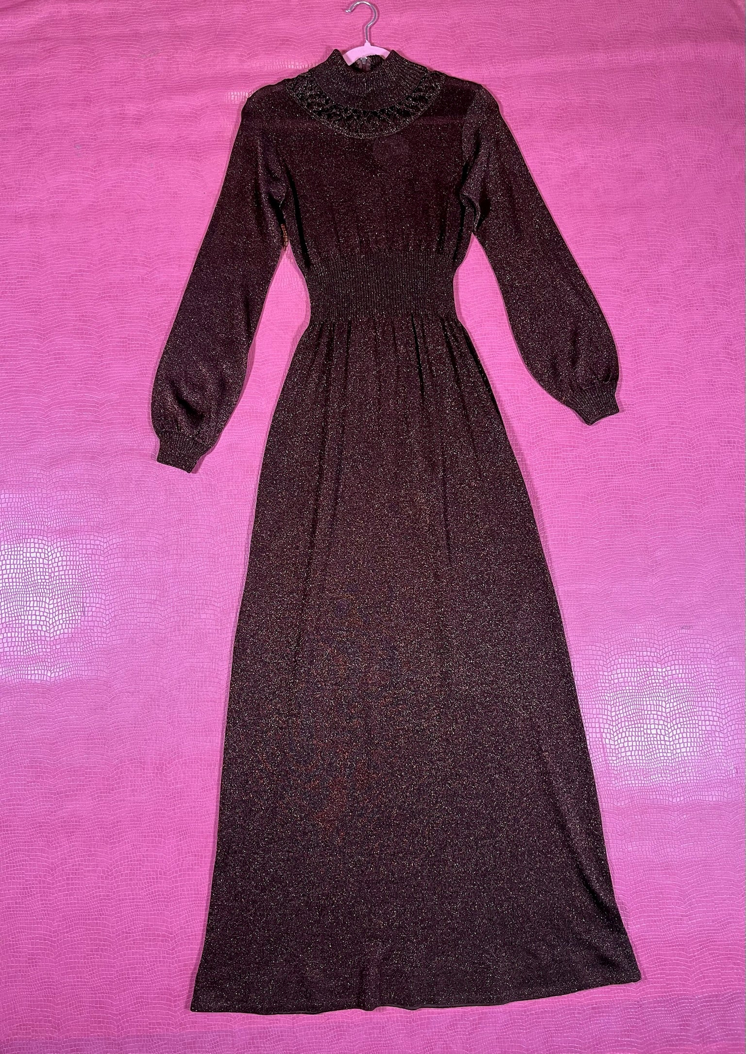 Vintage 60s 70s "Ruffians" Burgundy Glitter Knit Maxi Dress - Best Fits Size XS-L