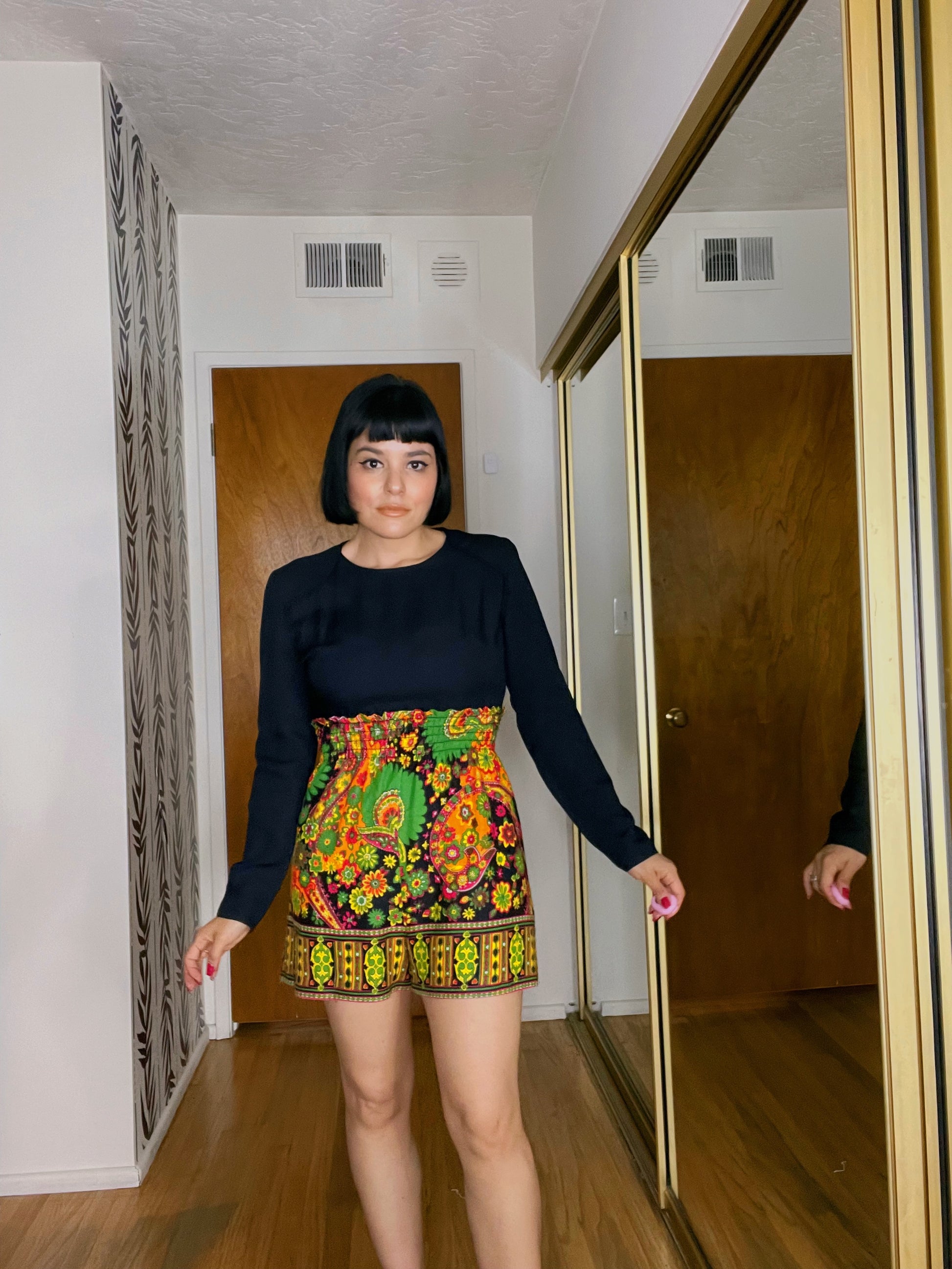 Vintage 60s / 70s Smock Waist Paisley Neon Print Romper with Matching Scarf Fits Sizes XS-SM