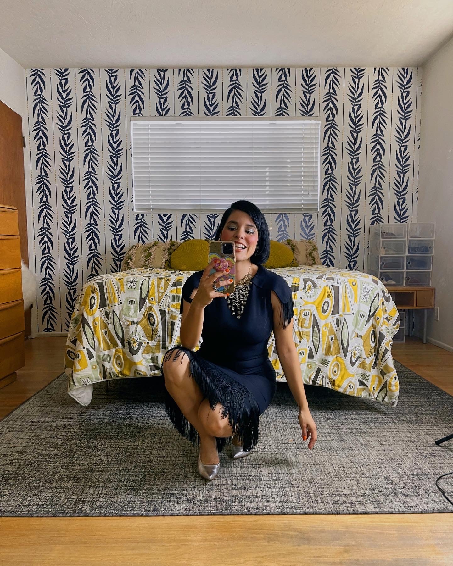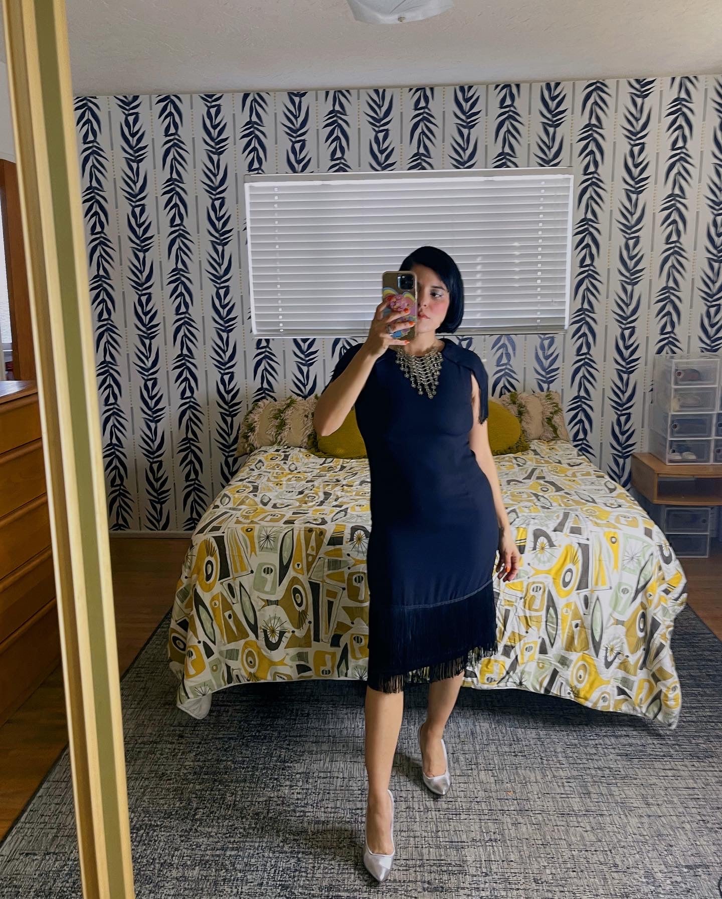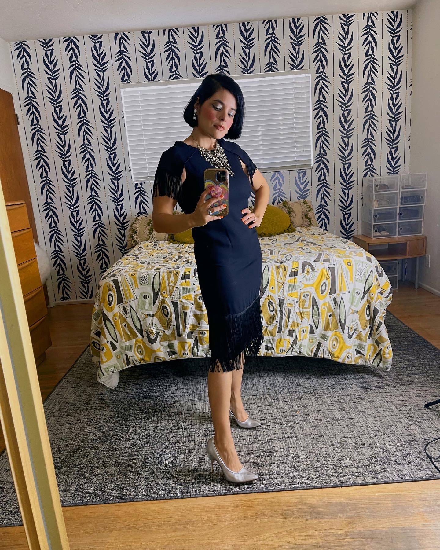 Vintage 60s Black Fringe Shoulders & Hemline Cha Cha Dress Fits Sizes XS-SM