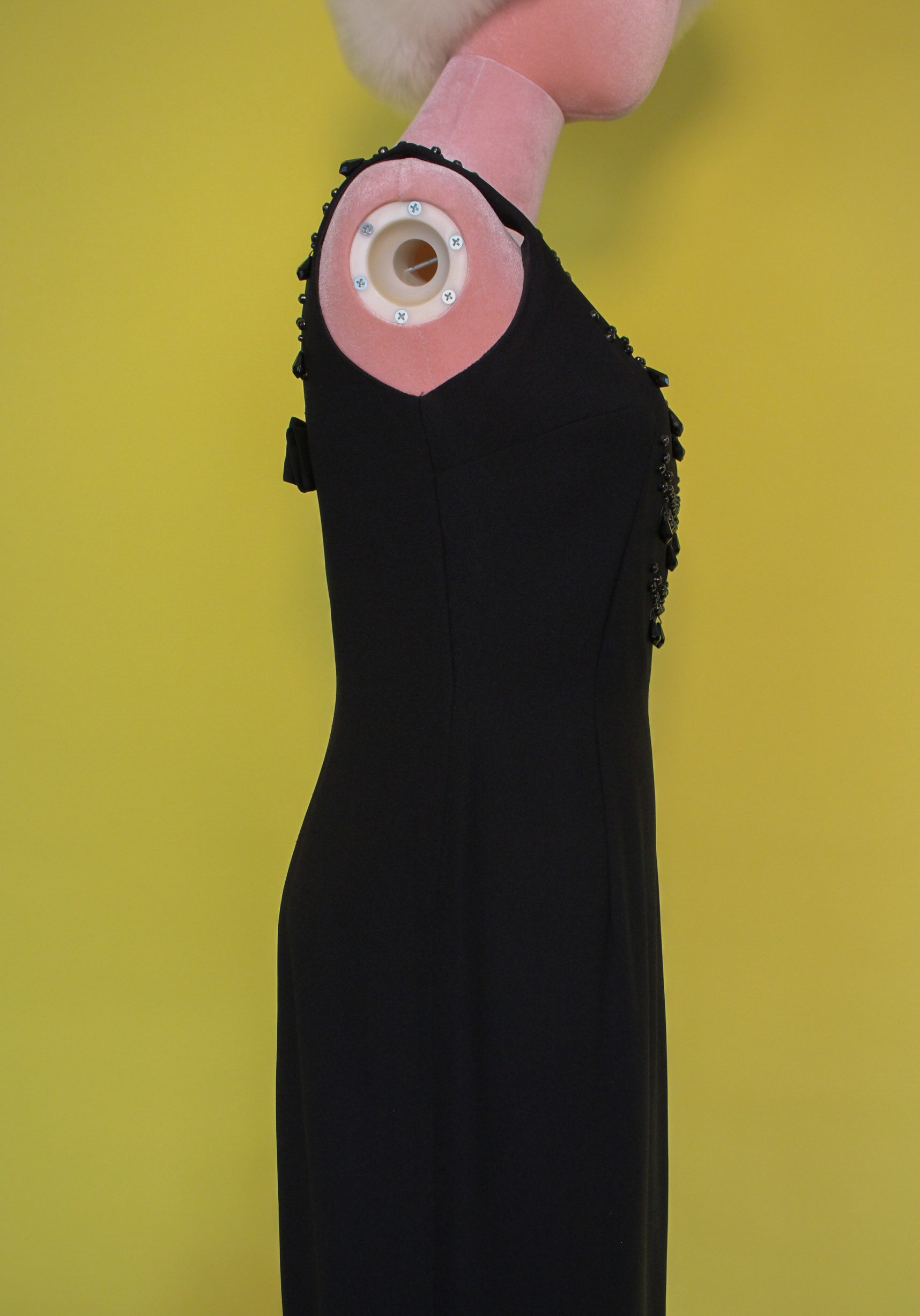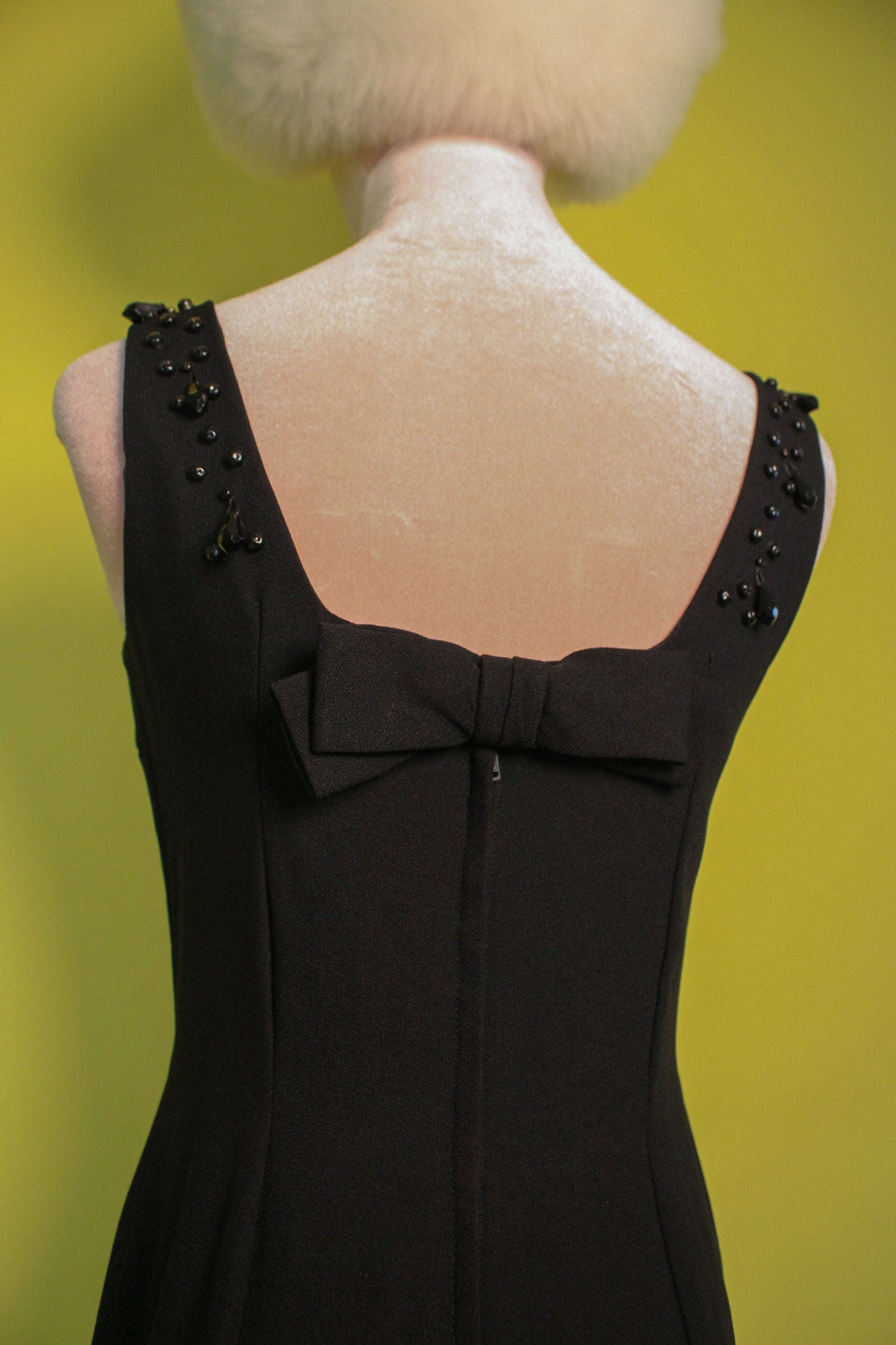 Features: Front Beaded and Embellished Bust / Back Metal Zipper / Back Bow Detail / Scoop Back / Elegant And Simple / Black Color / Rayon Cotton Blend Material And Acetate Lining / Best Fits Size S - Please Check Measurements