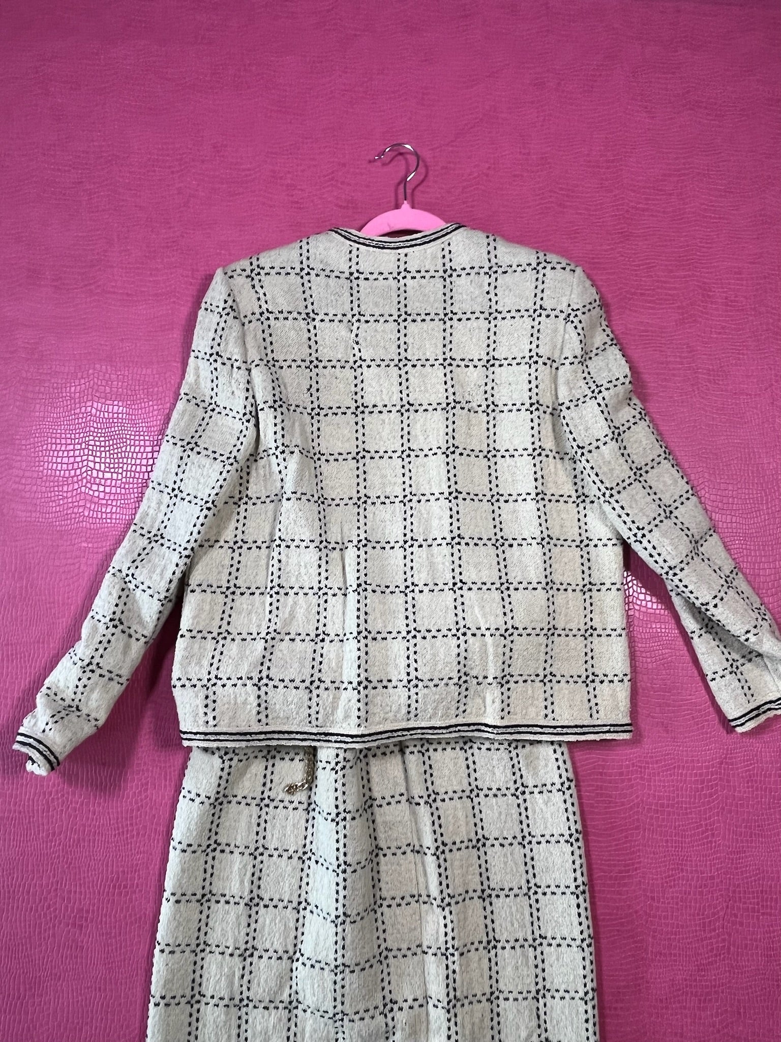 Features: Wool And Nylon Blend Material / Skirt And Jacket Match / Attached Brand Label / Skirt Waist Has Elastic / Jacket Has Front Button Closure / Detached Belt