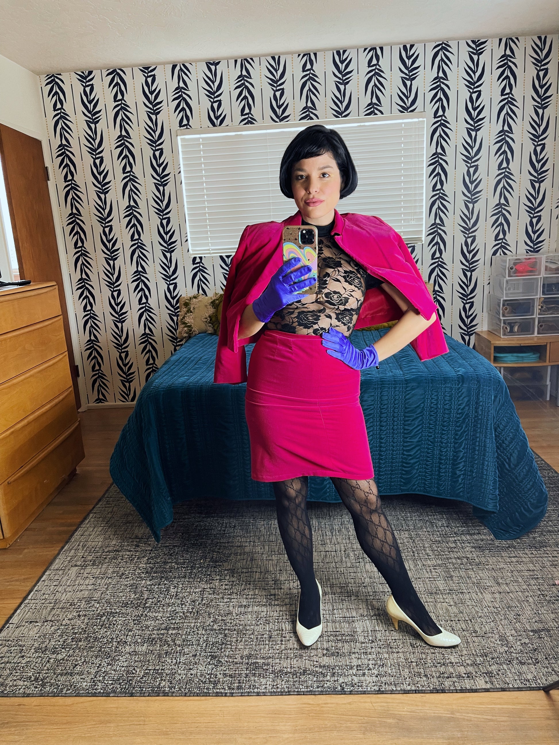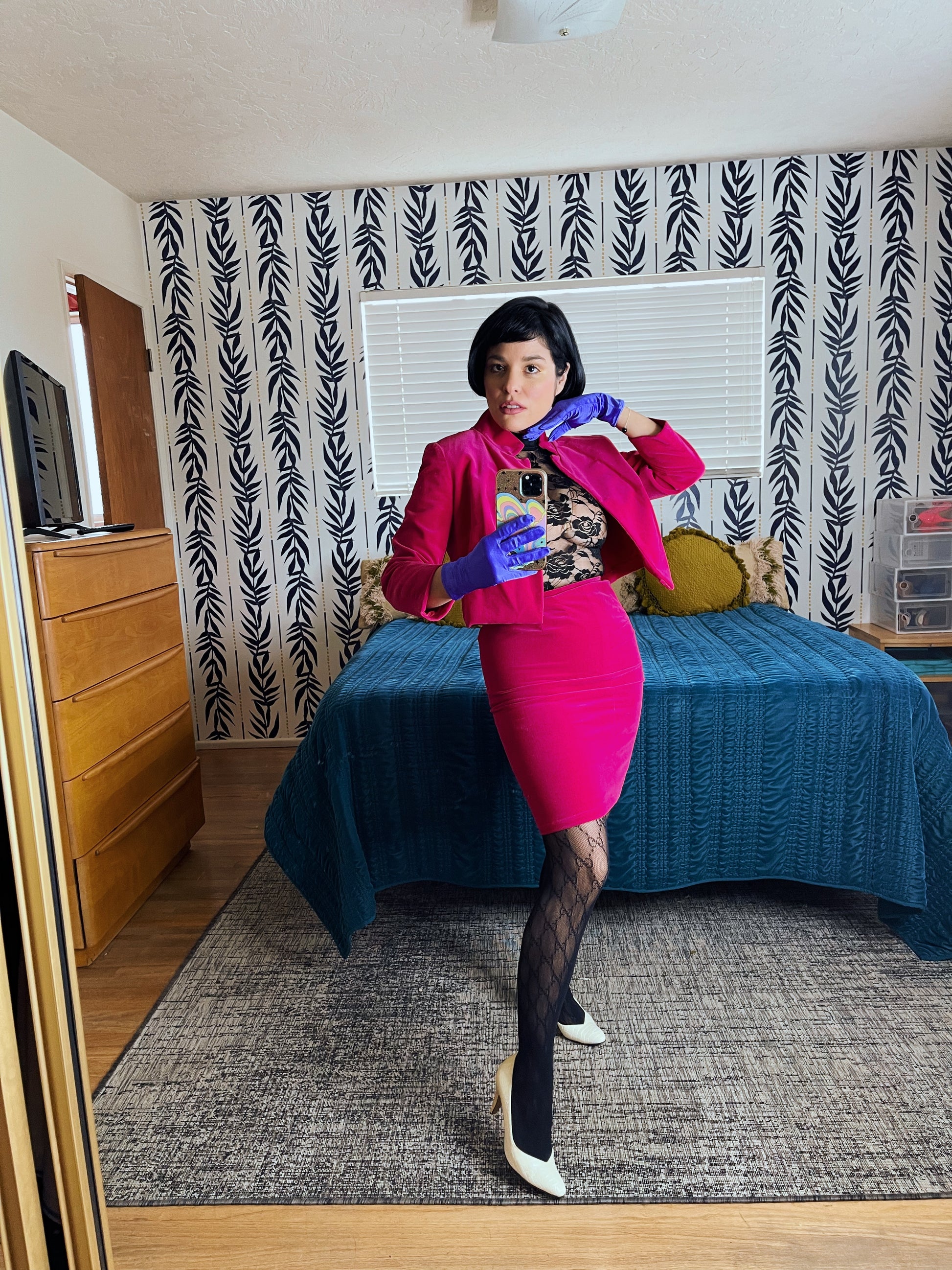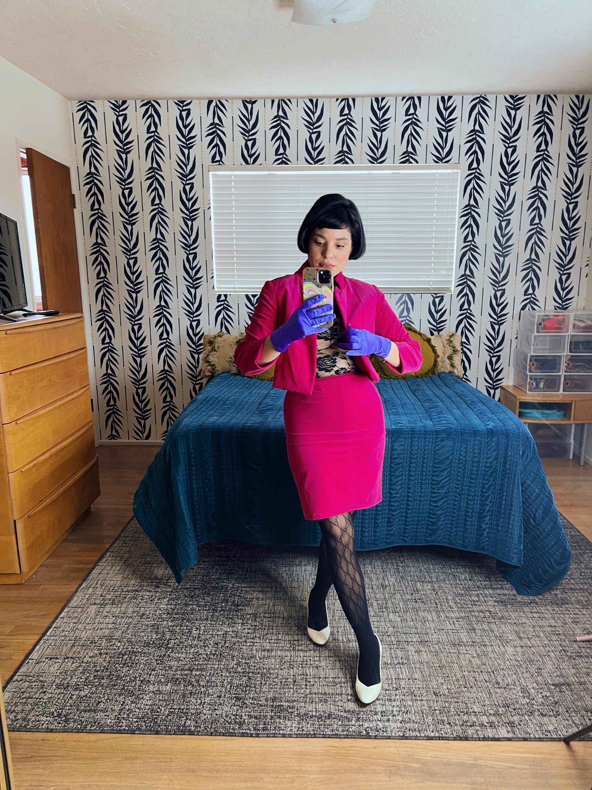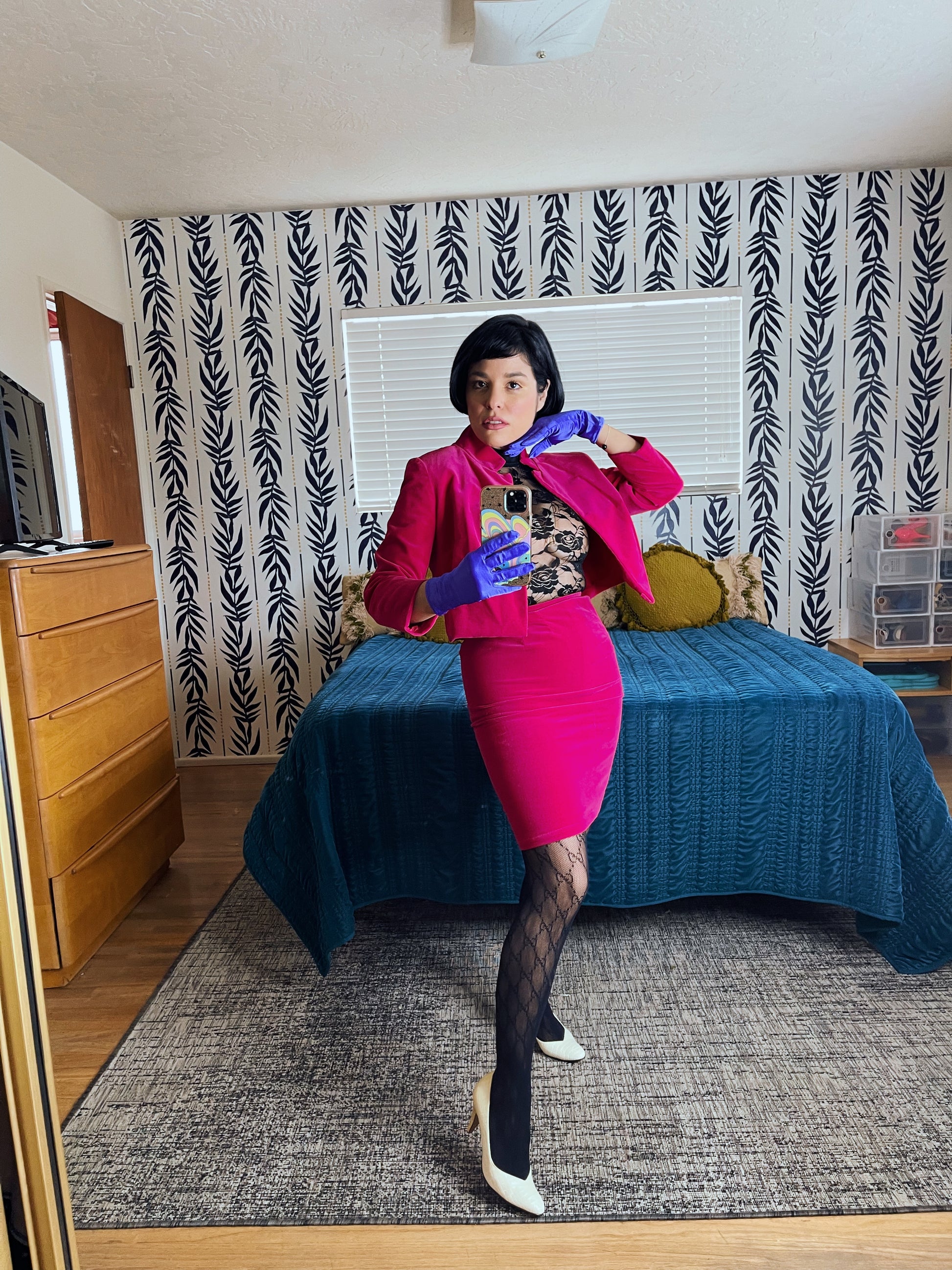 Vintage 60s Hot Pink Velvet Blazer Pencil Skirt Set Fits Sizes XXS-XS