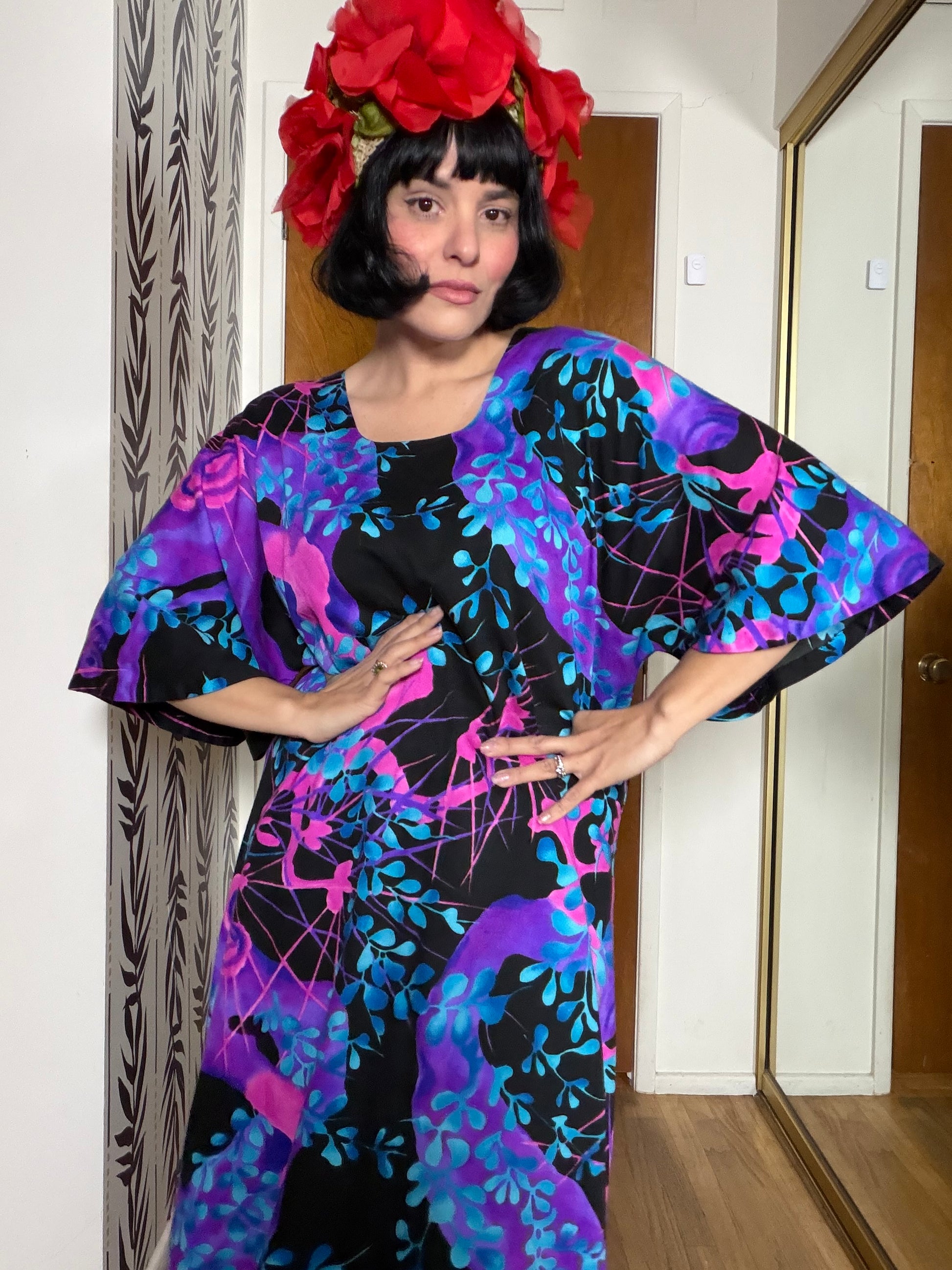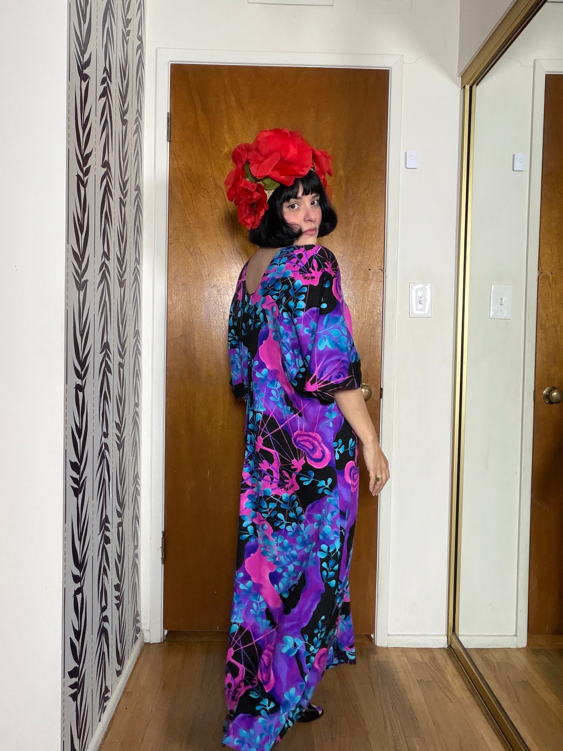 Vintage 60s Two Potato of Laguna Beach Neon Bell Sleeves Maxi Caftan Dress Fits S-L