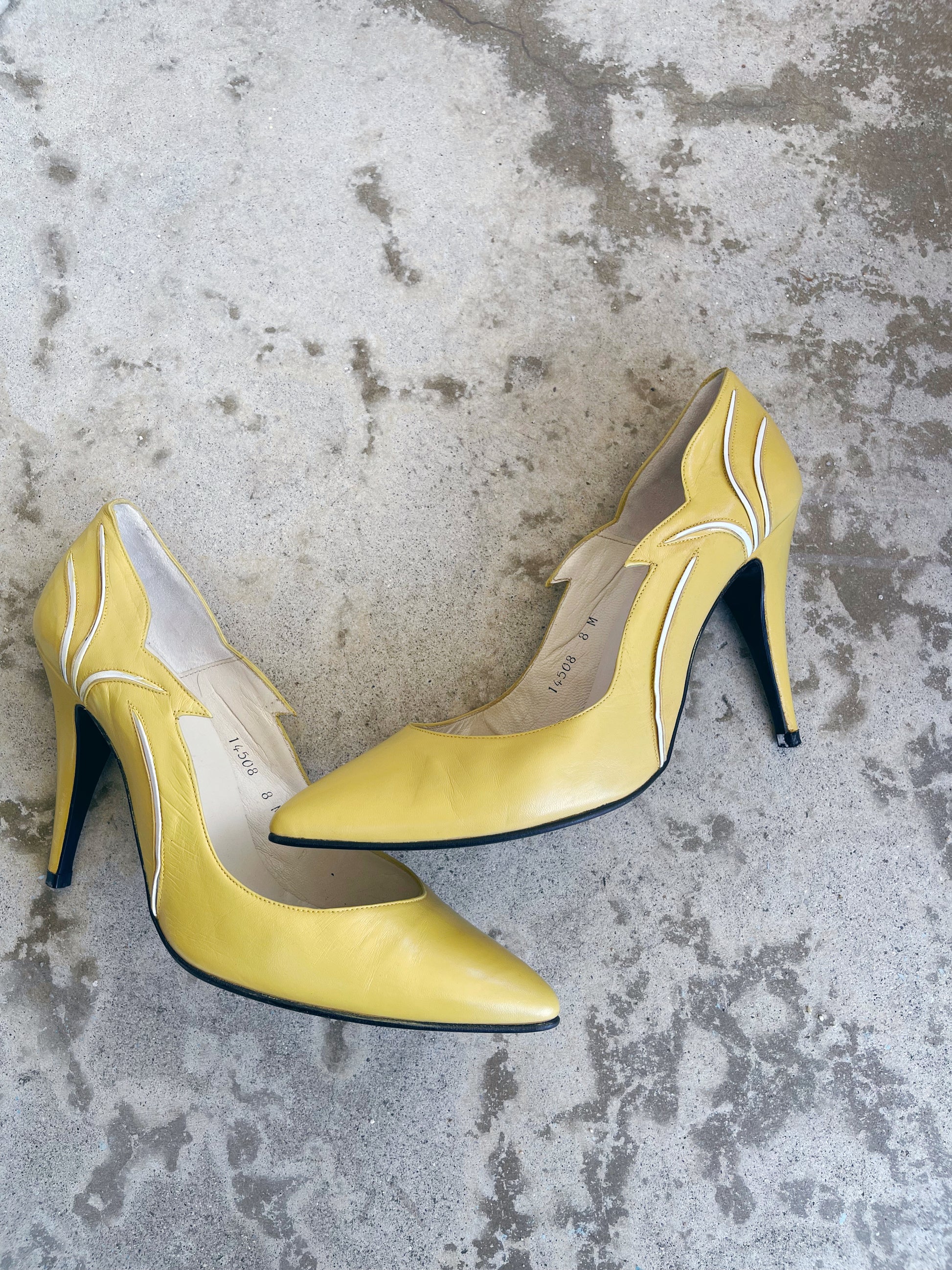 Vintage 70s / 80s Mellow Yellow with White Trim 4” Heels US Size 8
