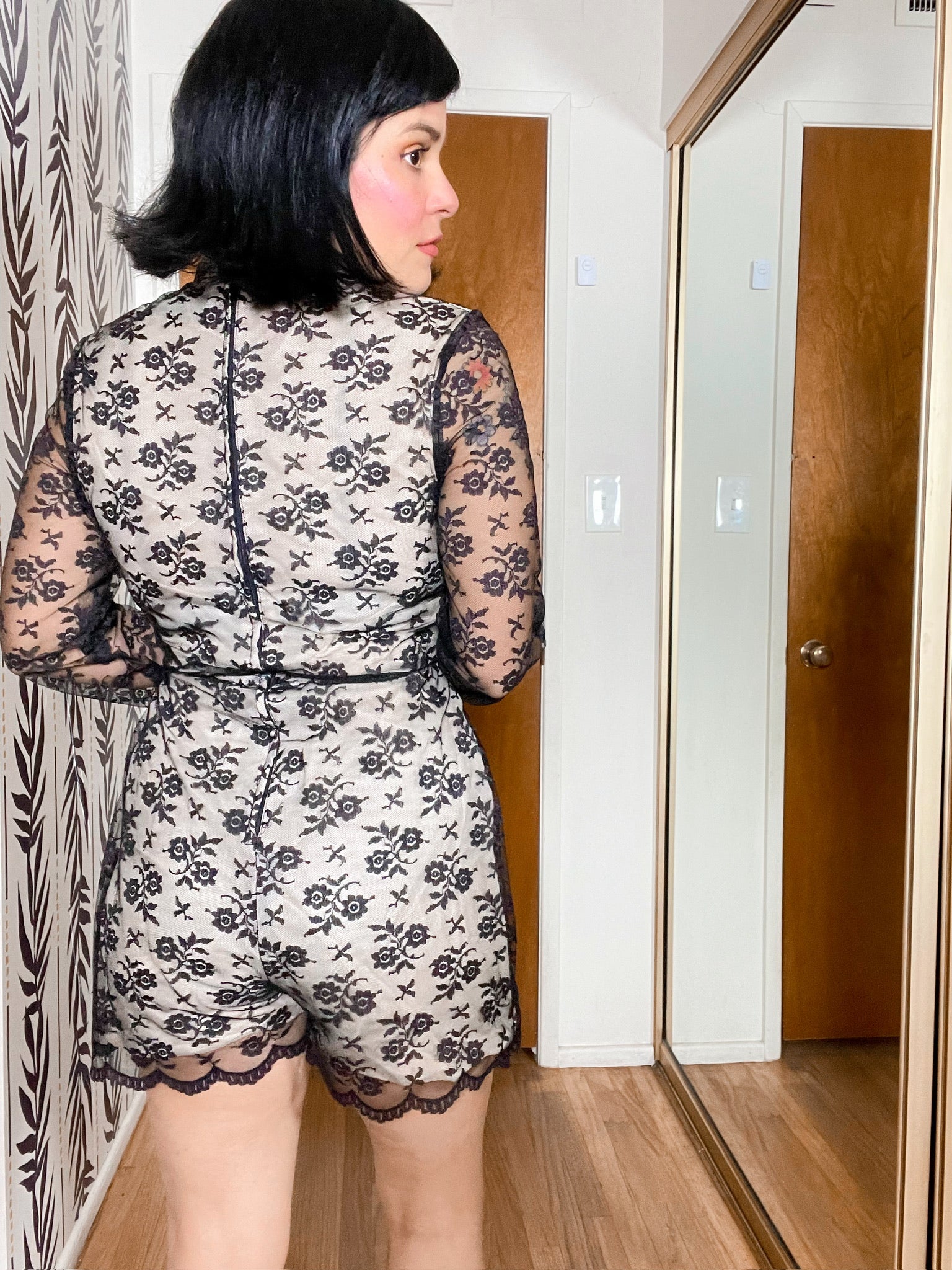 Romper Features: Synthetic Black Lace Outer Material With Acetate Nylon Lining / Sheer Sleeves / Back Zipper / Made In Canada / Attached Brand Label