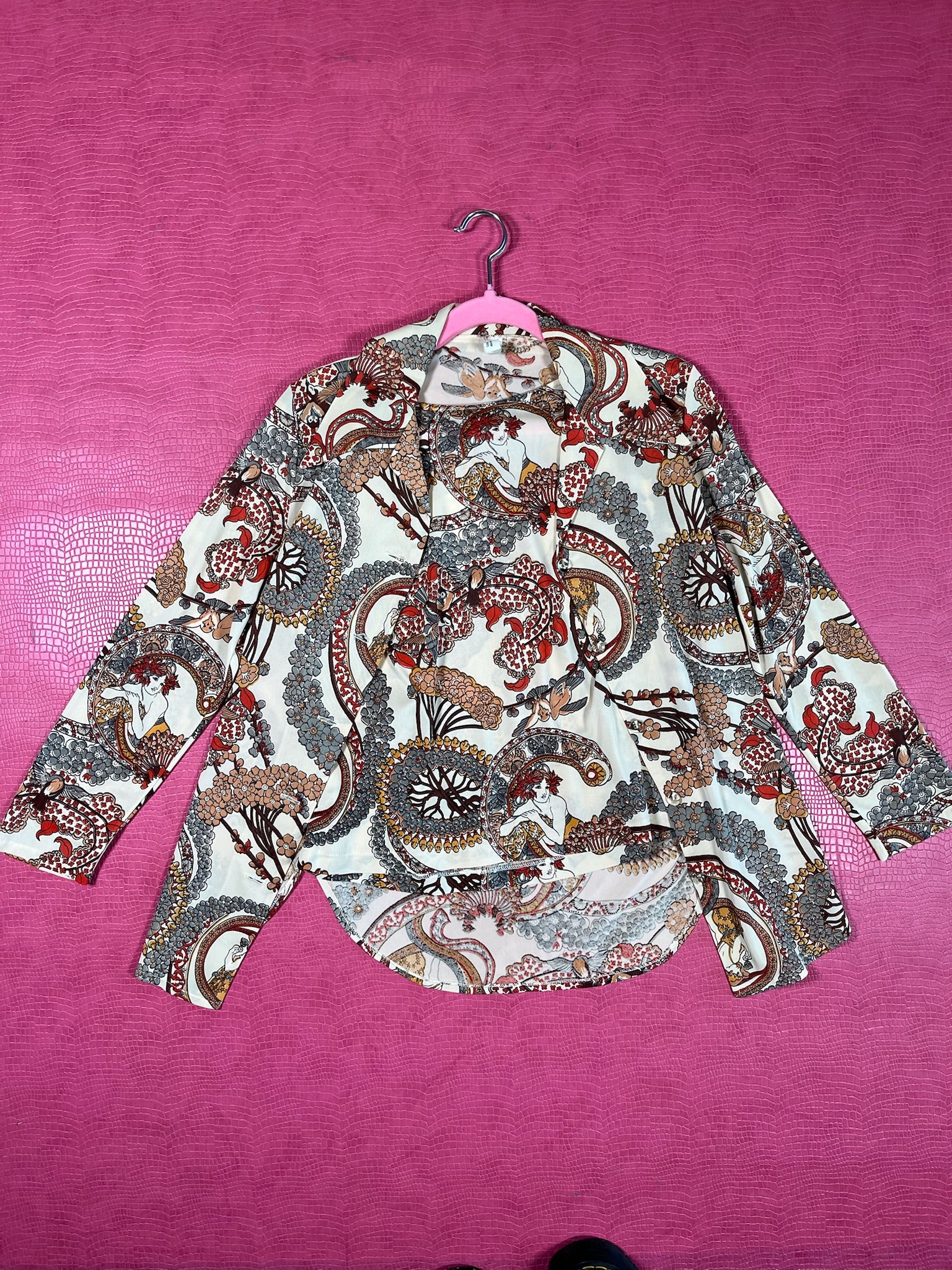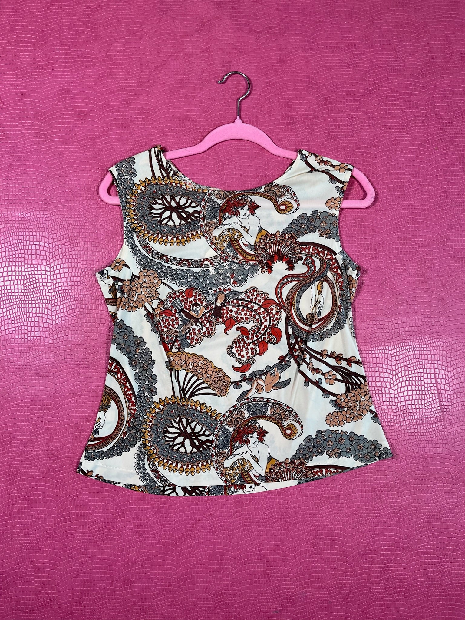 Set Features: 3-piece Matching Set / Print Features A Scene of A Goddess And A Forest / Set Has Three Pieces- A Button Down Top, A Sleeveless Top, And Pants / Material Has Lots Of Stretch / Pants Have Elastic Waistband / Nylon Acetate Material