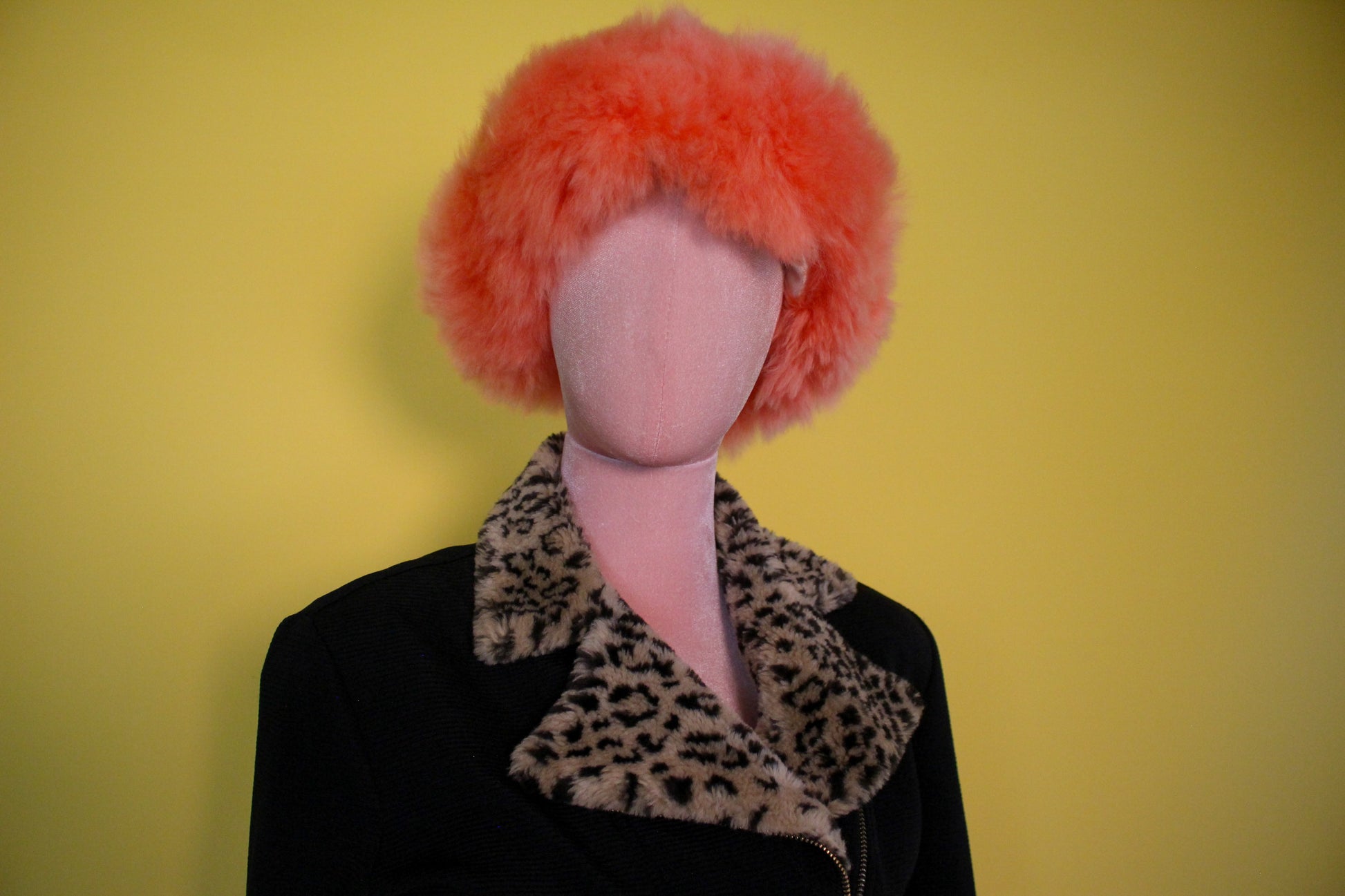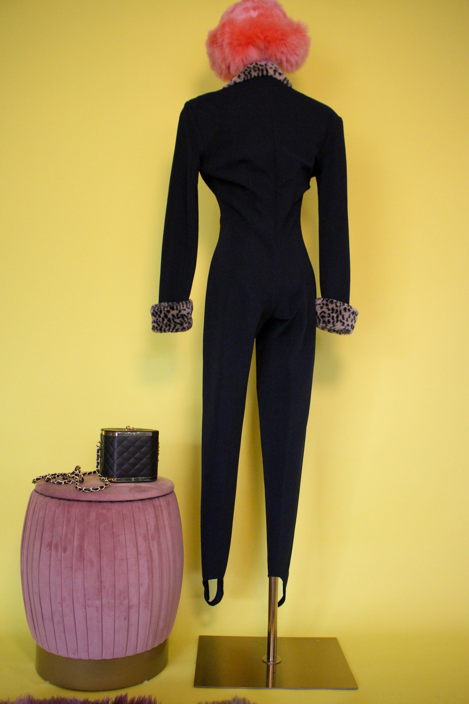 Features: Inner Brand Label / Fabric Content Label / Shoulder Pads / Faux Fur Leopard Lapel And Cuffs / Front Zipper Closure / Fabric Has Some Stretch / Stirrups / Polyester Spandex Acrylic Material
