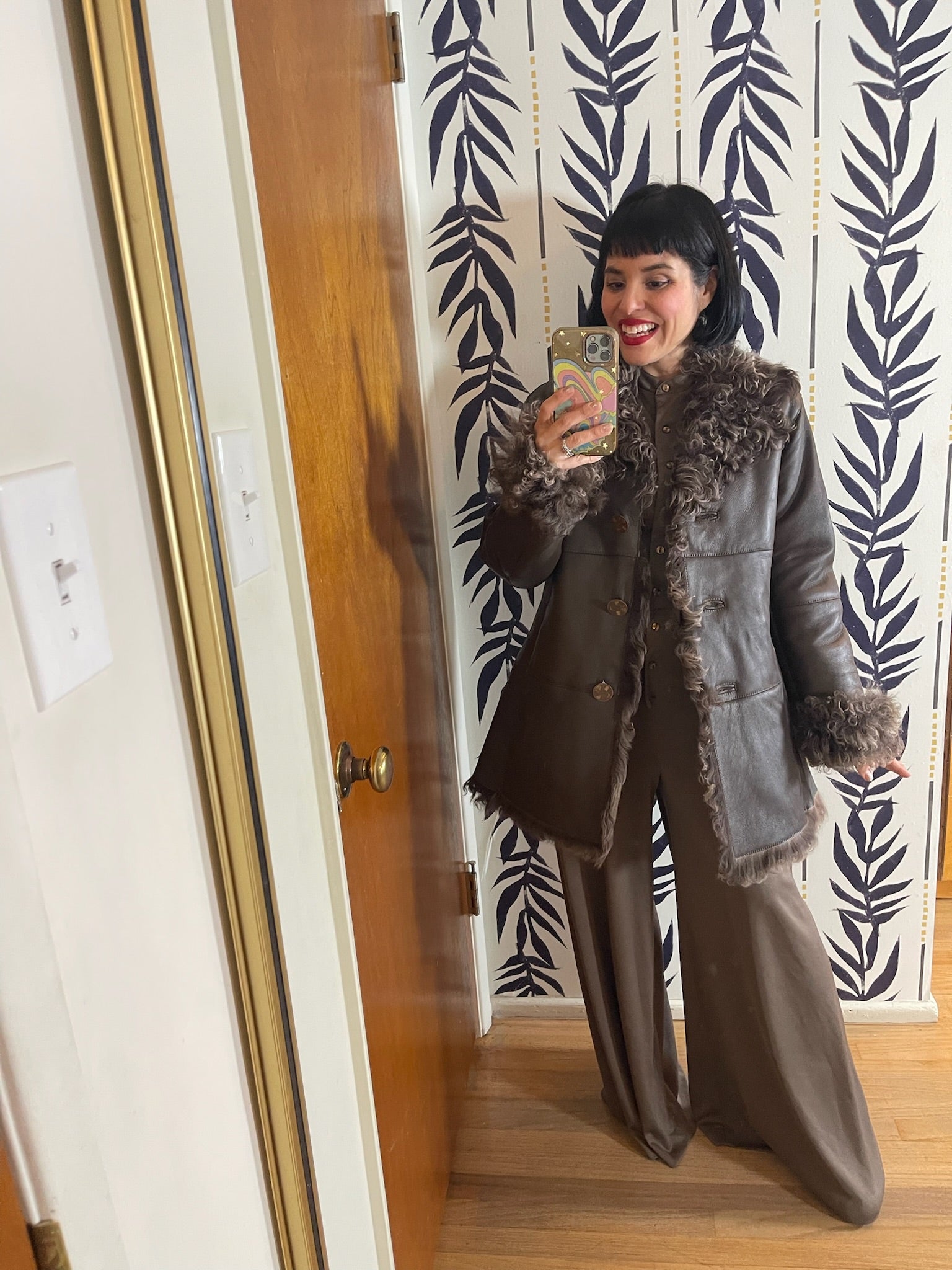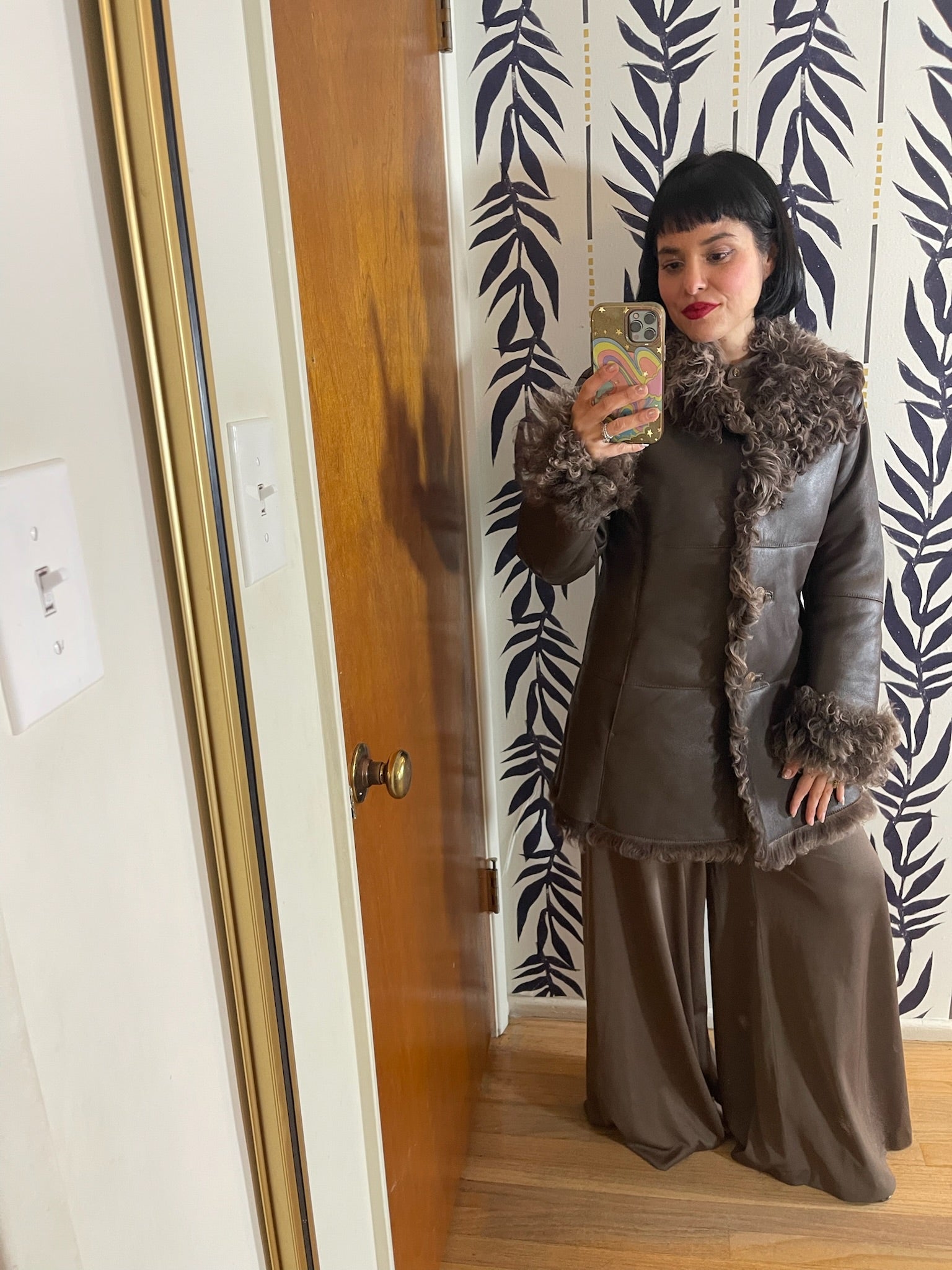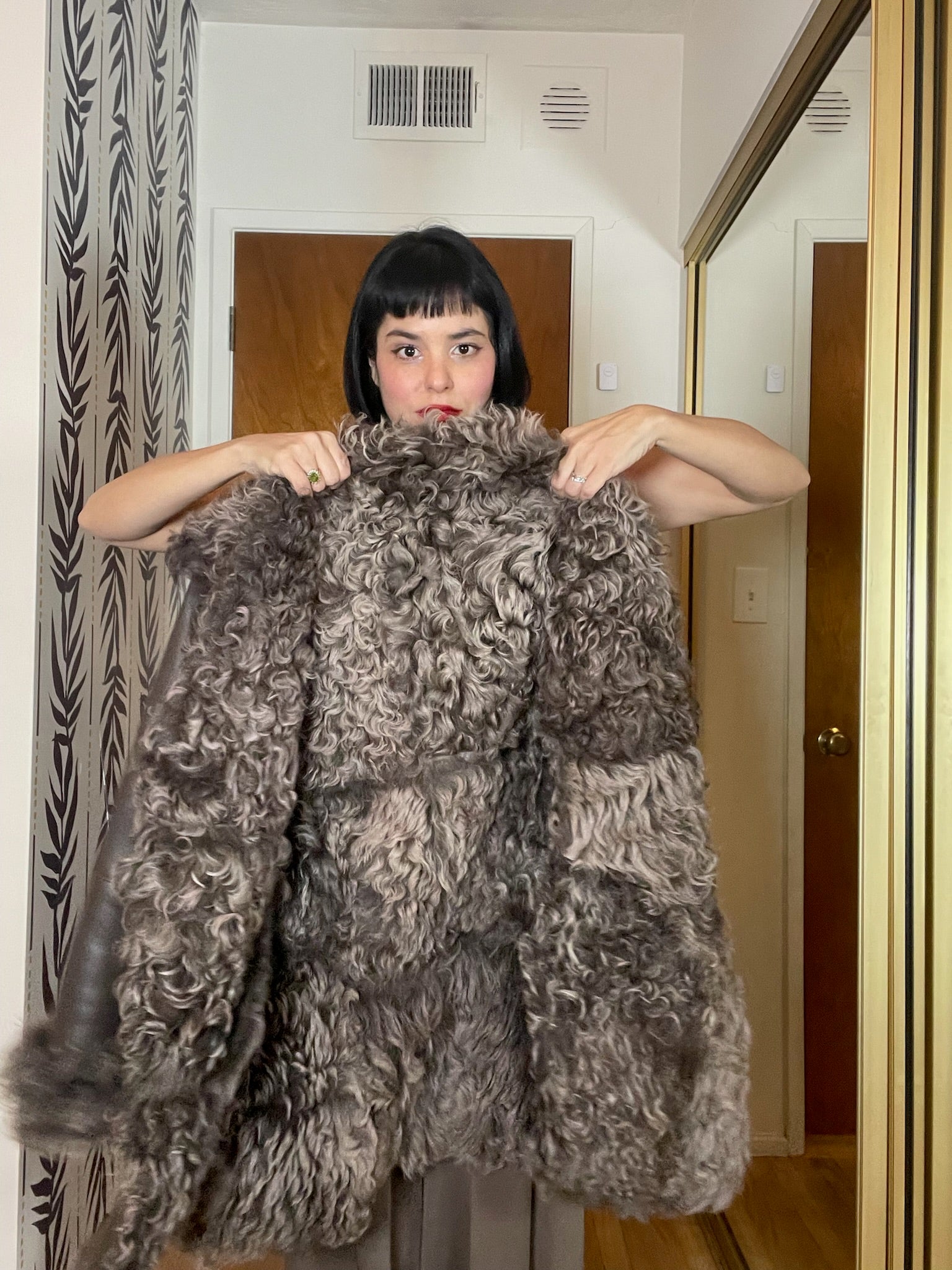 Features: Lined With Real Genuine Lamb Hair / Lamb Hair Outer Details / Dark Taupe Brown Color / Soft Buttery Leather / Front Button Closure / Attached Brand Label / Two Side Pockets