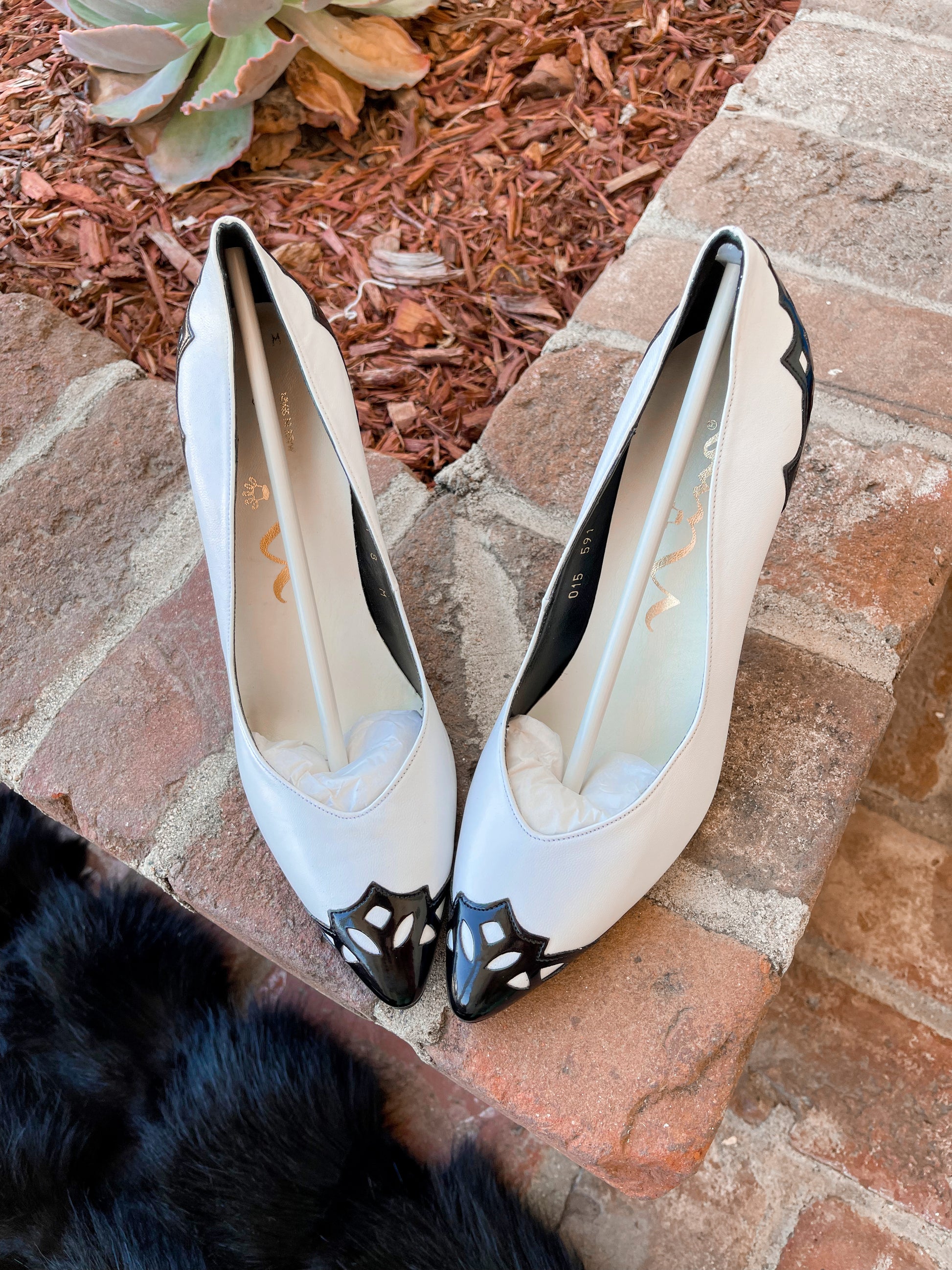 Vintage 80s Abstract Spiderweb Black and White Genuine Leather Heels US Size 8