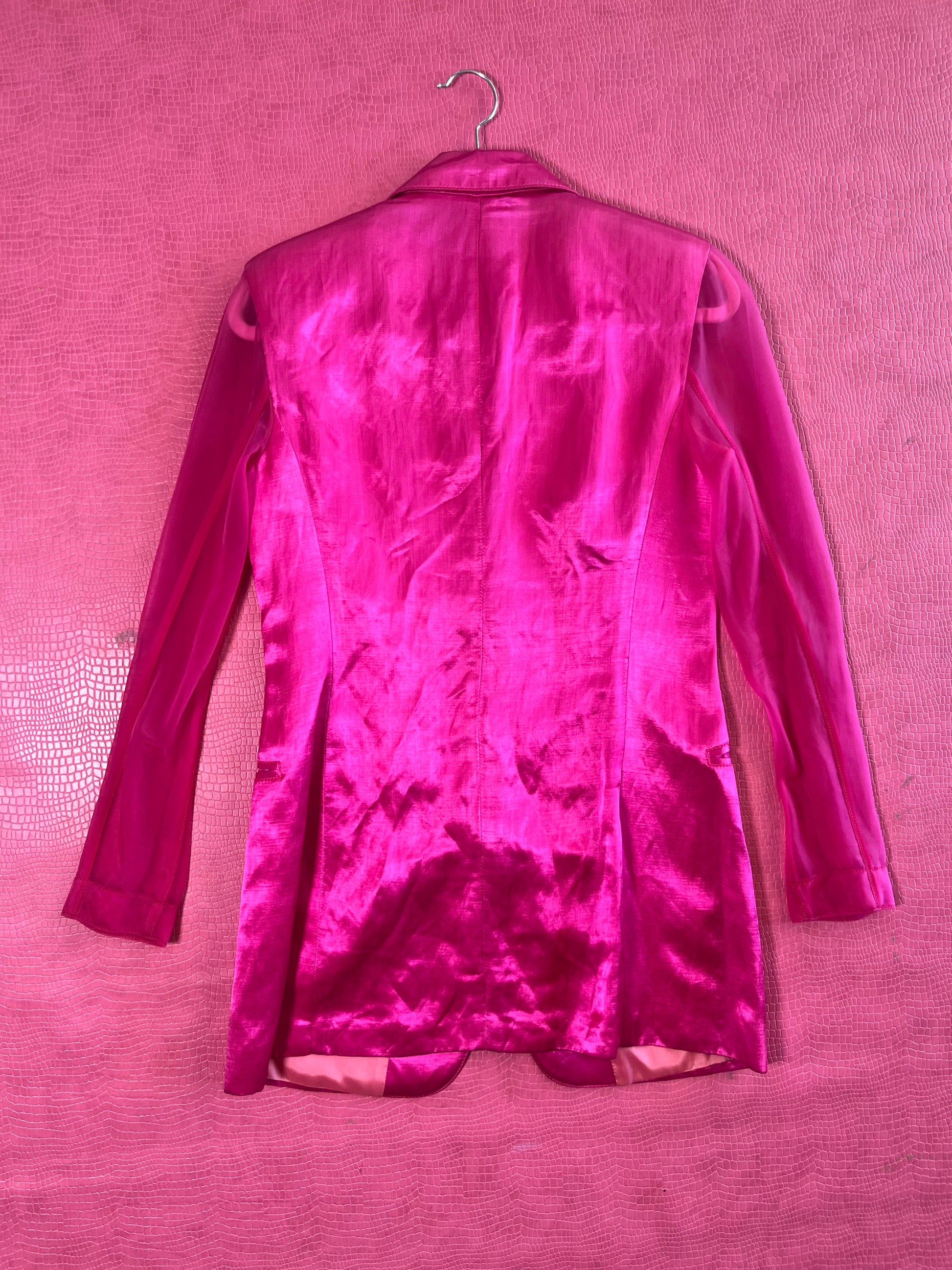 Dress Features: Sheer Nylon Sleeves / Nylon Acetate Lining / Satin Outer Material / Can Be Worn As A Dress Or Blazer / Two Front Pockets / Three Front Button Closure / Hot Pink Color / Attached Brand Label