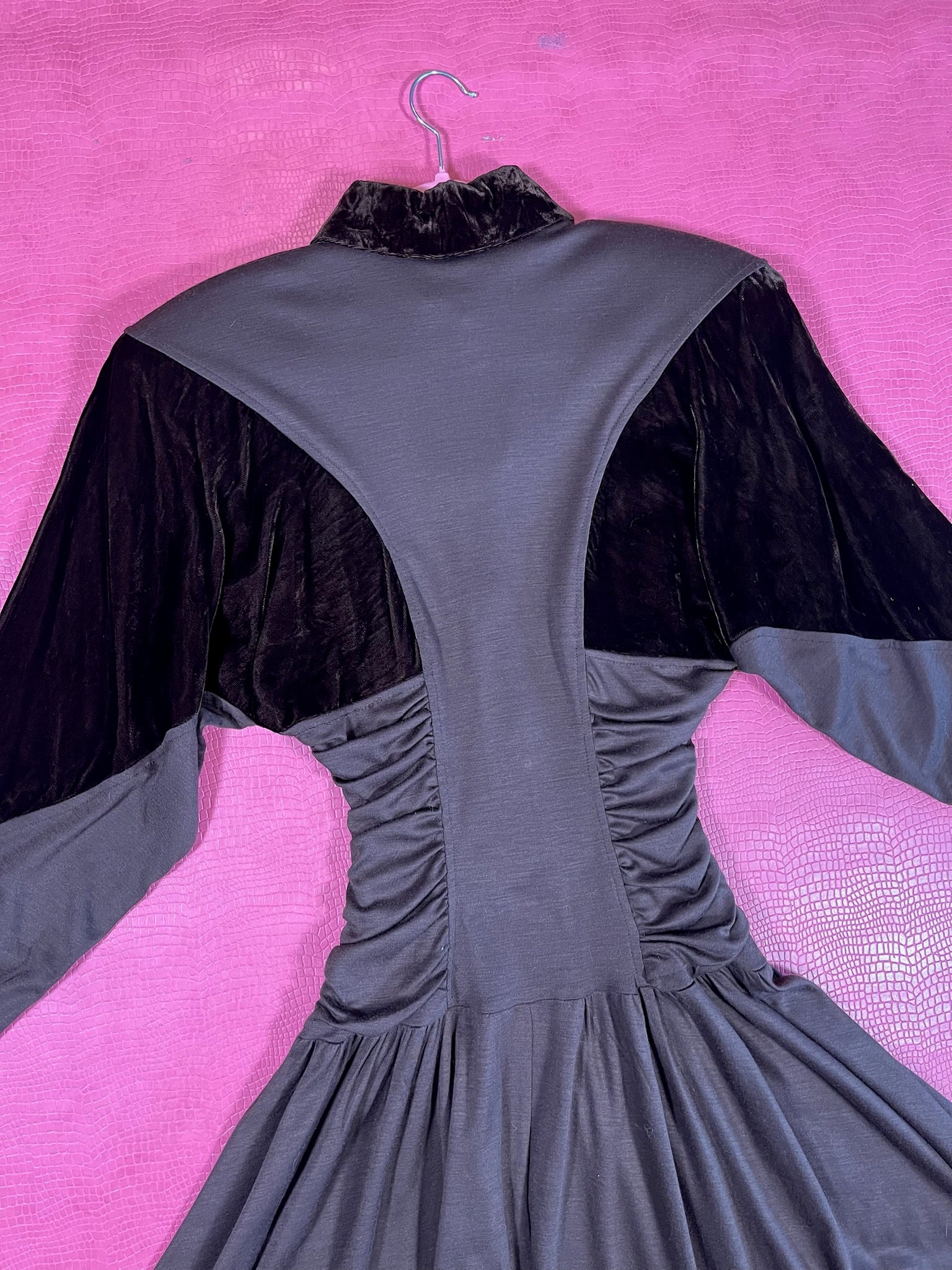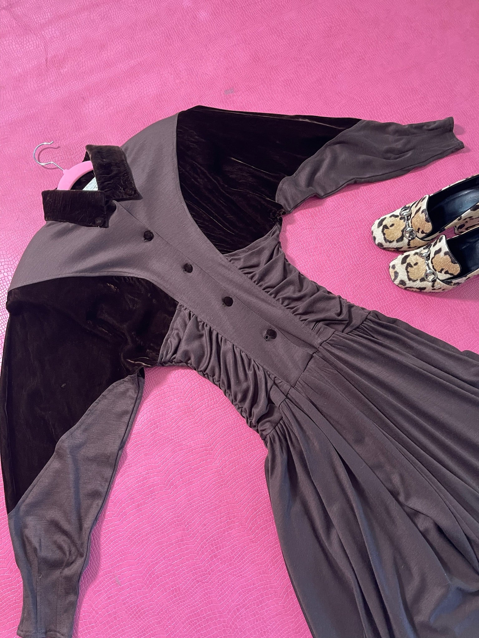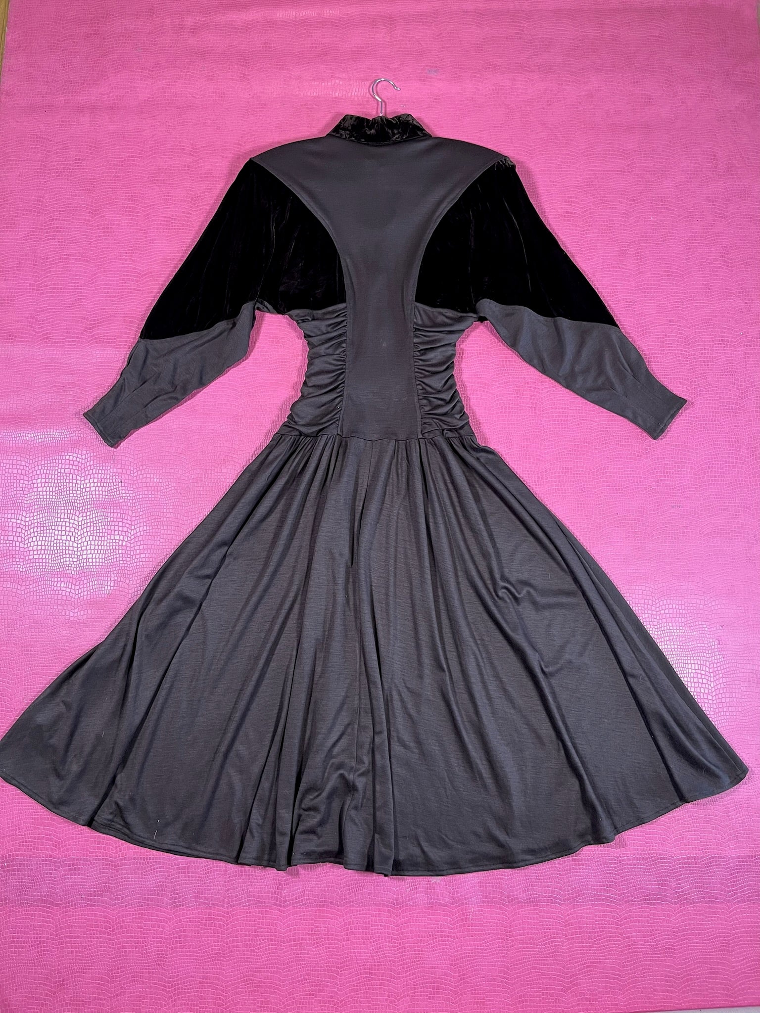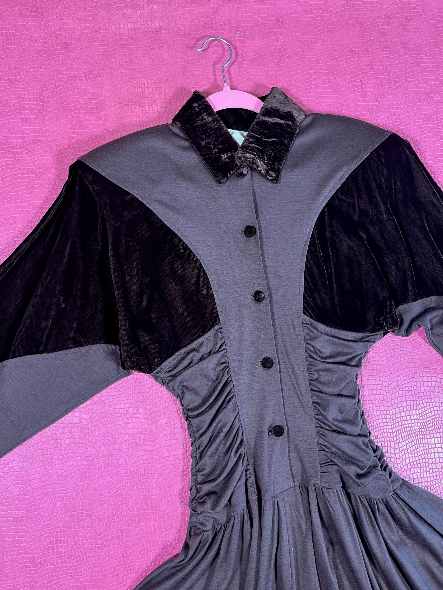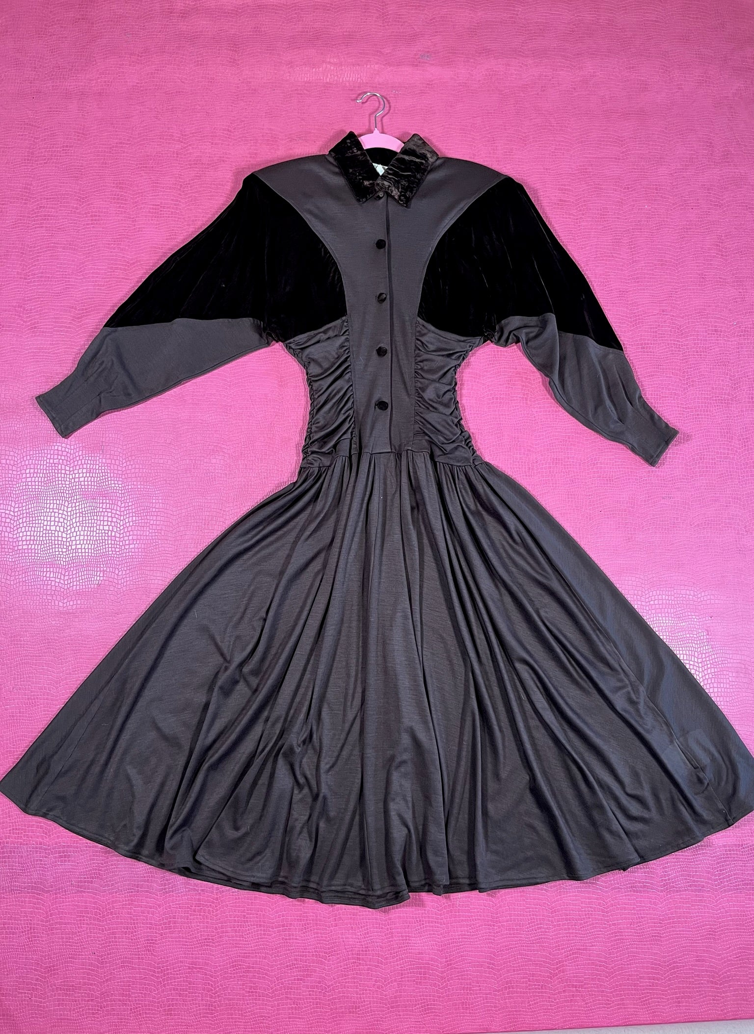 Dress Features: Dark Chocolatey Brown Color / Velvet With Jersey Poly Material / Dolman Sleeves / Functional Front Buttons / Brown Velvet Accents / Full Skirt / Shoulder Pads / 80s does 40s Look