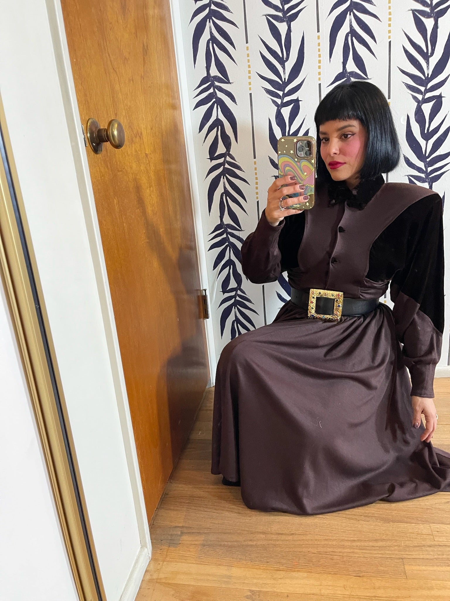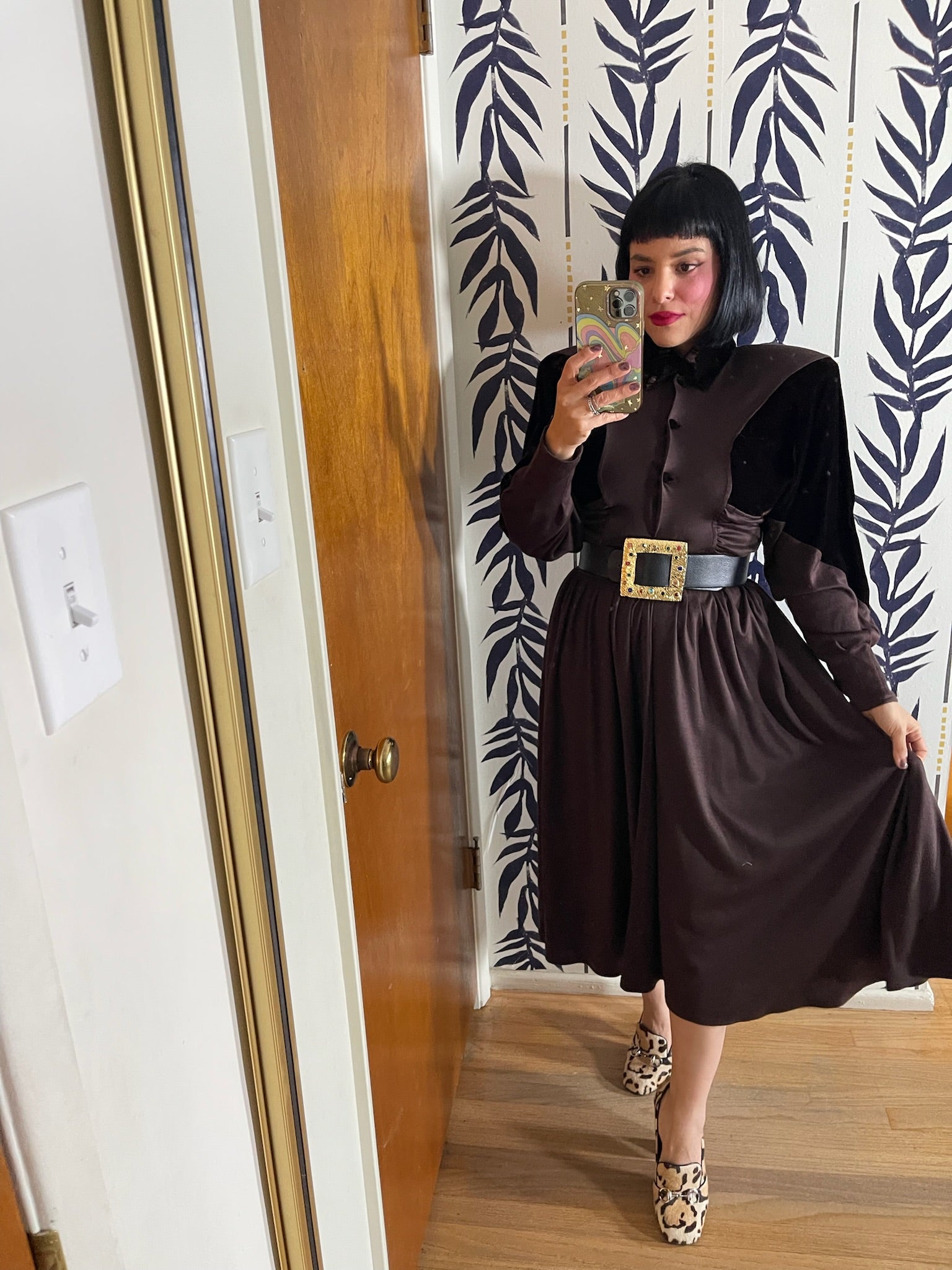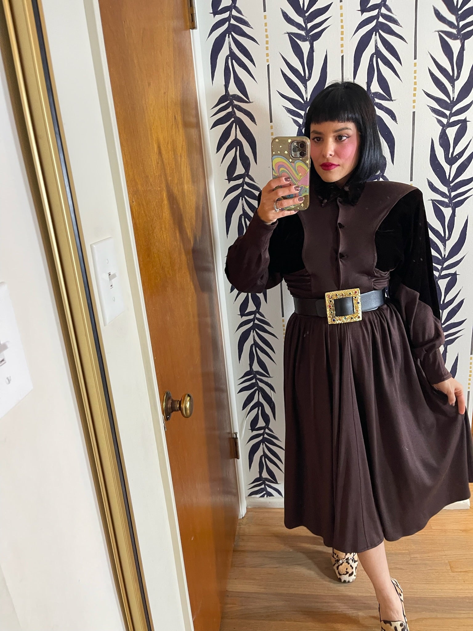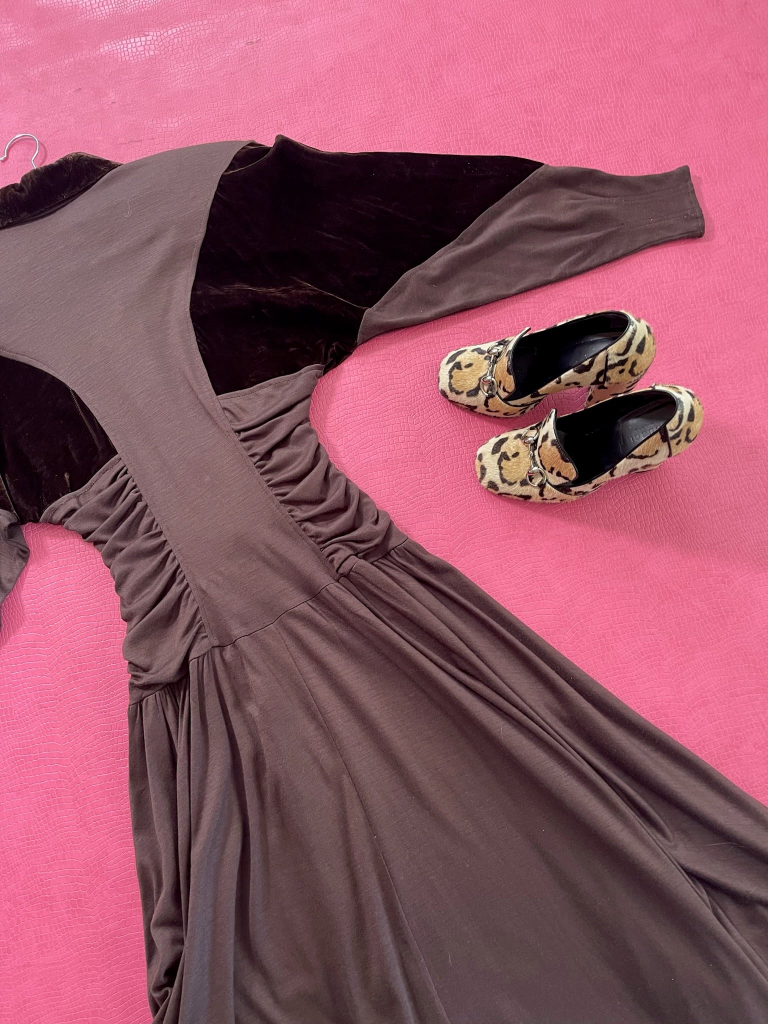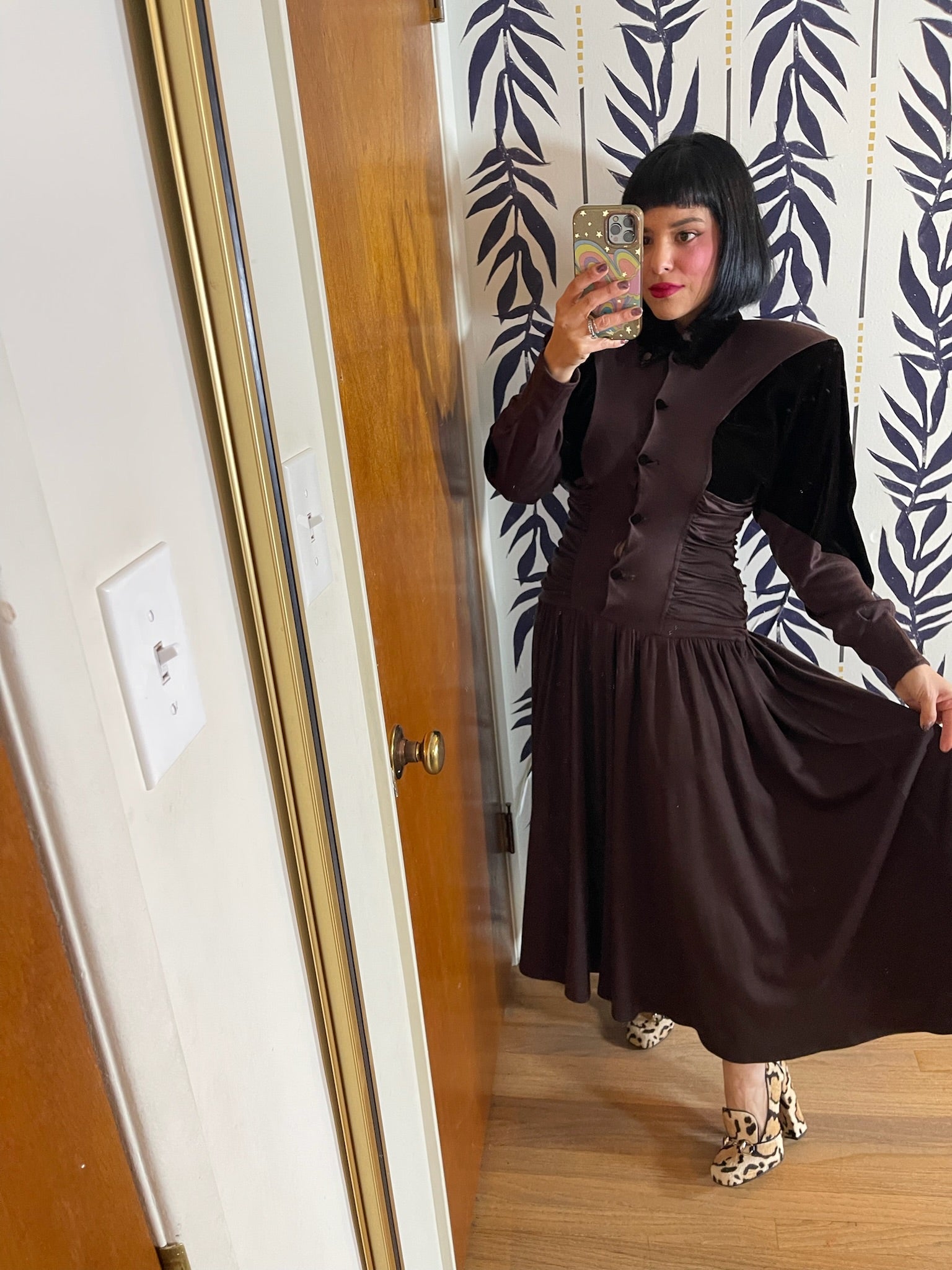 Dress Features: Dark Chocolatey Brown Color / Velvet With Jersey Poly Material / Dolman Sleeves / Functional Front Buttons / Brown Velvet Accents / Full Skirt / Shoulder Pads / 80s does 40s Look