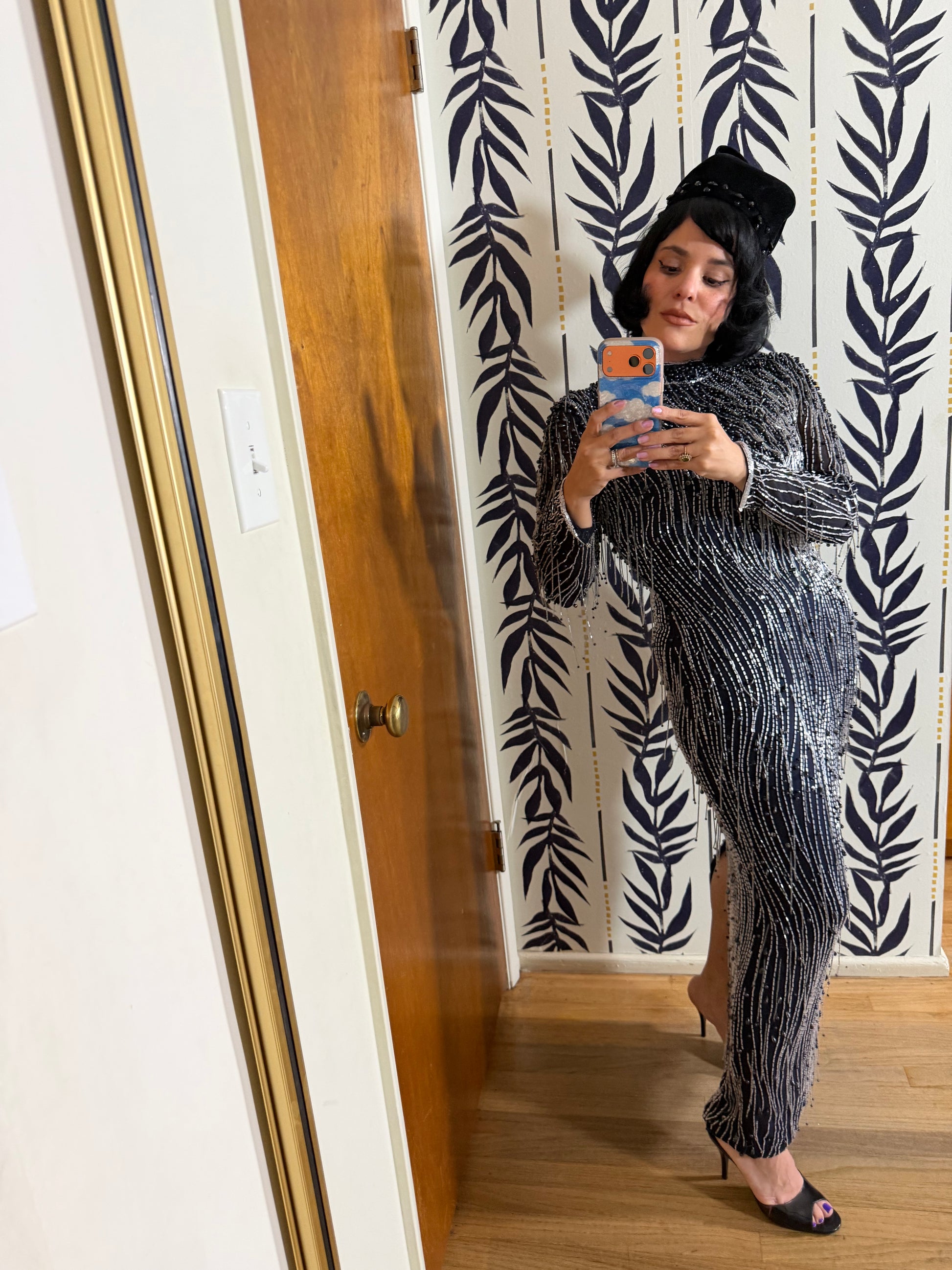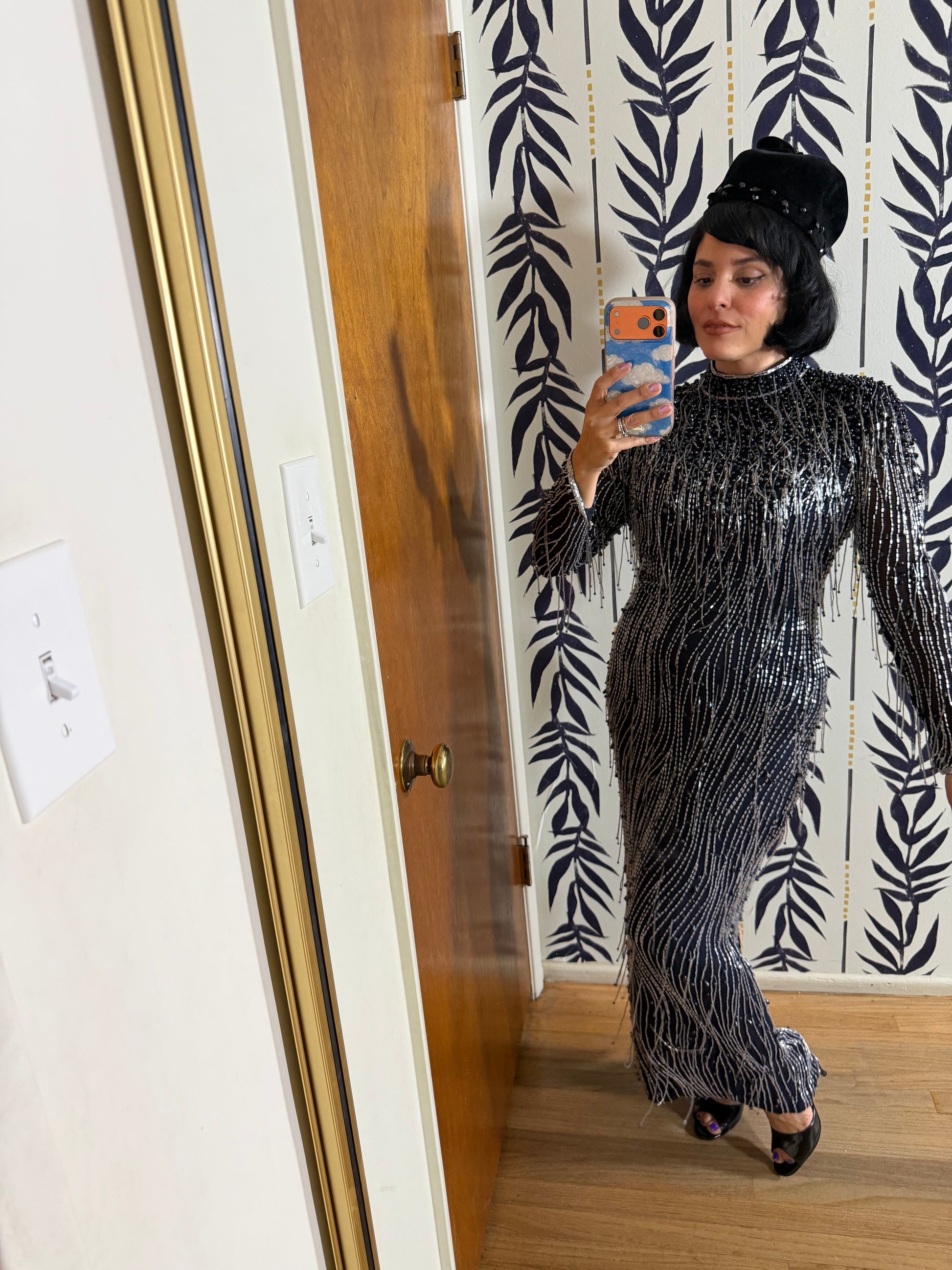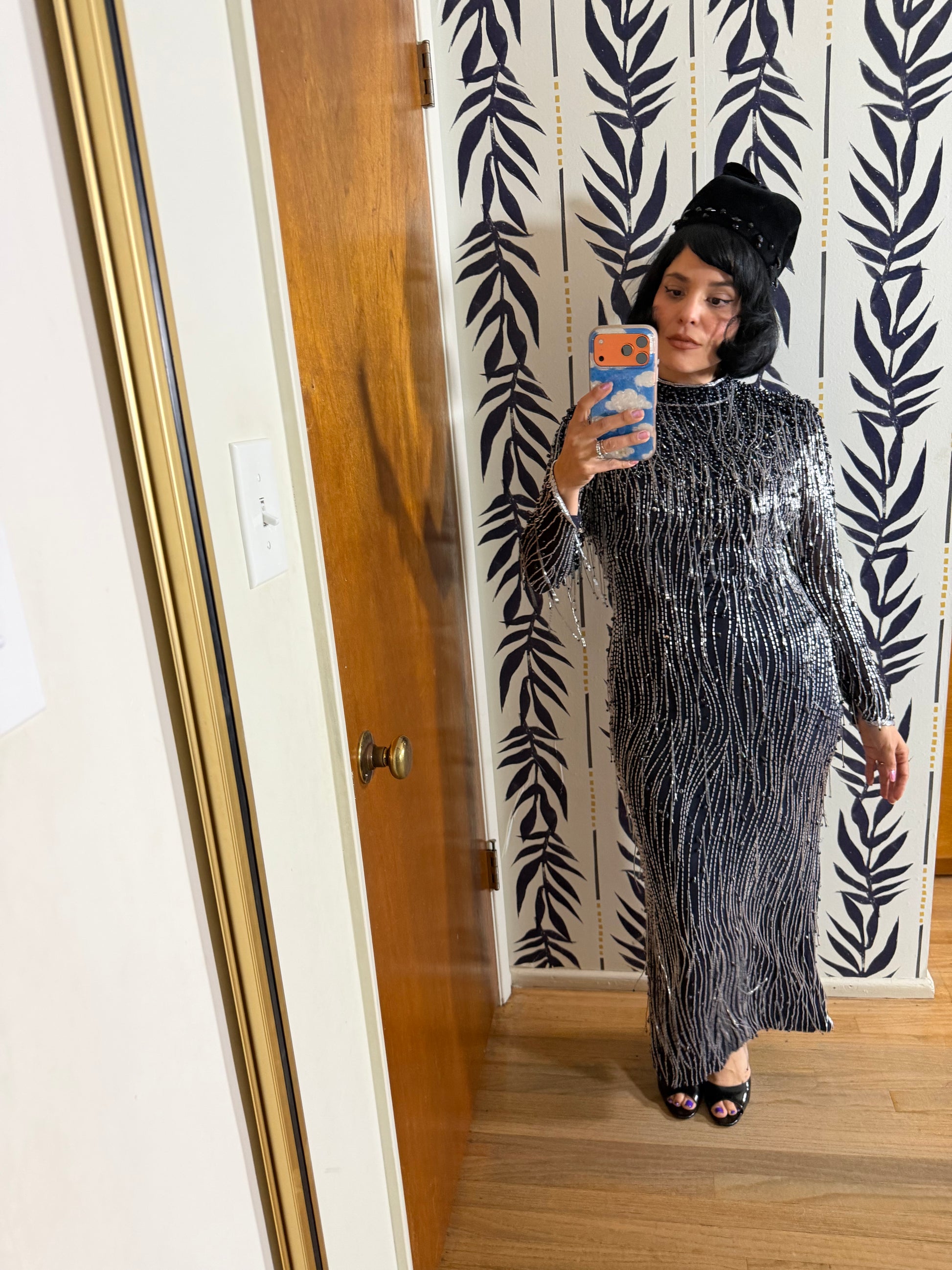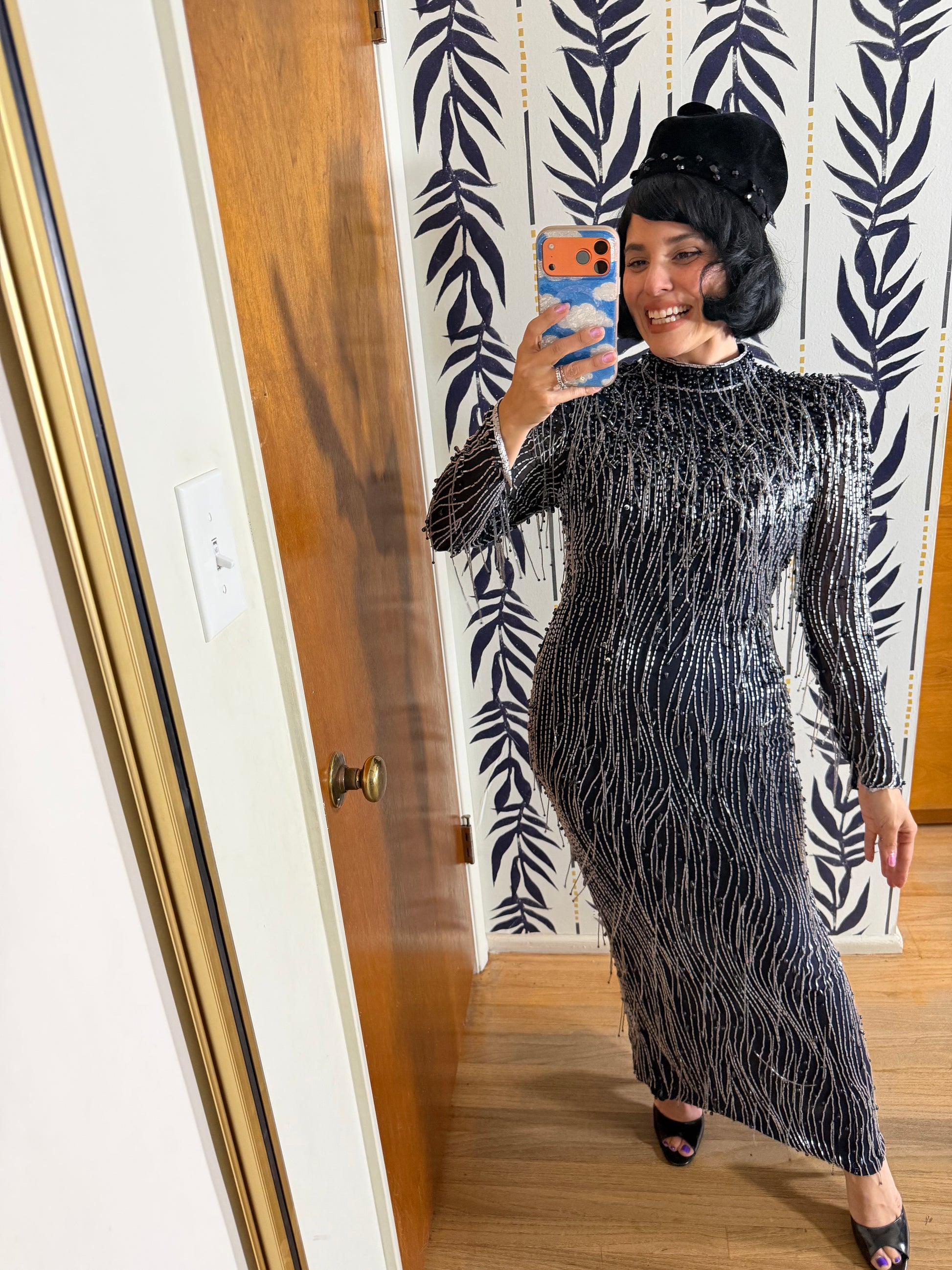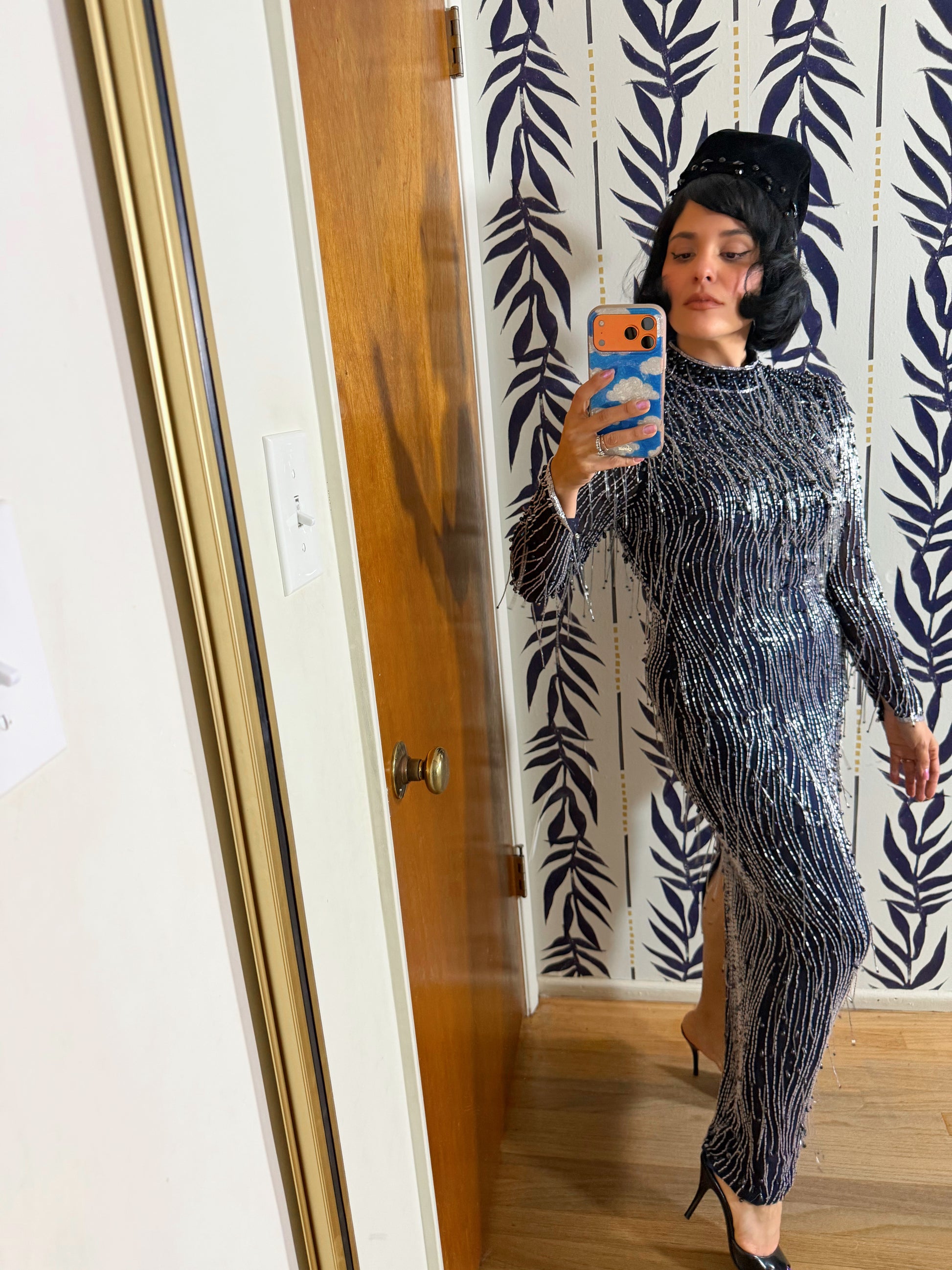 Vintage 80s Silk Beaded Navy Gown Fits XS-SM