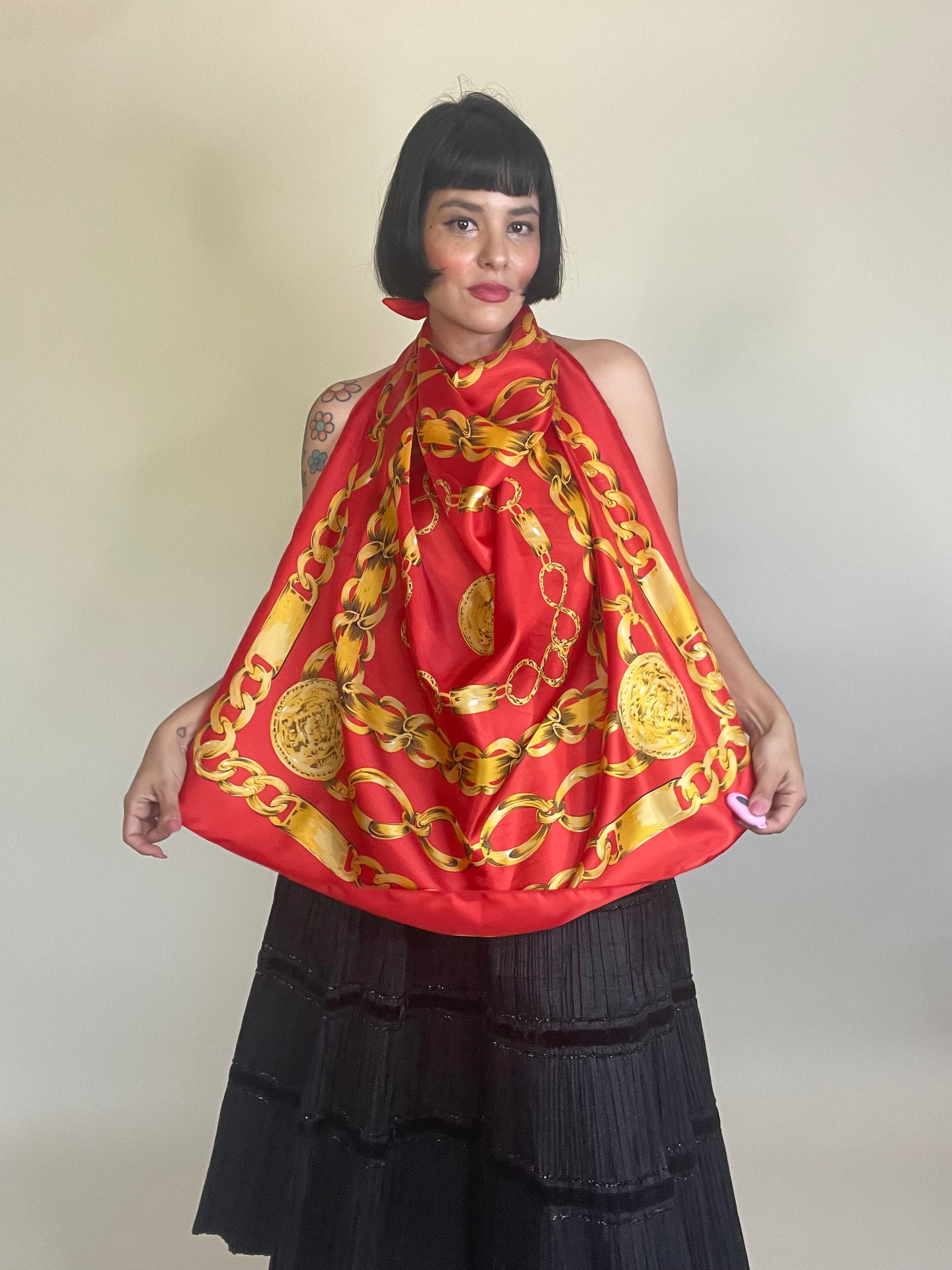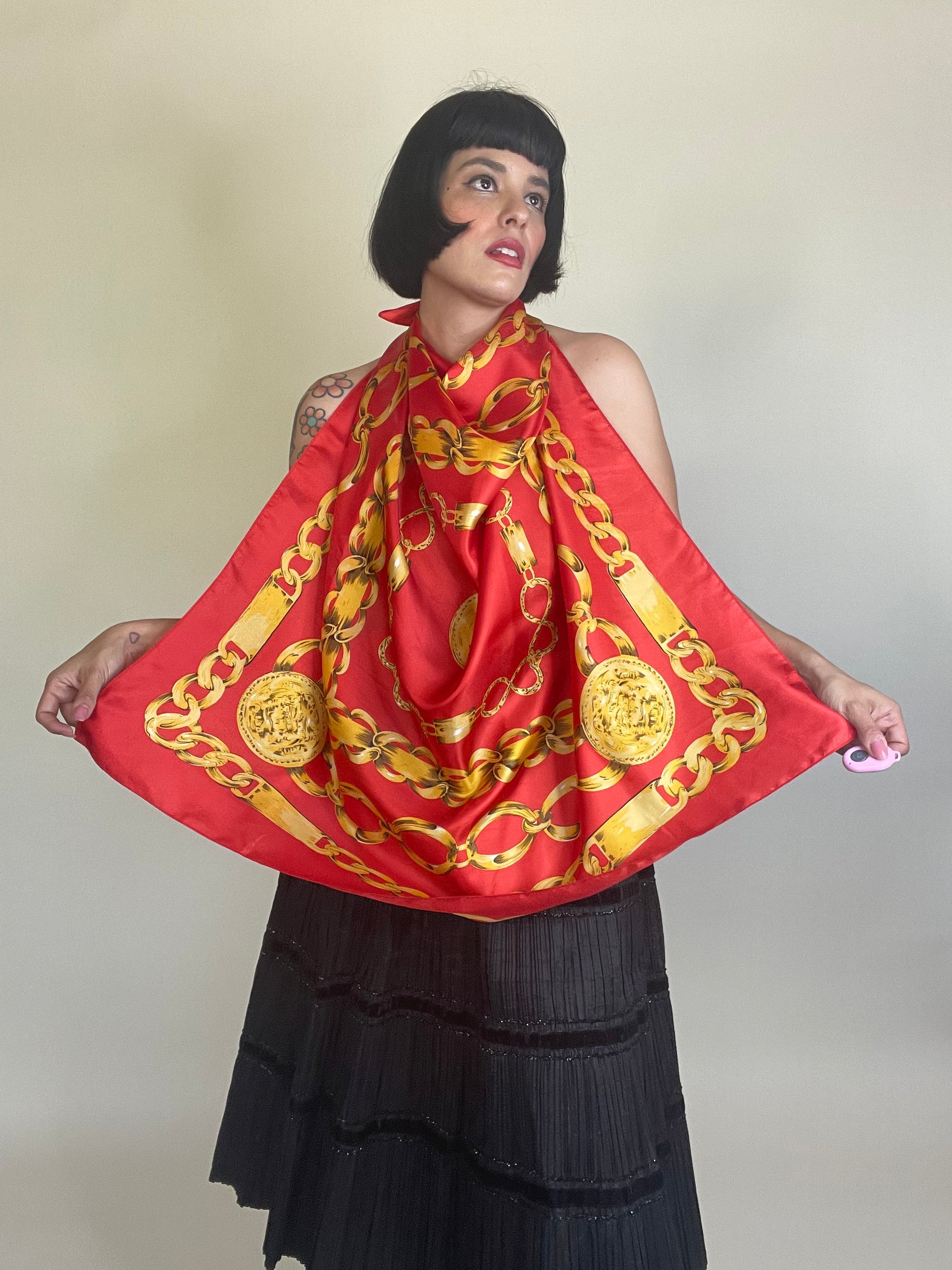 Vintage 80s Silk Gold Chain Novelty Print Scarf