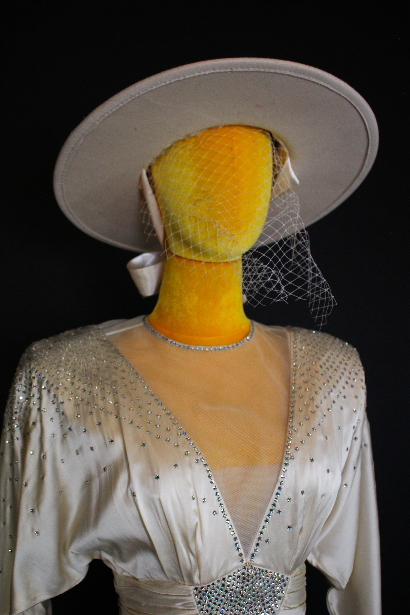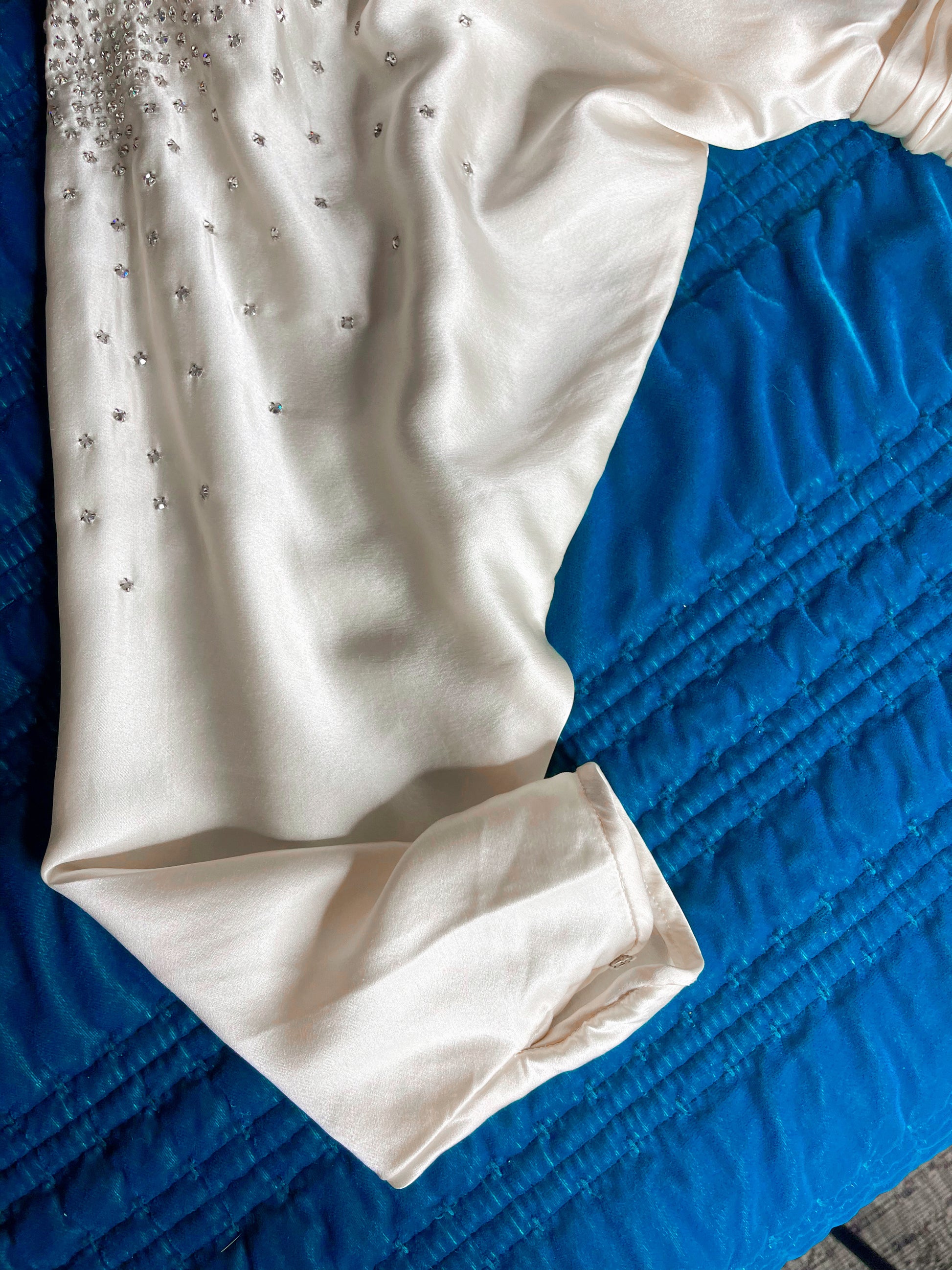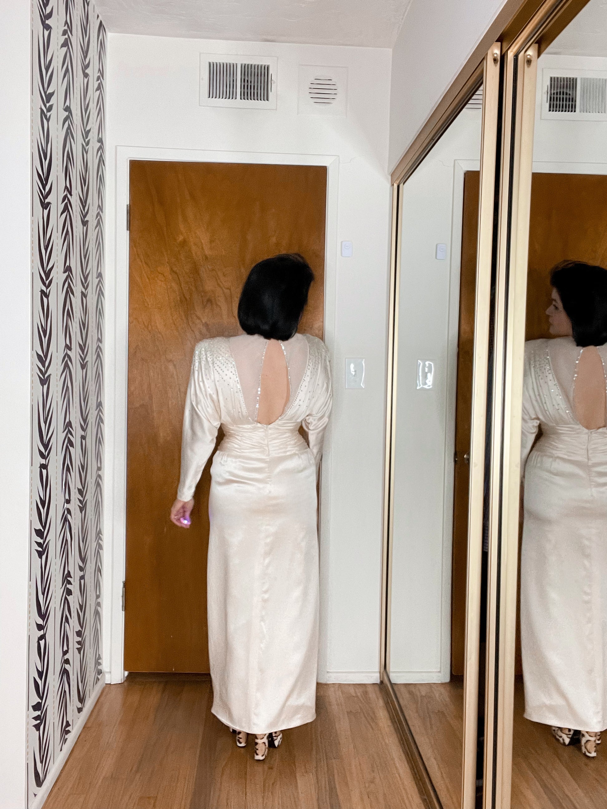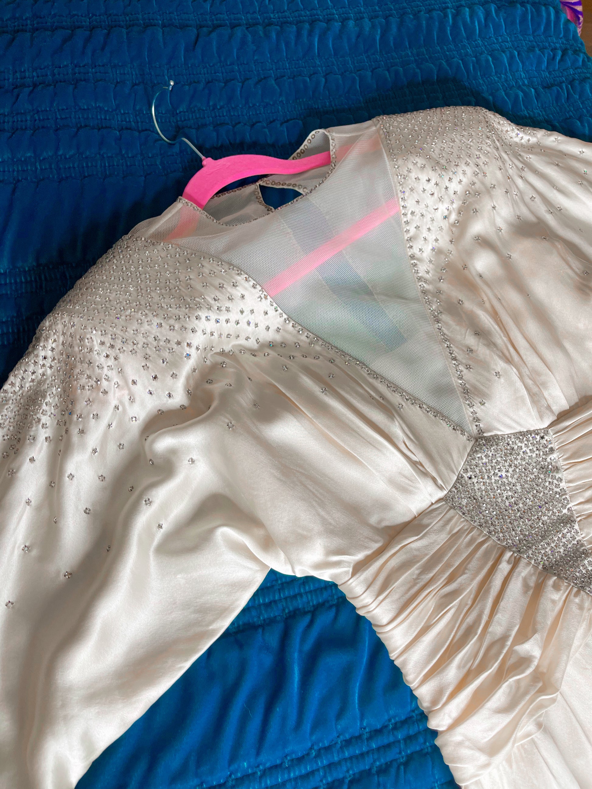 Bodice mesh lining, rhinestone detail, shoulder pads, peekaboo back, zipper closure, ruched waistline, dolman sleeves, hook & eye closure on upper back