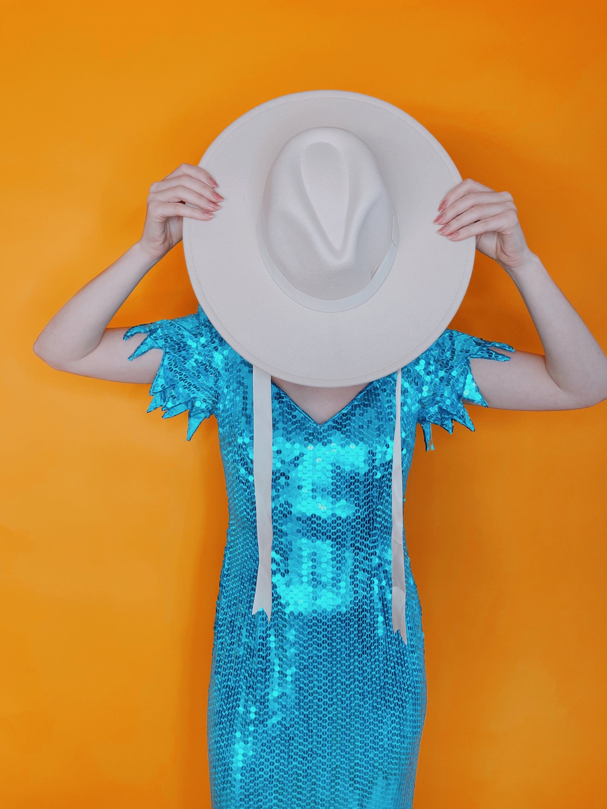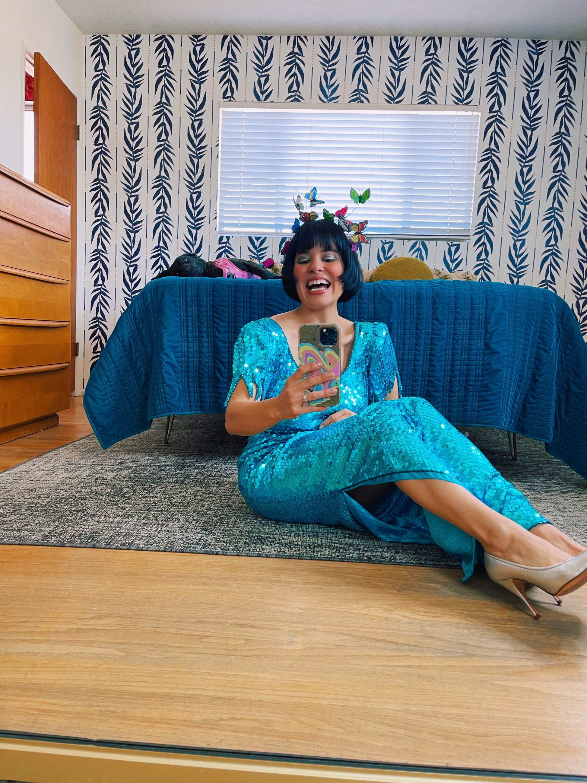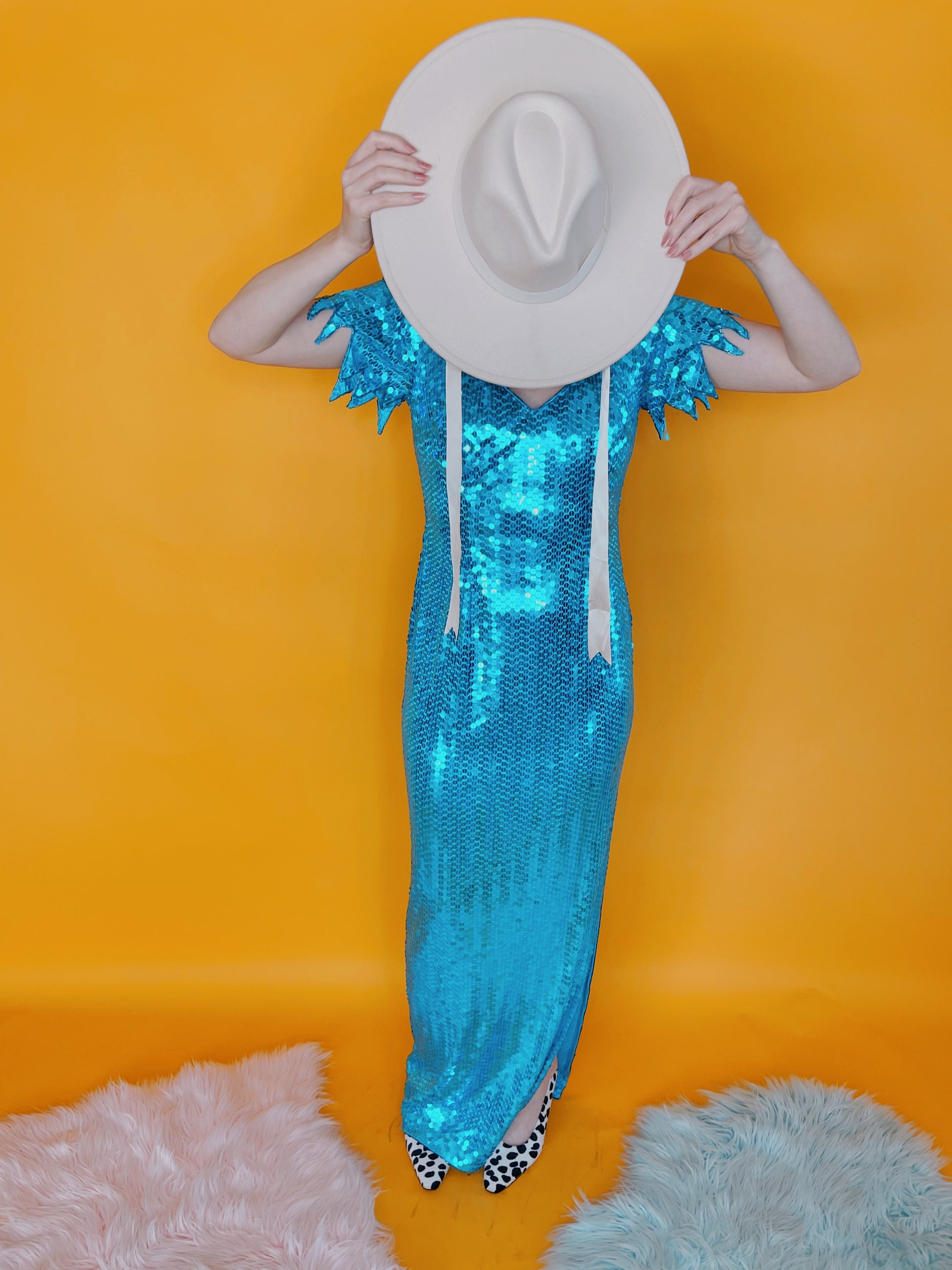 Vintage 80s "Ted Lapidus Paris" Avant Garde Teal Blue Sequins Stretchy Gown Fits Sizes S-M