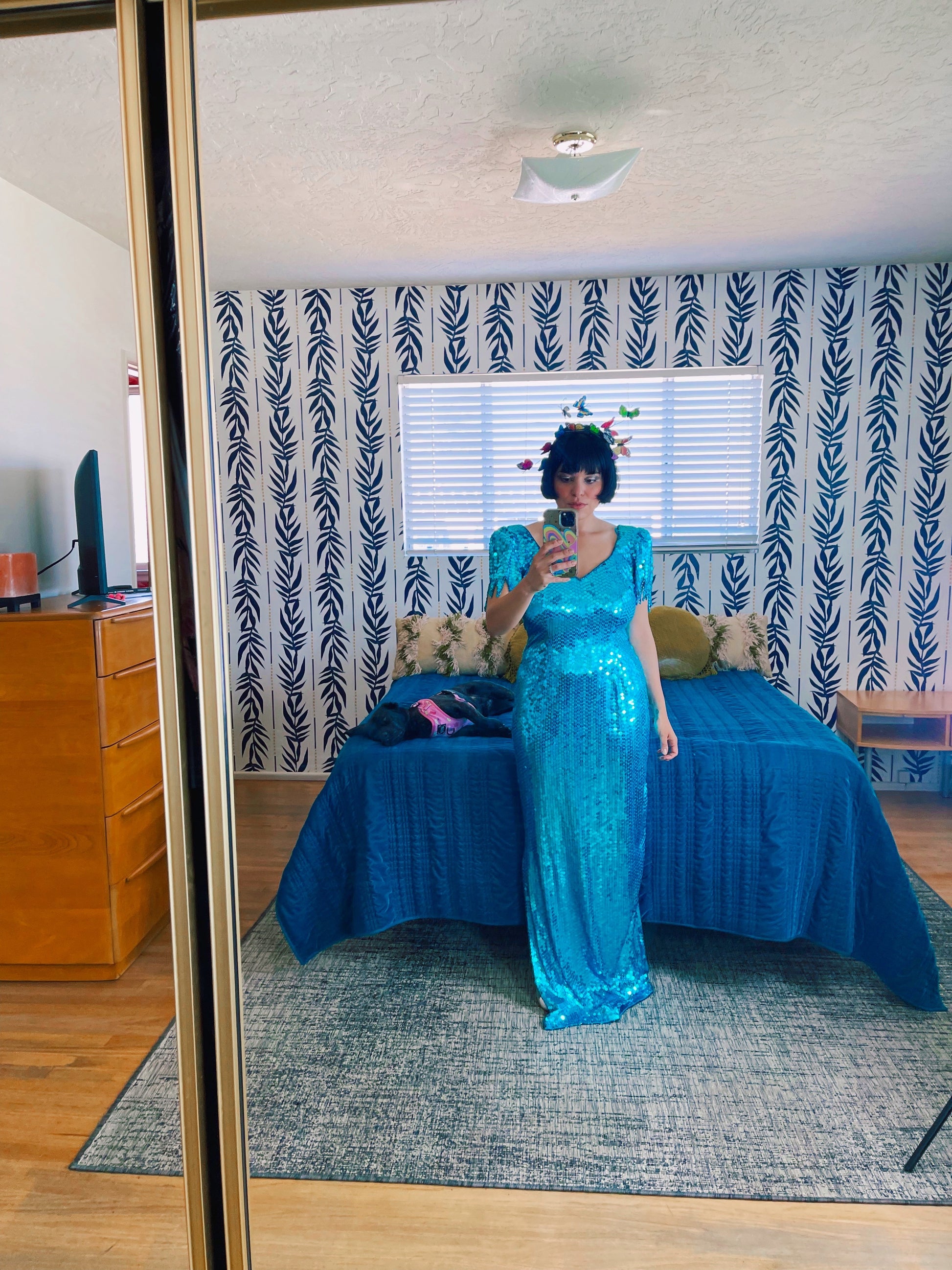 Vintage 80s Ted Lapidus Paris Avant Garde Teal Blue Sequins Stretchy Gown Fits Sizes S-M.