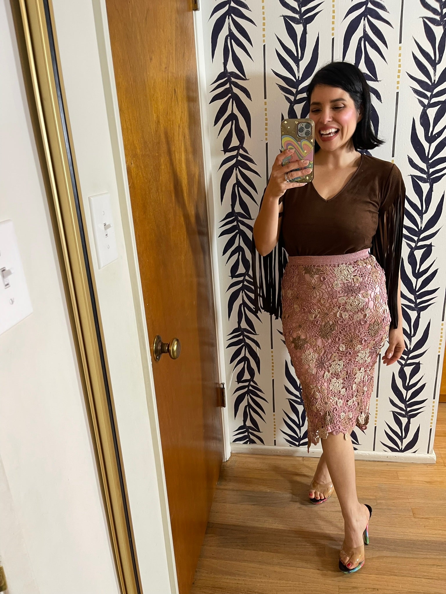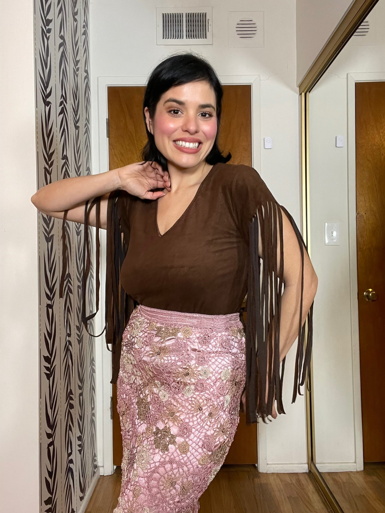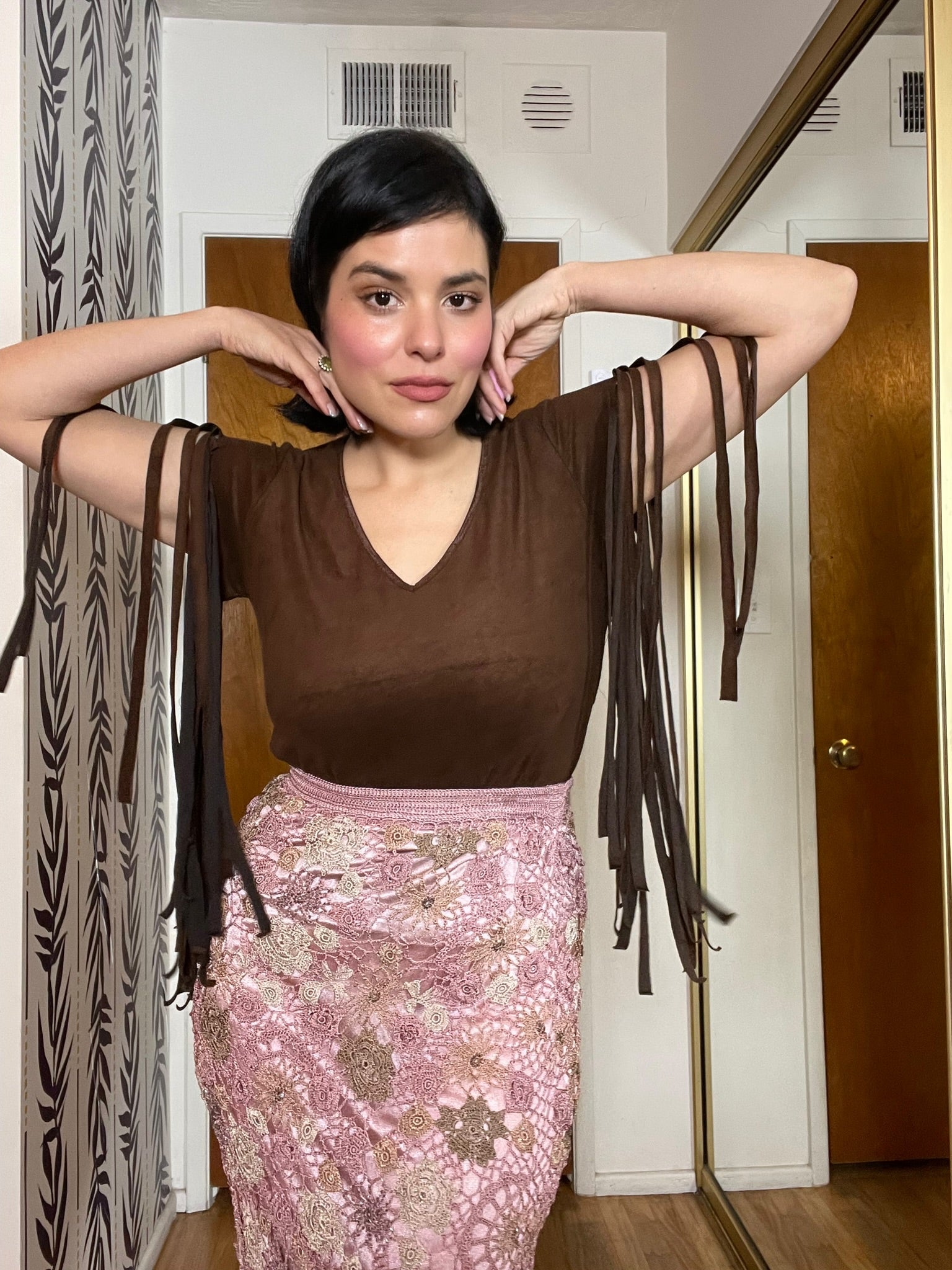 Top Features: Faux Suede Material / Has Some Stretch / Fringe Sleeves / Raw Hemline