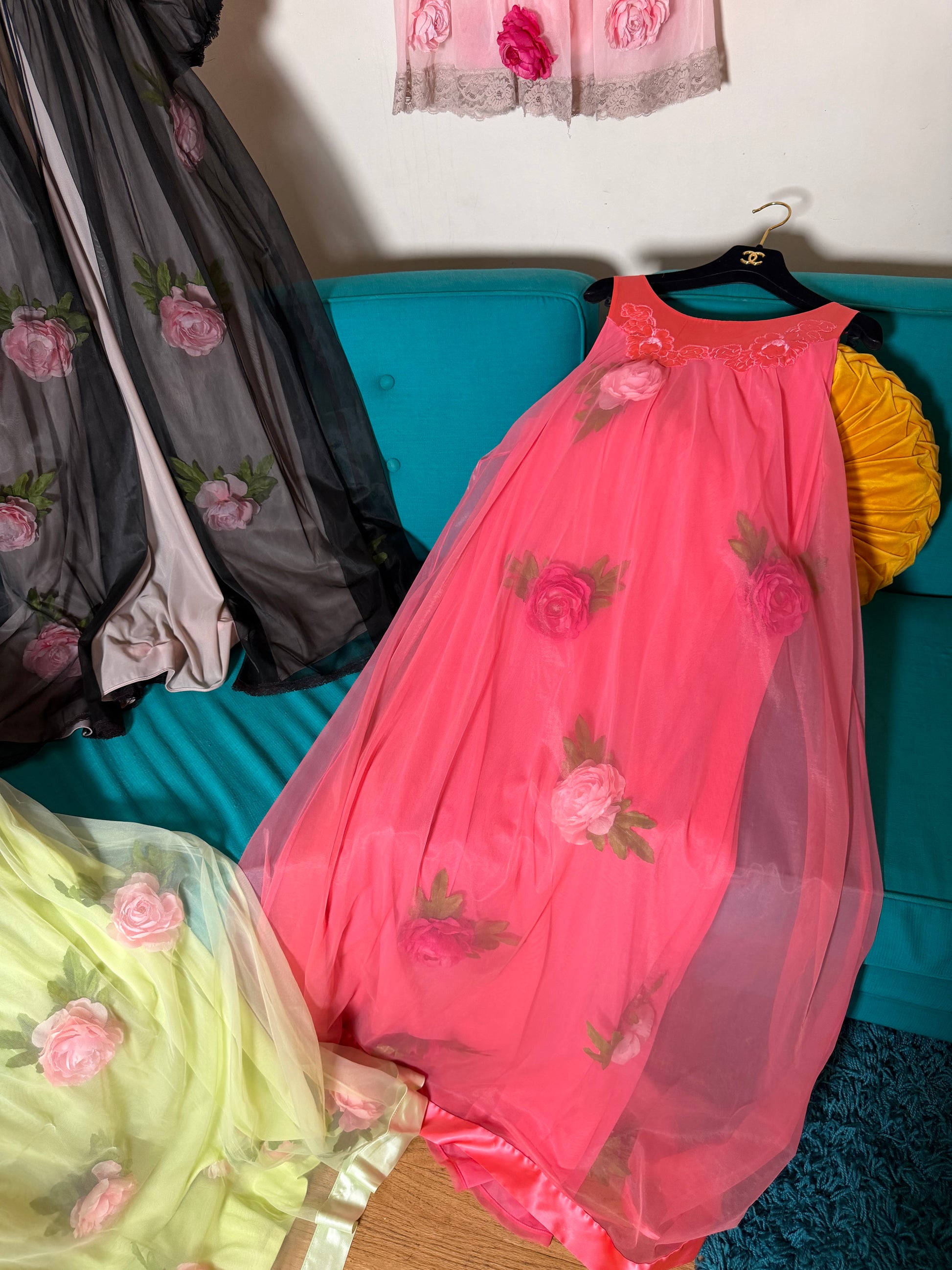 Vintage Custom 60s 70s Salmon Pink Nylon Trapeze Slip Dress with 3-D Flowers Fits XS-L