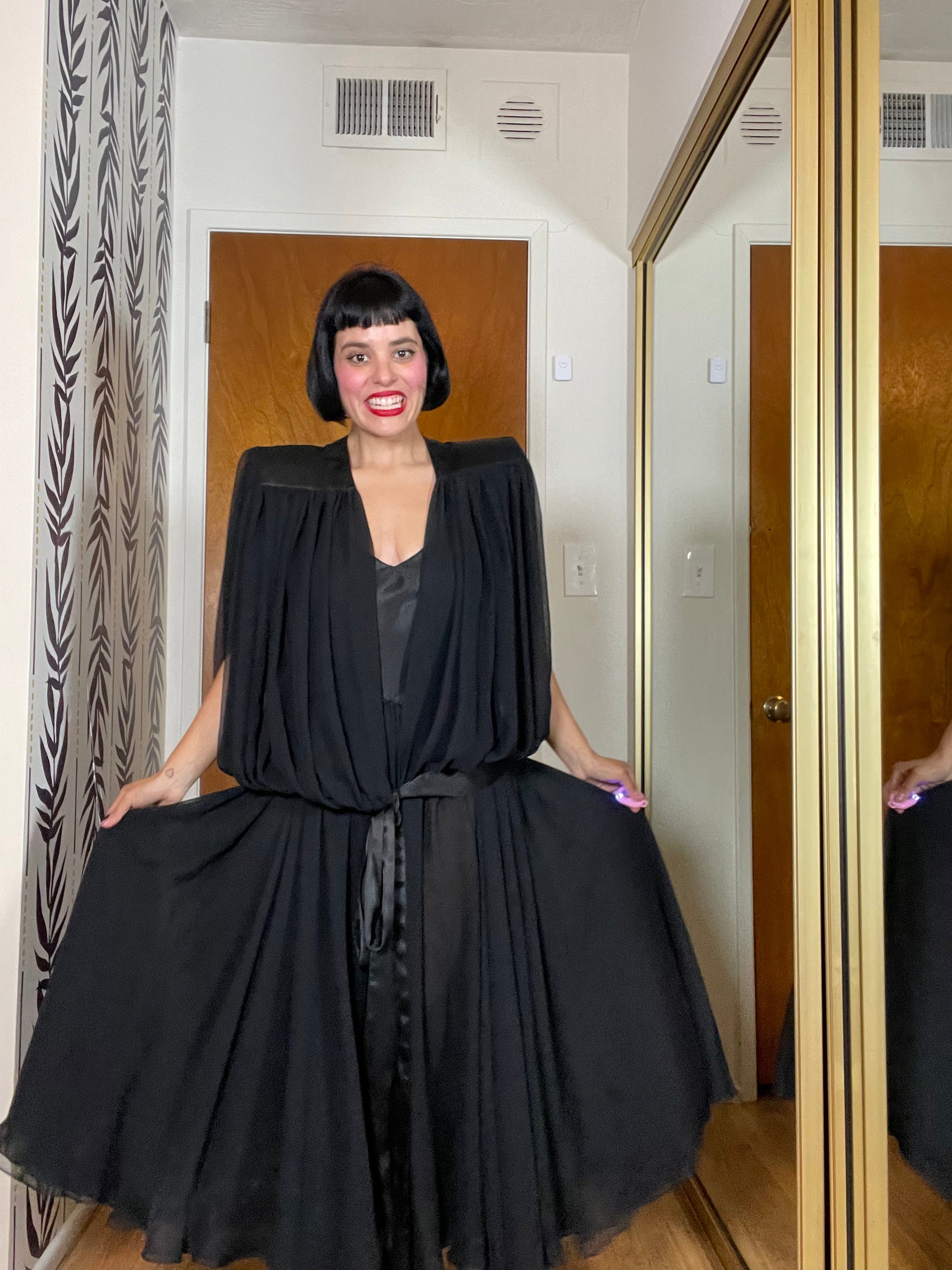 Dress Features: Side Zipper Closure / Silk Bodice / V Neck Line / Two Layered Silk Chiffon Skirt and Straps / Full Skirt / Solid Black Color / Drop Waist Silhouette / Inner Attached Waist Ties For Cinching / Best Fits Size M-L, Refer To Measurements