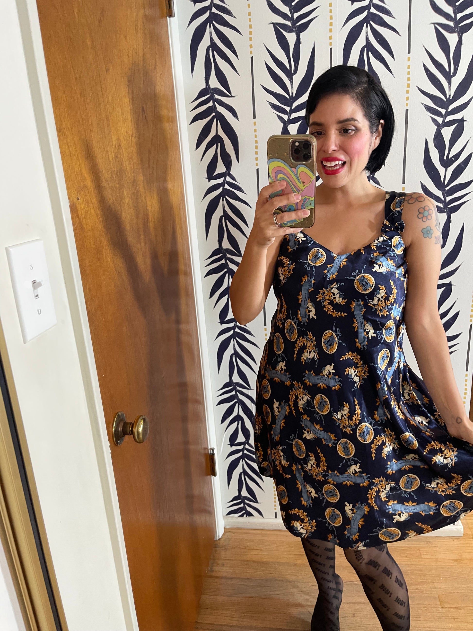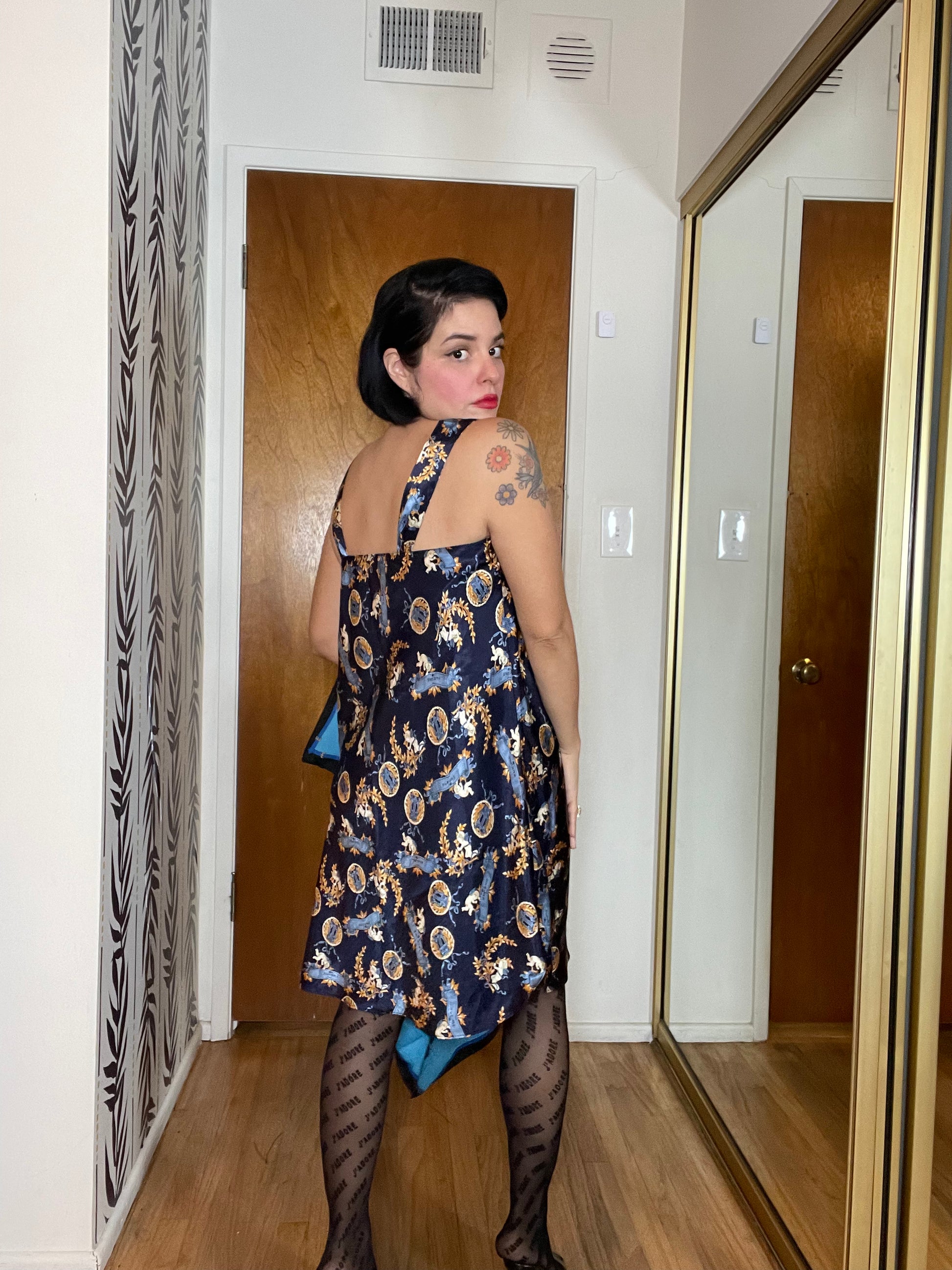 Vintage Y2K "Flanniel" Cherub Angel Print Satin Silk Shift Dress Best Fits Size S-M