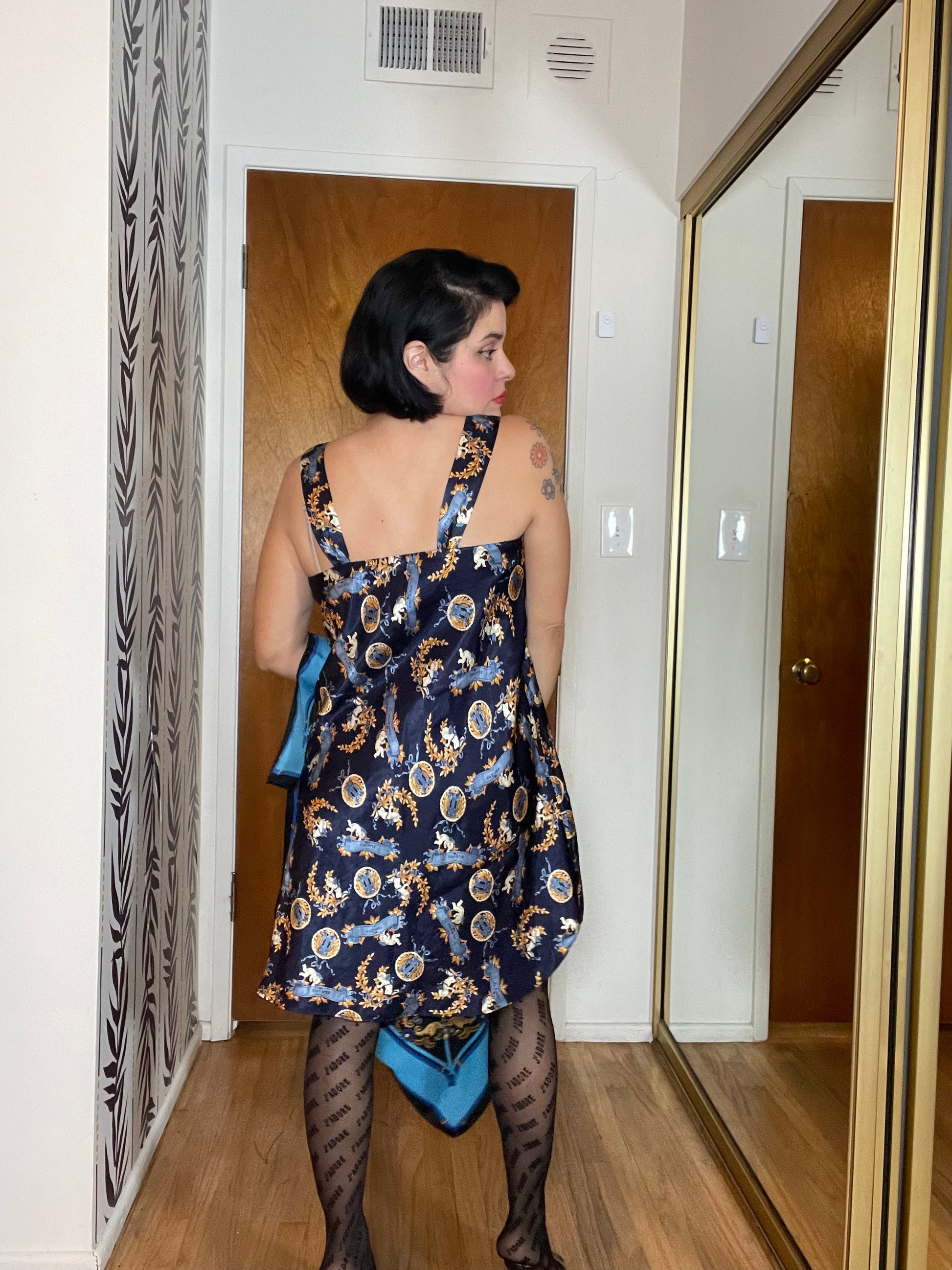 Features: Cherub Angel Print Fabric / Shift Style Silhouette / Front Bow Details On Straps / Wide Straps / Satin Silk Blend mAterial / Navy Blue and Gold Colors / Best Fits Size S-M, Refer To Measurements