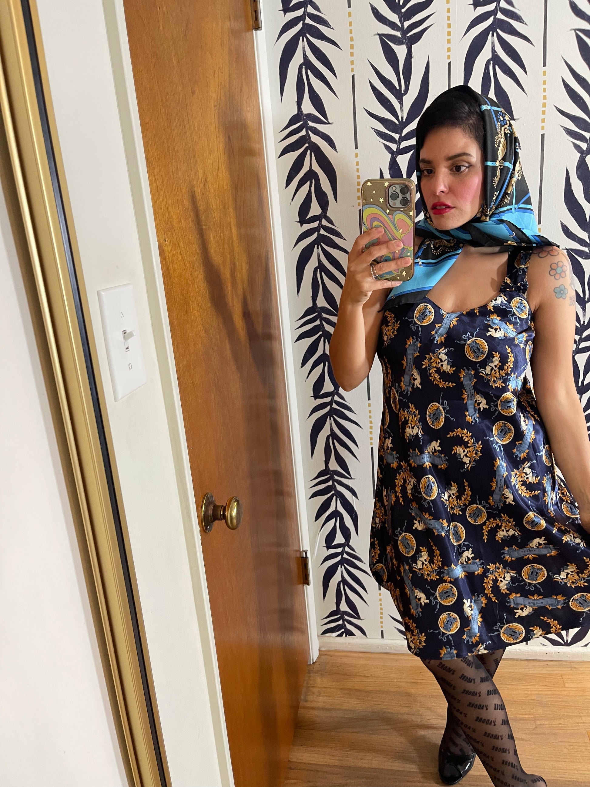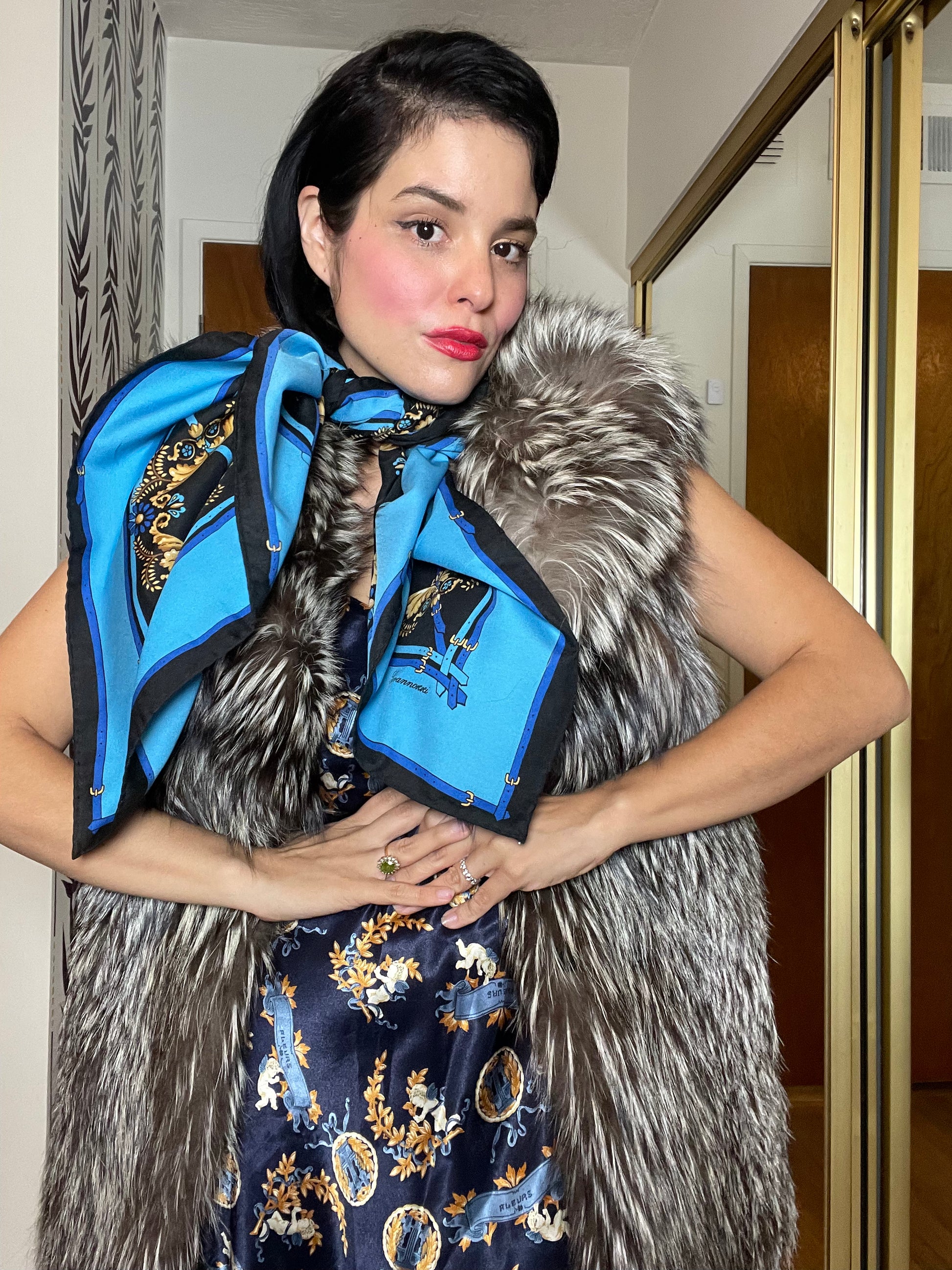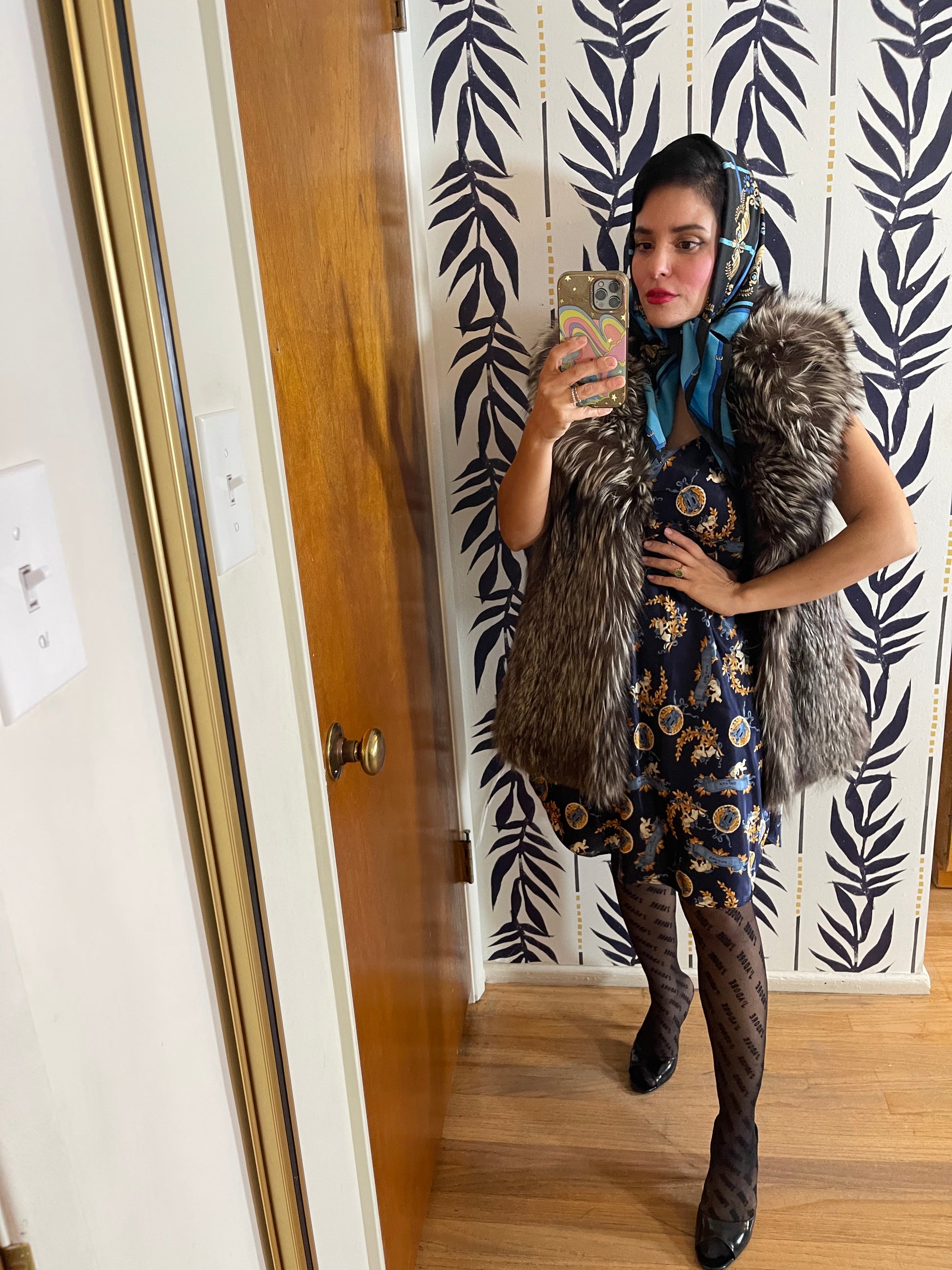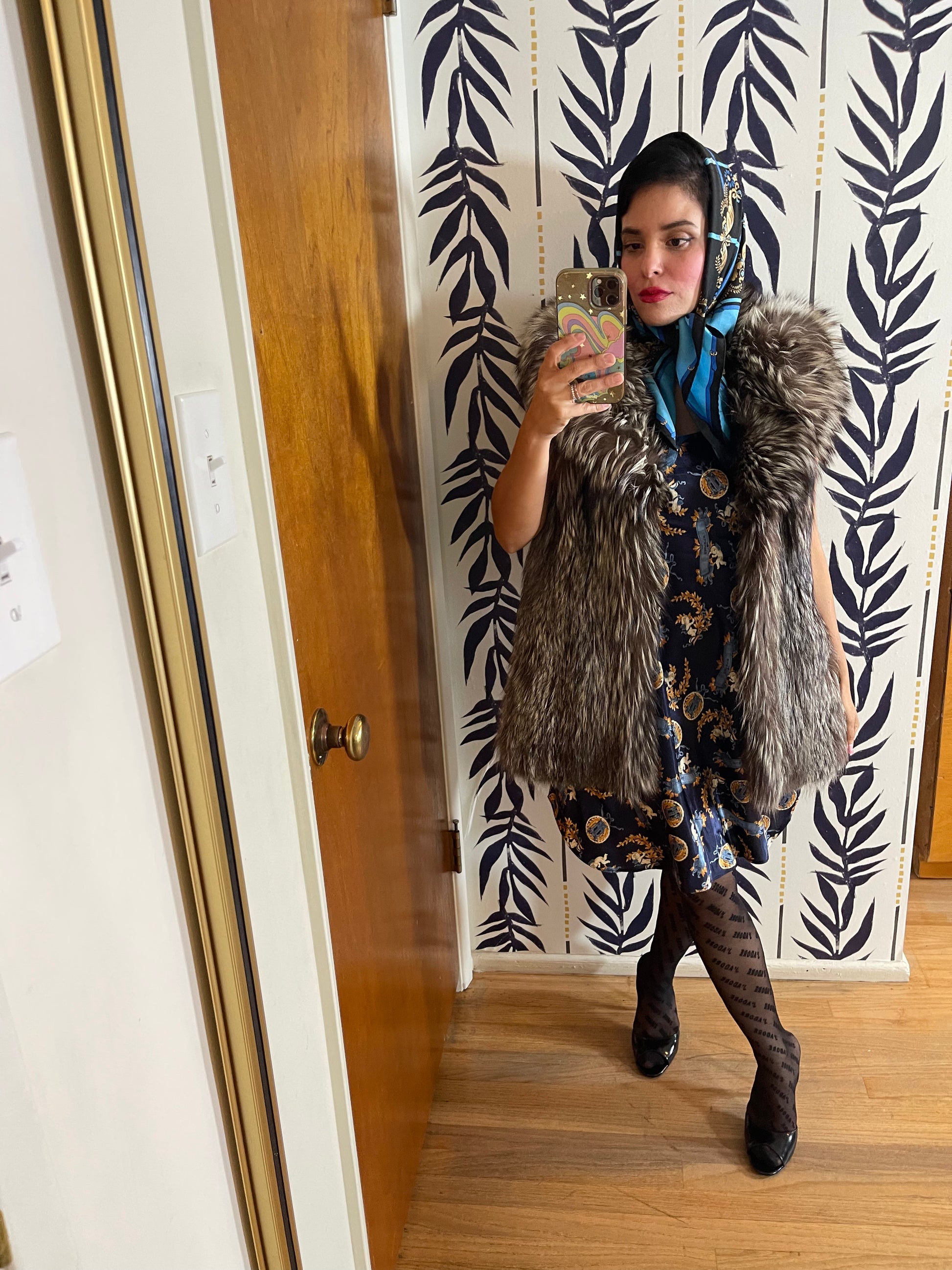 Styling: Vintage Robert Rayne Vest, Vintage Novelty Print Scarf, Black Tights